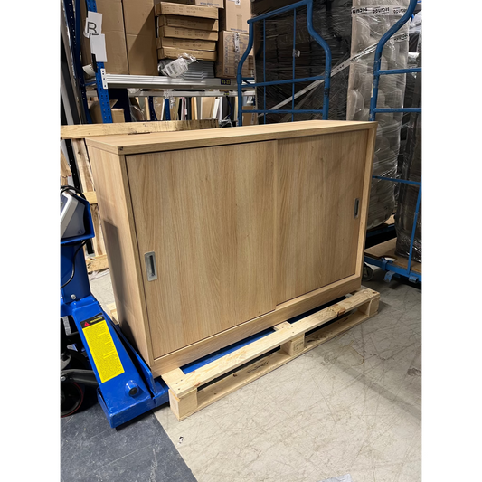 Skap i eik fra AJ Produkter, skyvedører m/håndtak, 1 hylle, sokkel, H868 B1200 D400 mm