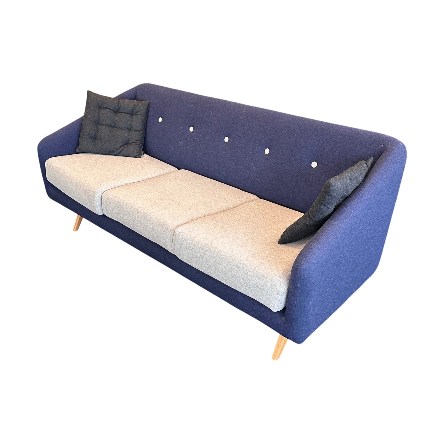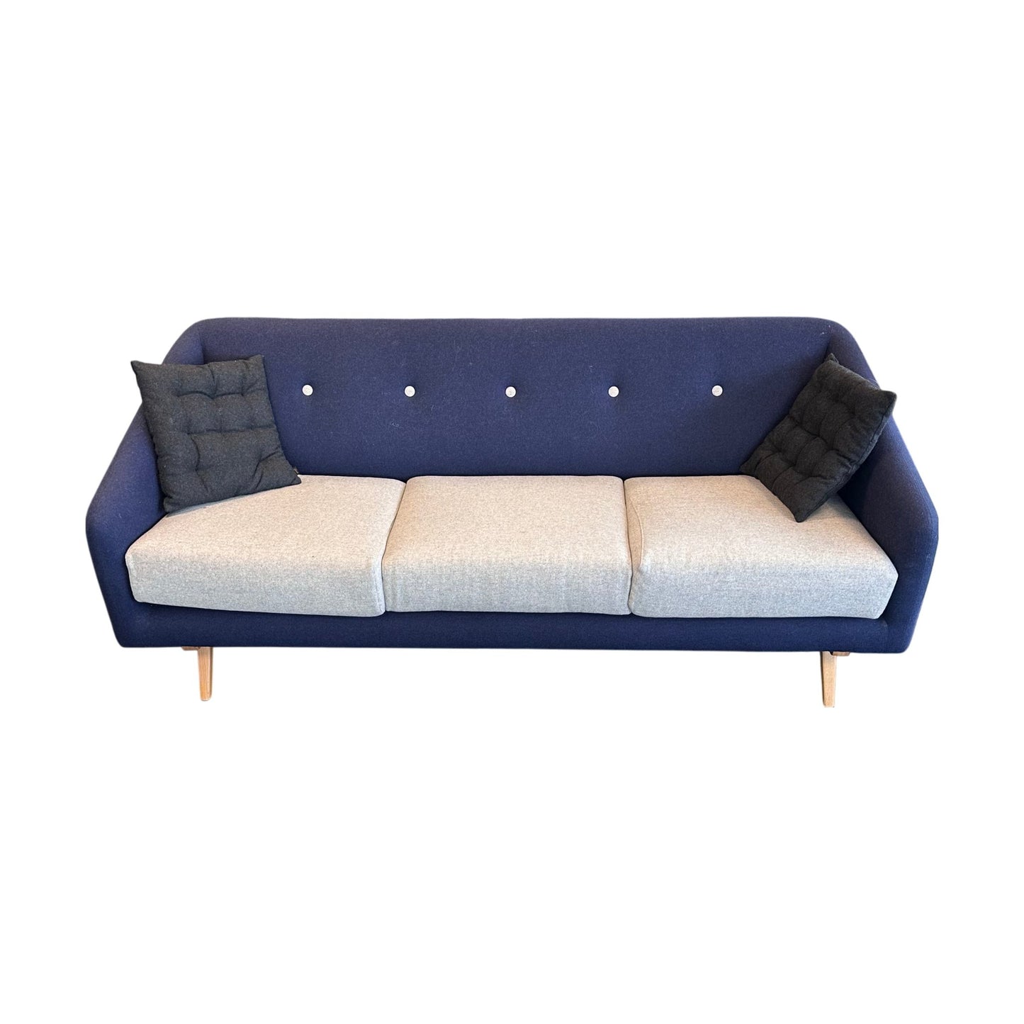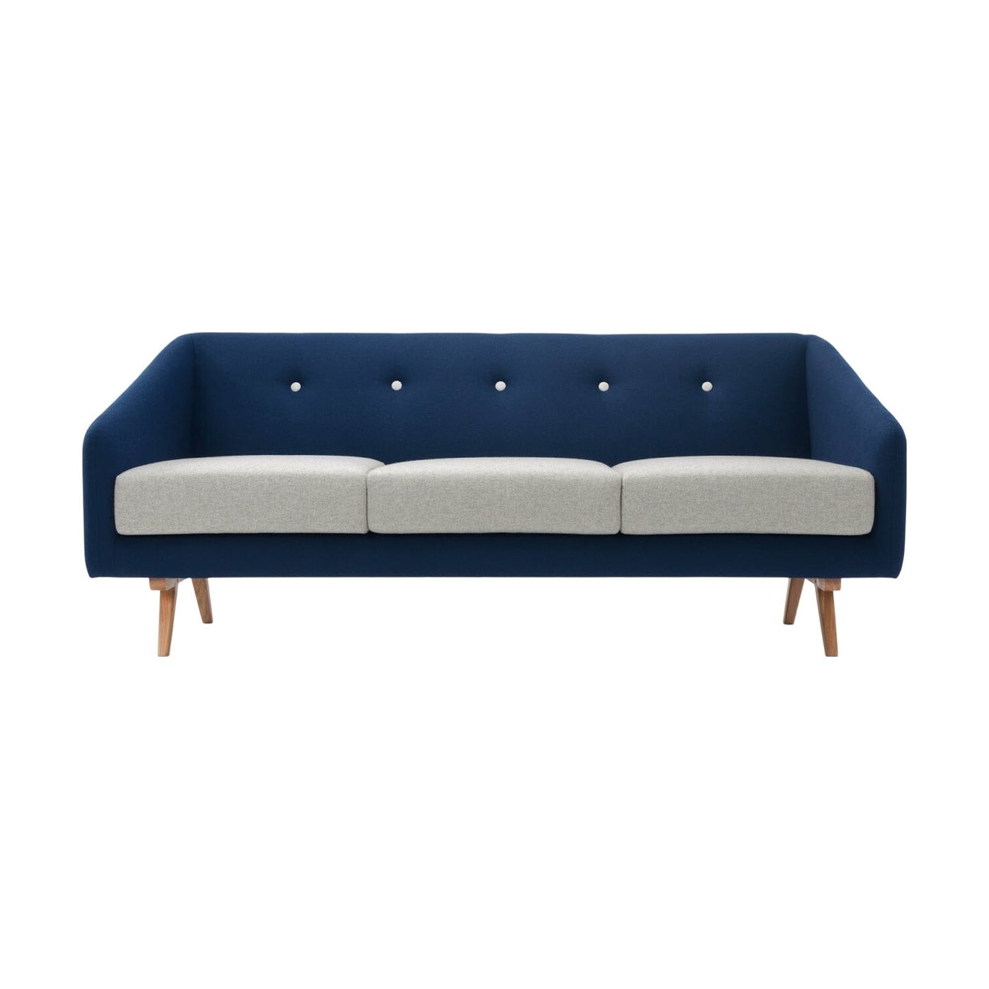 Stilig og moderne 3-seter sofa i en dyp mørk blå farge, som tilfører et lekkert preg til ethvert rom. Sofaen har et elegant design med myke, grå sitteputer som gir en hyggelig kontrast til den mørkeblå stoffoverflaten. De dekorative knappene på ryggputen gir et unikt visuell detalj som hever sofaens stil. Sofaen har slanke, naturlige eikeben som løfter designet og bidrar til en luftig følelse i stuen. Den perfekte sofaen for både avslapning og sosialt samvær.