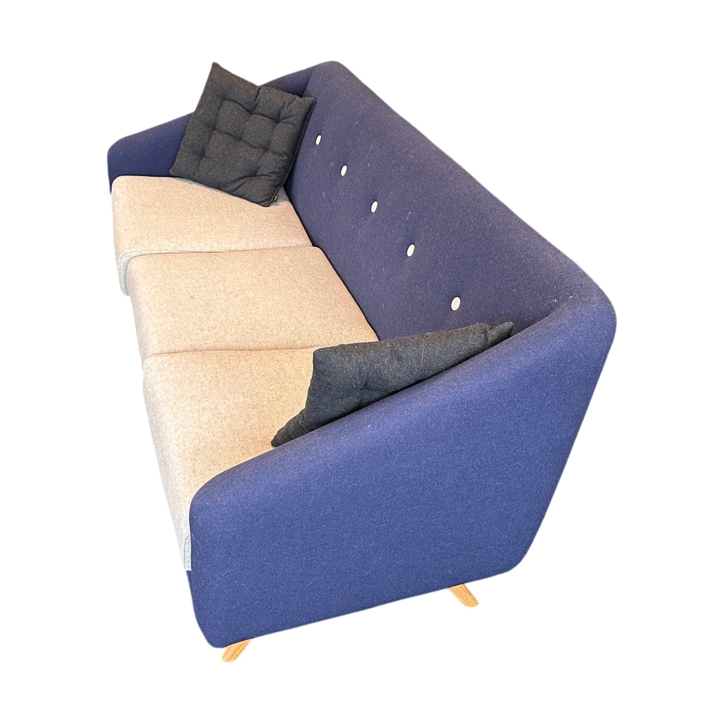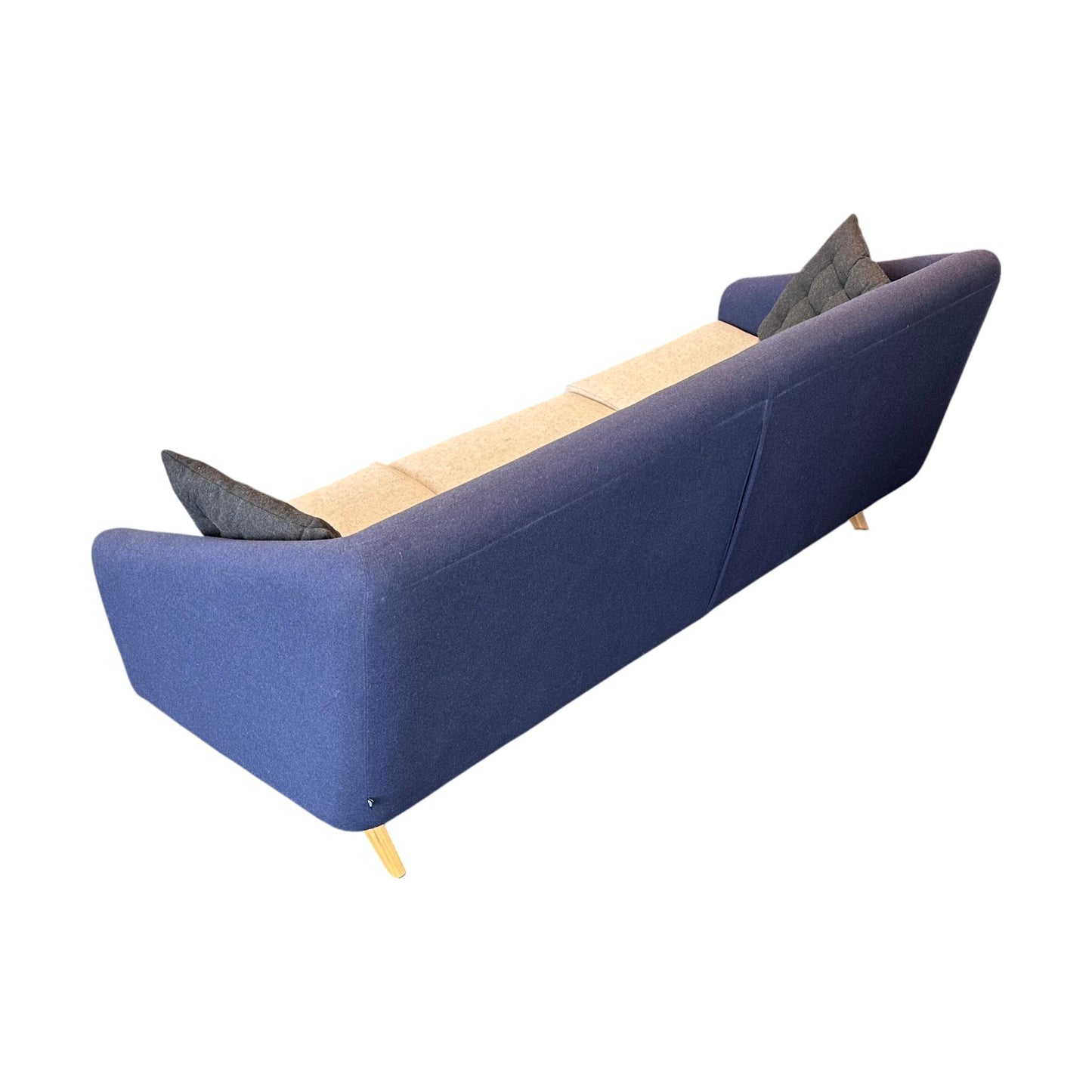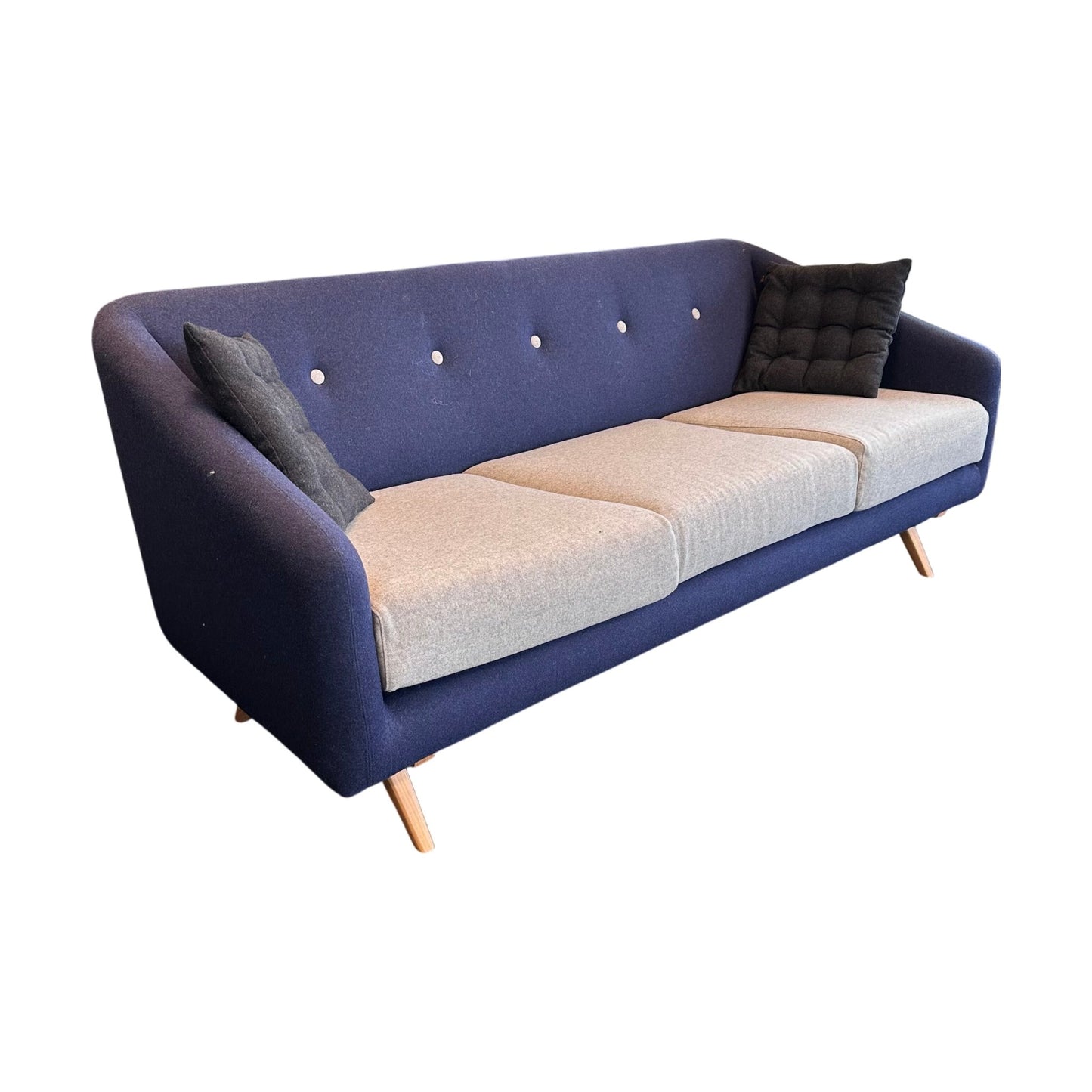 Stilig og moderne 3-seter sofa i en dyp mørk blå farge, som tilfører et lekkert preg til ethvert rom. Sofaen har et elegant design med myke, grå sitteputer som gir en hyggelig kontrast til den mørkeblå stoffoverflaten. De dekorative knappene på ryggputen gir et unikt visuell detalj som hever sofaens stil. Sofaen har slanke, naturlige eikeben som løfter designet og bidrar til en luftig følelse i stuen. Den perfekte sofaen for både avslapning og sosialt samvær.