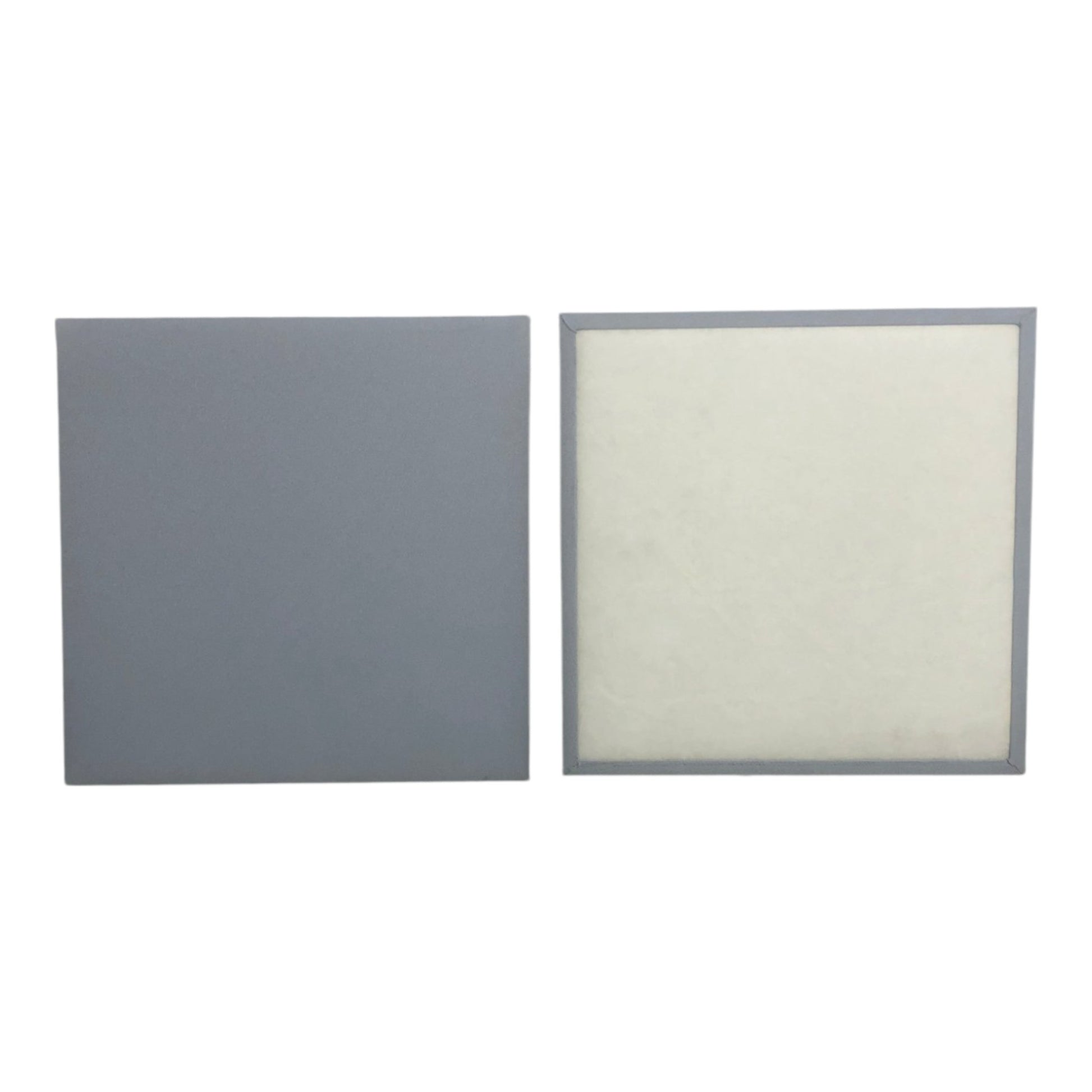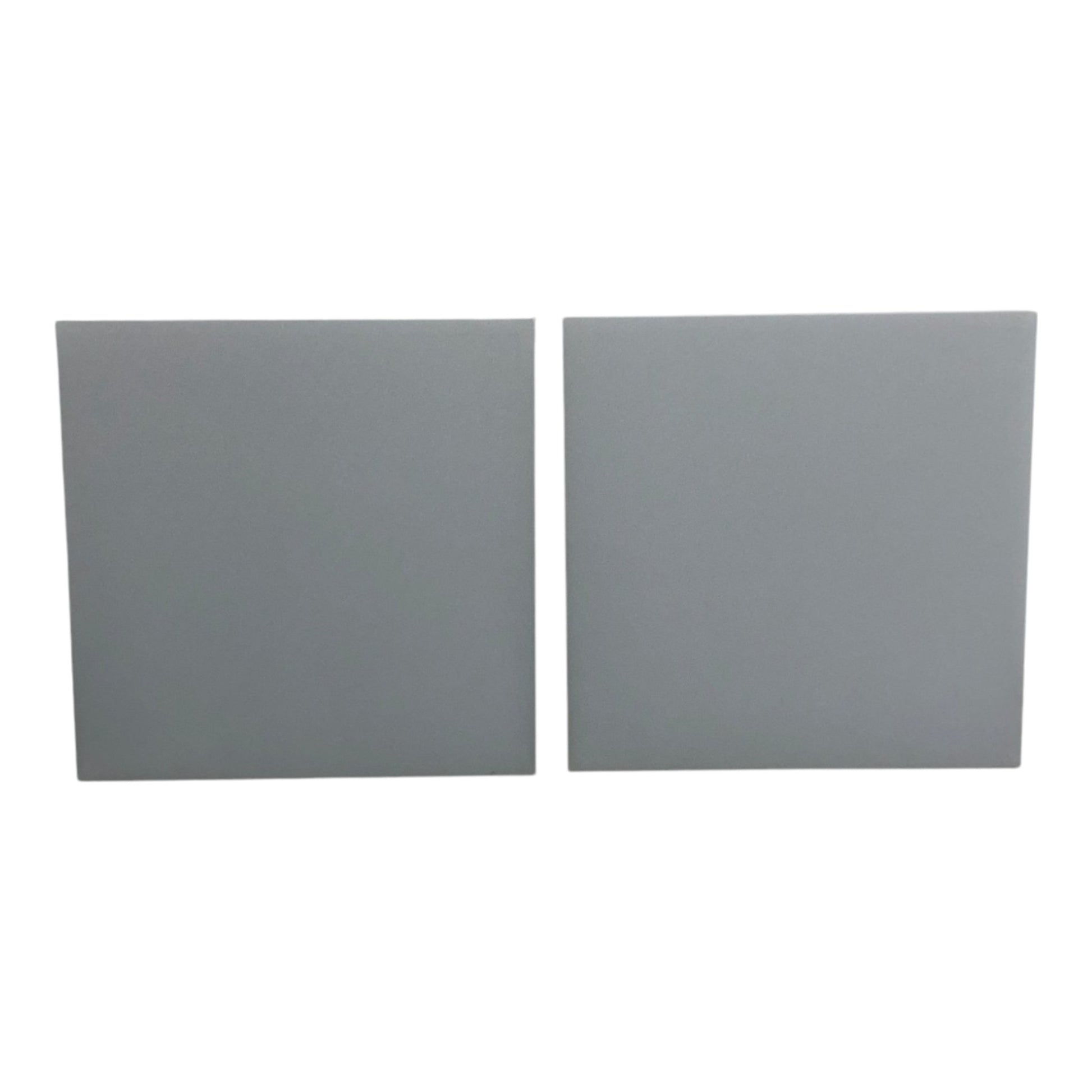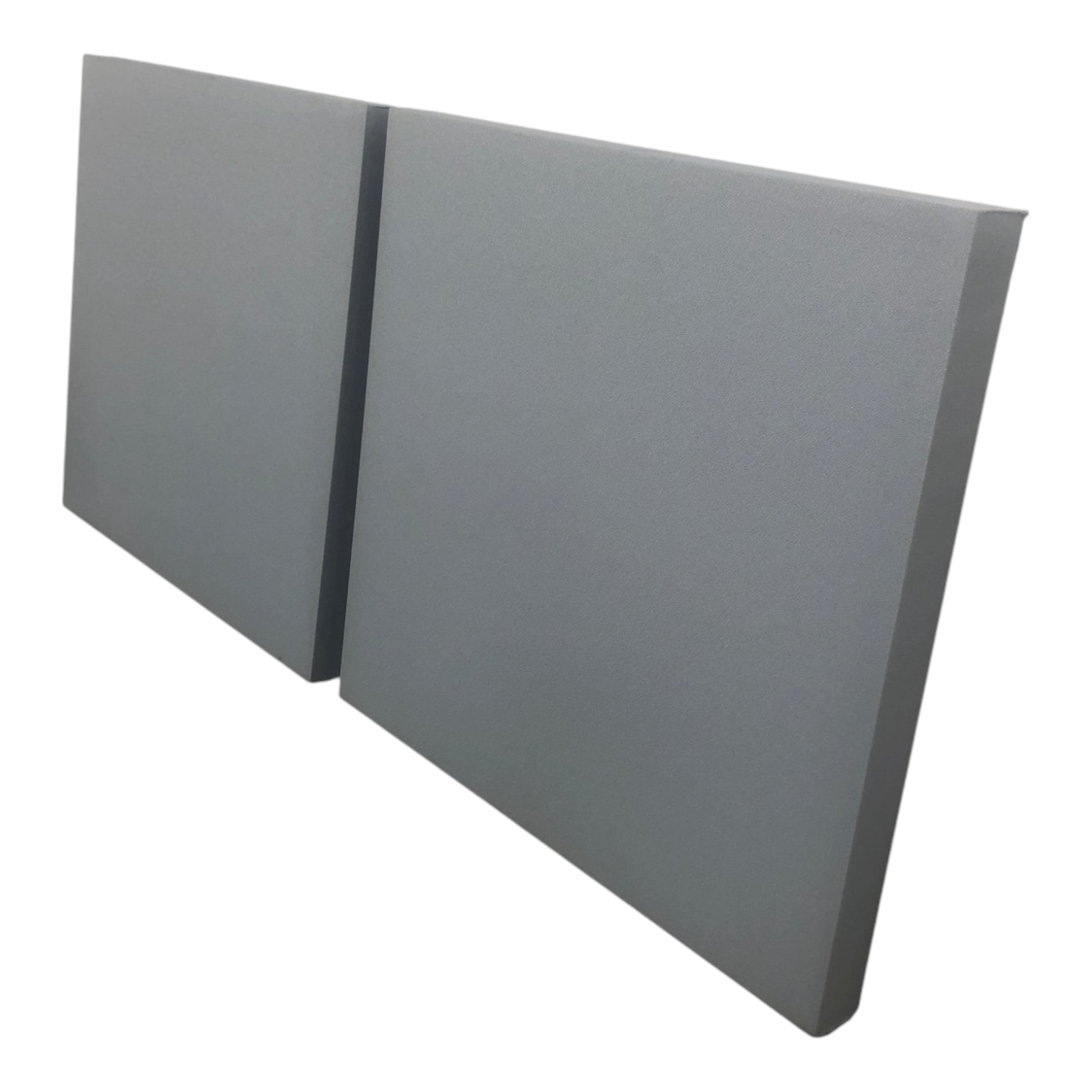 To lysegrå akustikkplater, ideelle for å dempe lyd i kontor- eller hjemmemiljøer. Platene er kompakte og lettplasserte for effektiv støydemping.