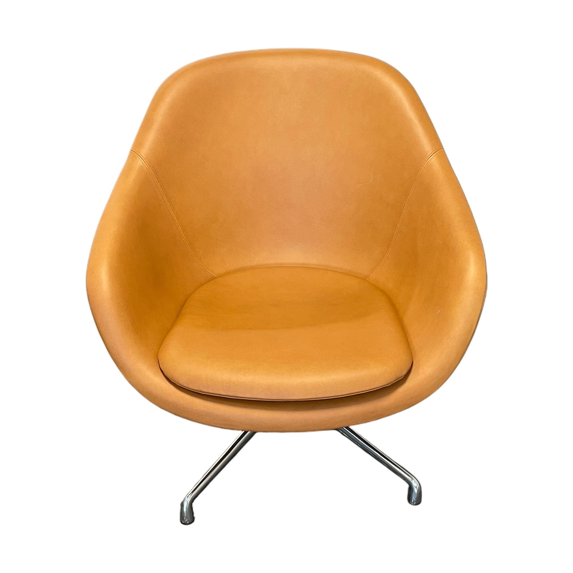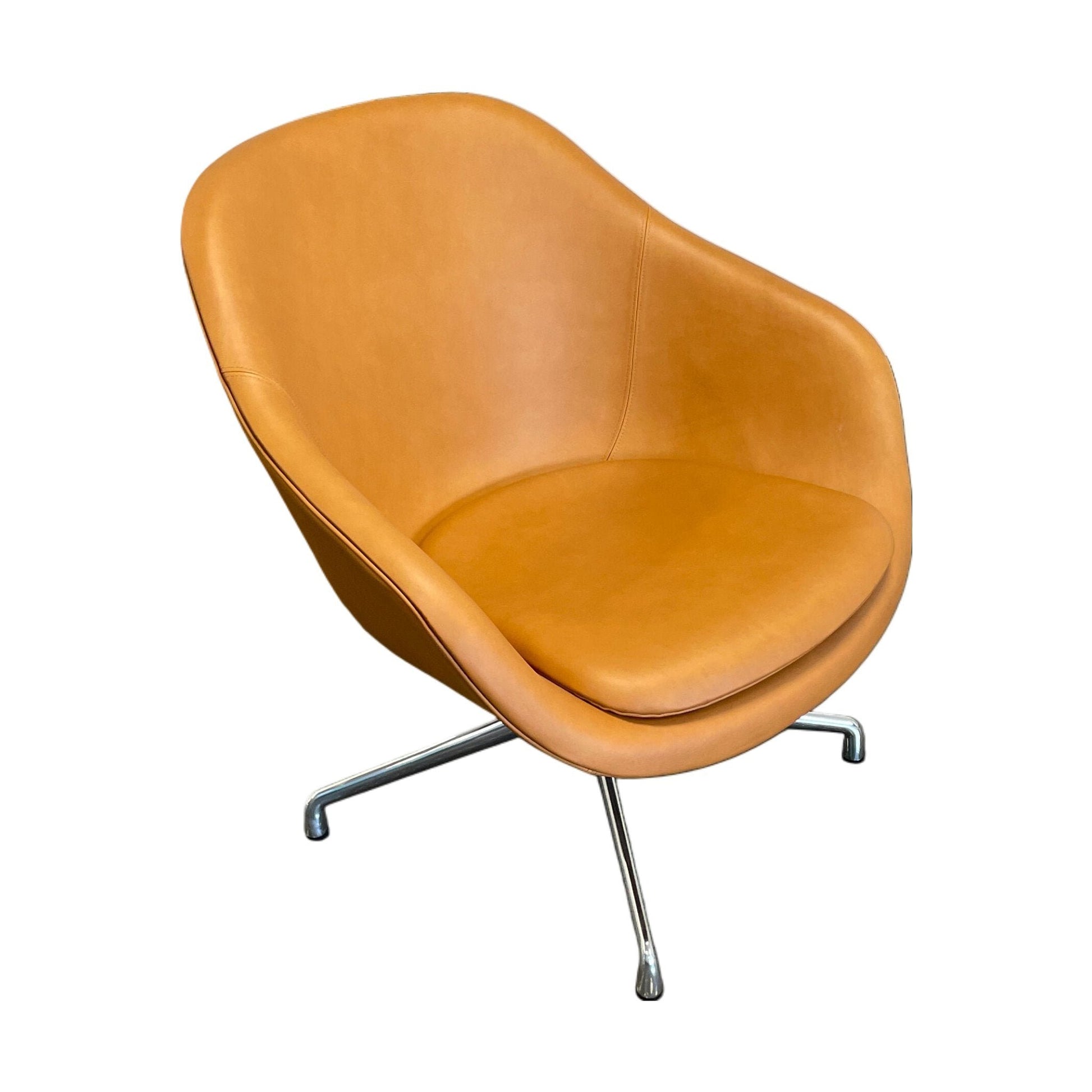 Moderne og stilren loungestol i cognacfarge fra HAY, perfekt for kontorområder eller lounge. Stolens organiske form og komfortable sete gir et innbydende og behagelig sittemiljø, ideelt for både arbeid og avslapning. Den myke, lysebrune huden og det enkle, stilrene designet gir et elegant preg til ethvert rom.