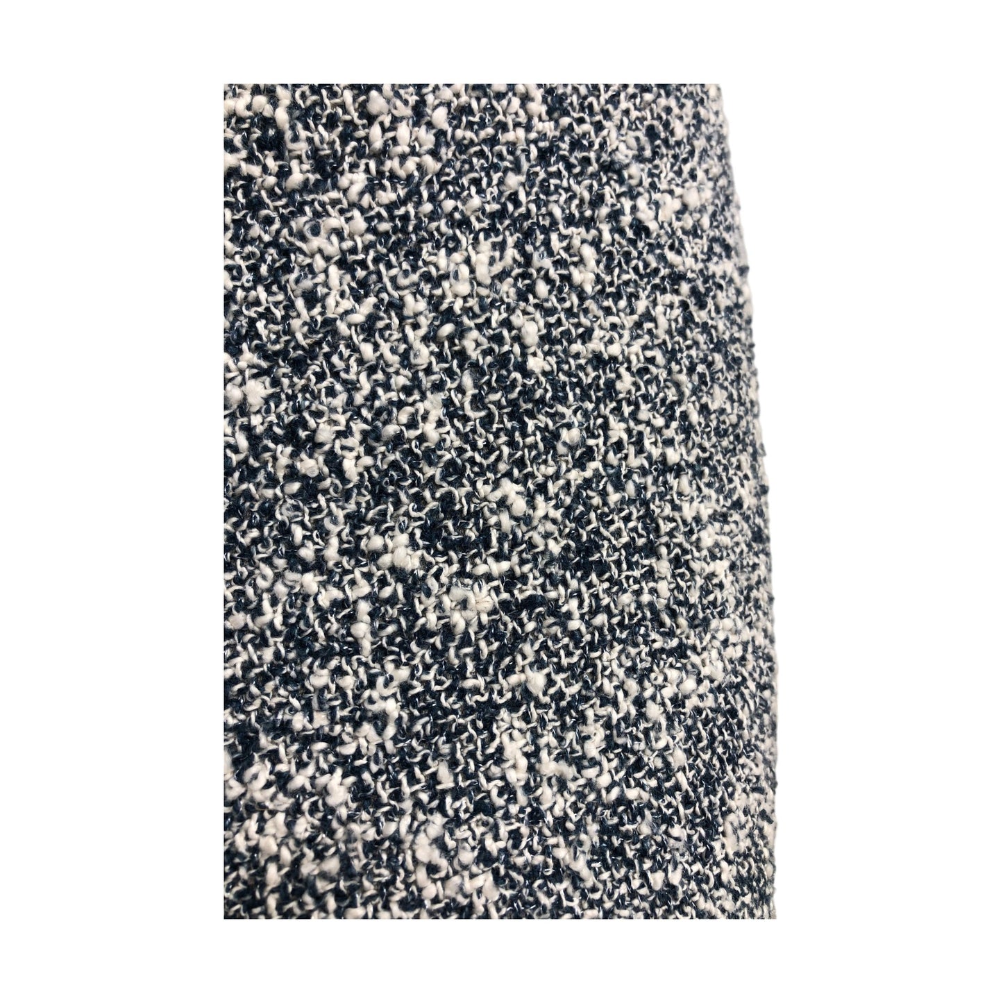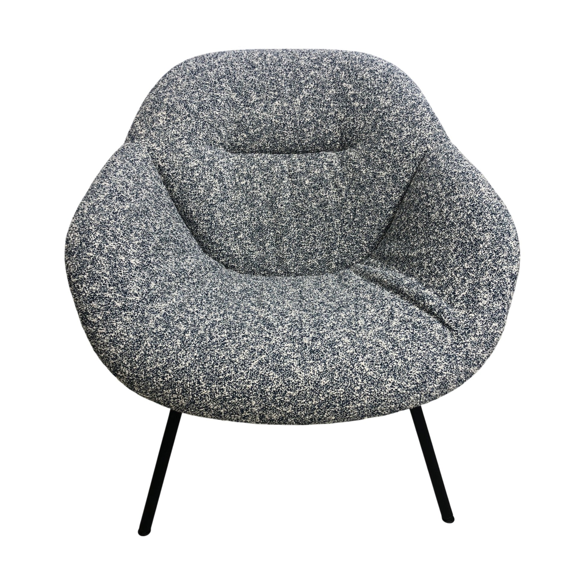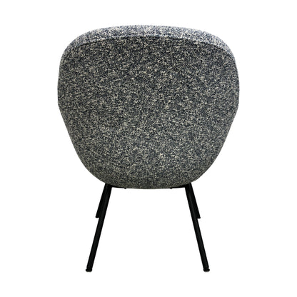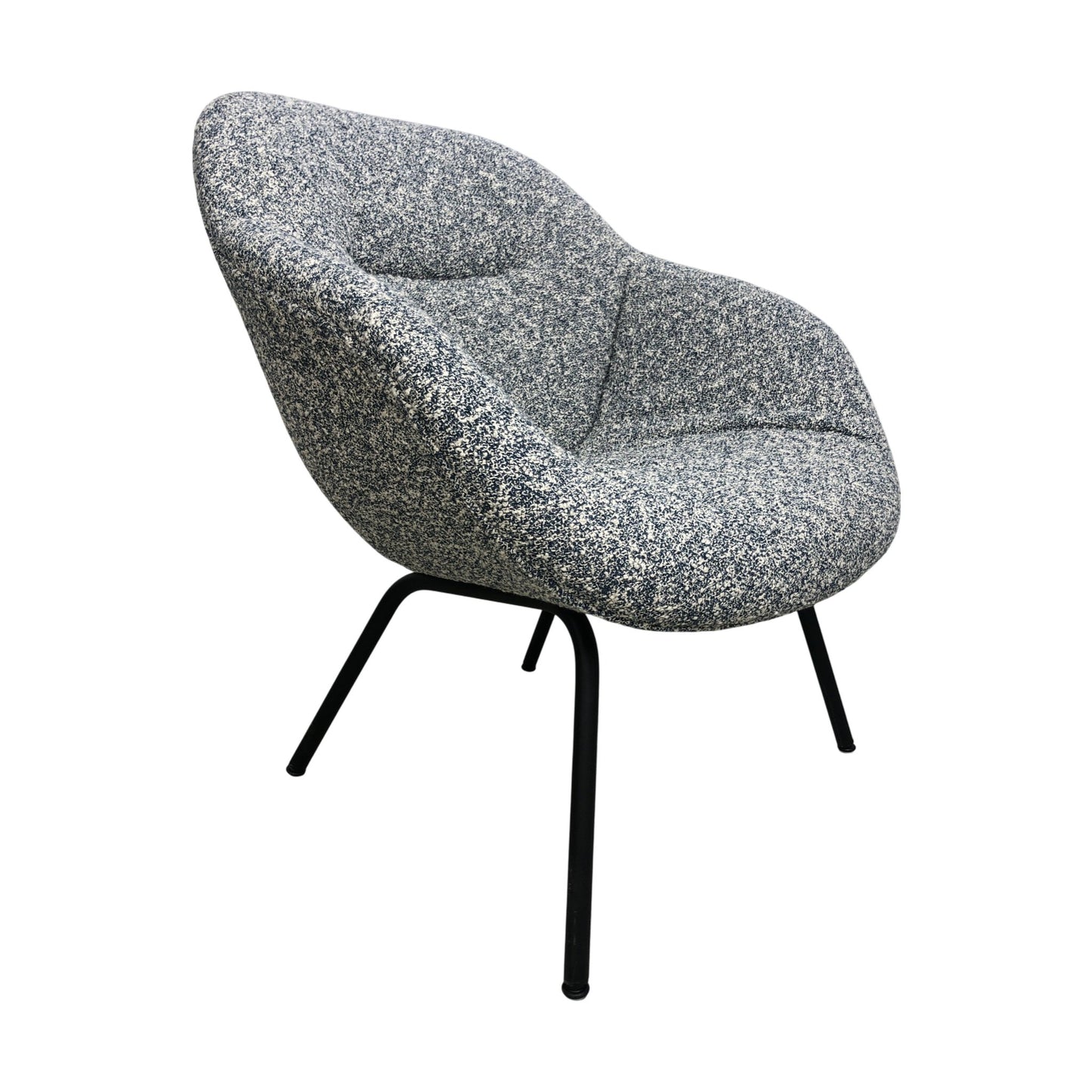 Grå lenestol med et moderne design fra HAY som kombinerer stil med komfort. Den melerte tekstilen, laget med hvit og blå tråd, gir stolen et unikt preg, mens de sorte metallbenene sørger for stabilitet og eleganse.