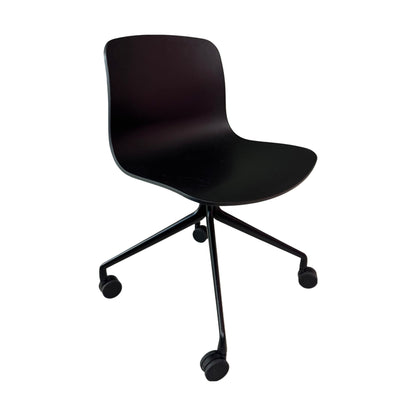 Møteromsstol fra HAY med et moderne og stilrent design. Stolen har et sete og rygg i slitesterkt svart plast, som gir et minimalistisk utseende perfekt for både møterom og kontorer. Det praktiske designet med hjul gjør det enkelt å flytte stolen rundt etter behov, noe som øker fleksibiliteten i bruken.