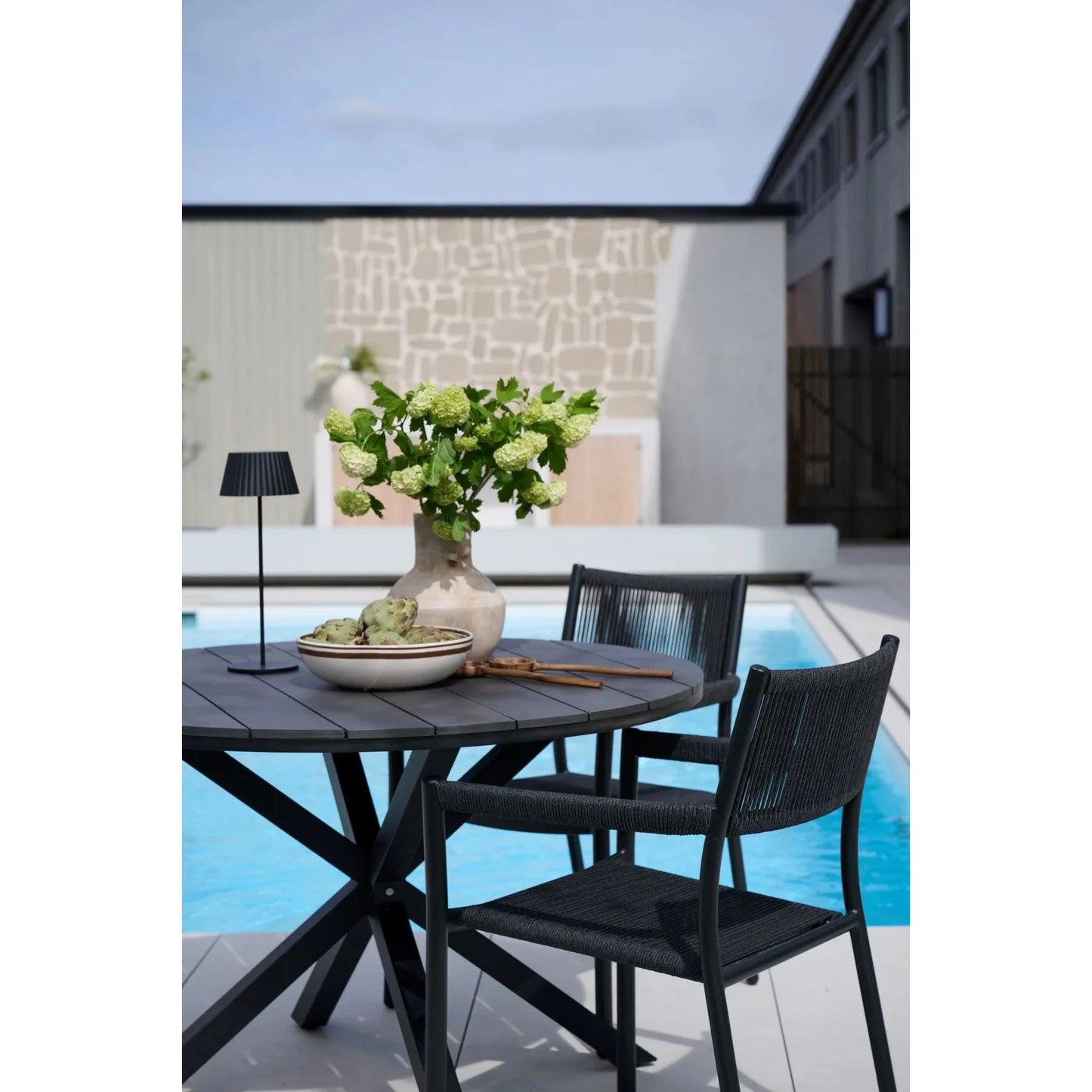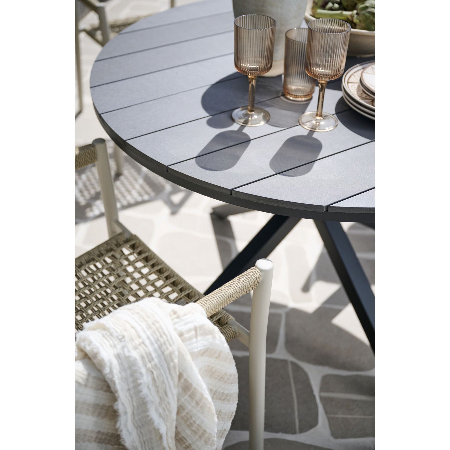 Adriana hagebord har et solid og stilrent design, perfekt for utendørs bruk. Med ben i aluminium og bordplate av polywood, gir dette bordet et moderne preg som passer godt inn i enhver hage eller terrasse.
