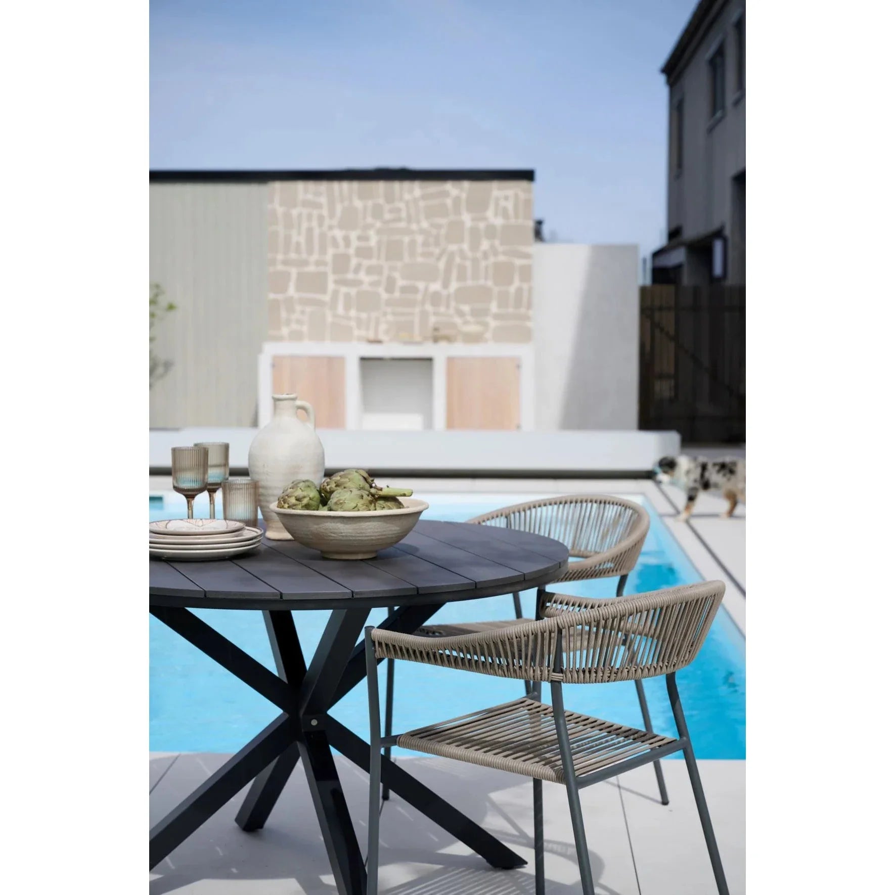 Adriana hagebord har et solid og stilrent design, perfekt for utendørs bruk. Med ben i aluminium og bordplate av polywood, gir dette bordet et moderne preg som passer godt inn i enhver hage eller terrasse.
