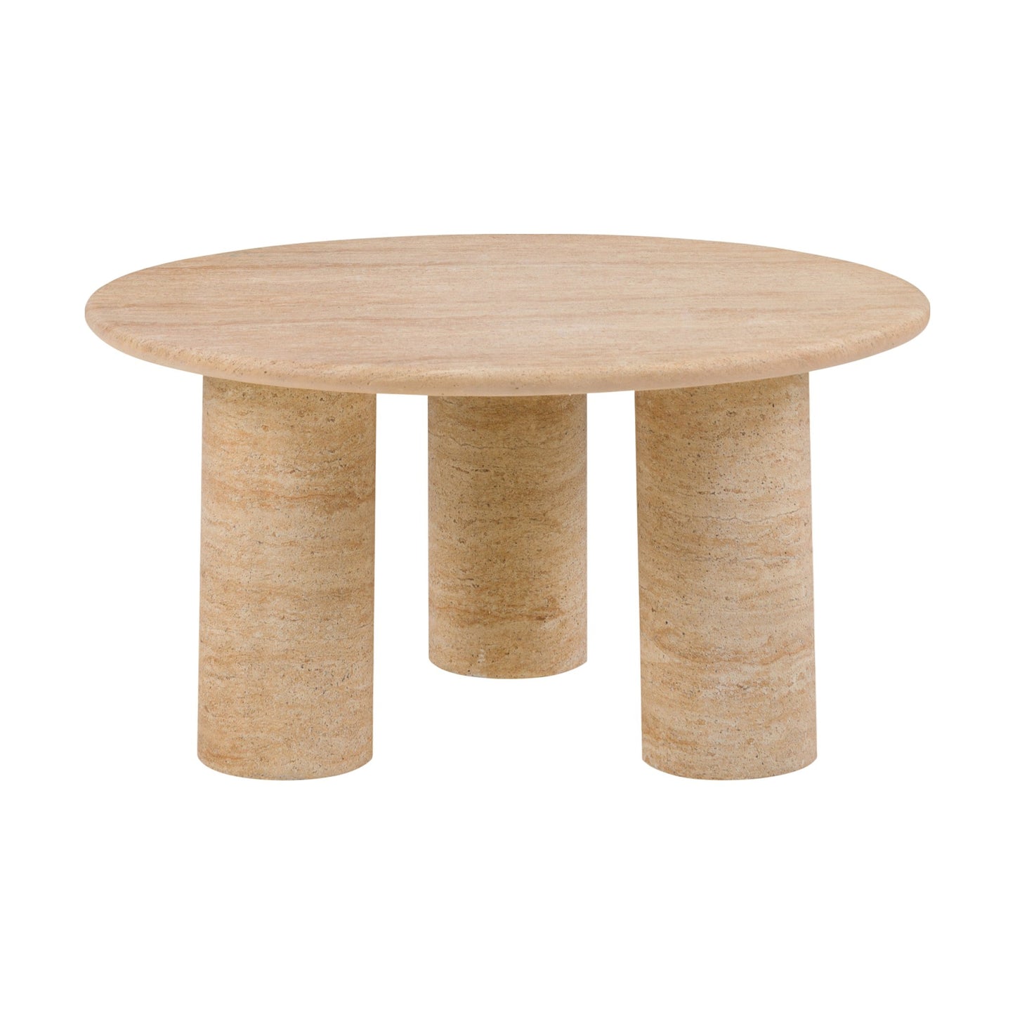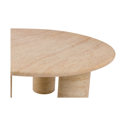 Moderne rundt sofabord fra A-Møbler med en diameter på 80 cm. Bordplaten har en stilren beige farge og en jevn tekstur, som gir et varmt og innbydende uttrykk. Det solide understellet består av tre karakteristiske søyler som ikke bare gir støtte, men også en unik estetikk som skiller seg ut i ethvert rom.