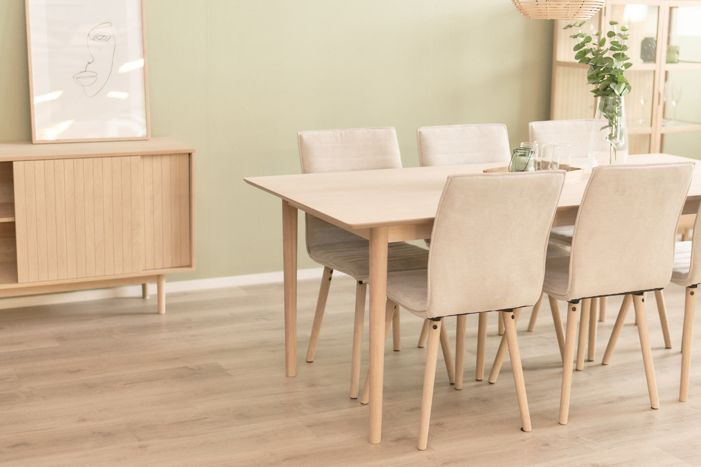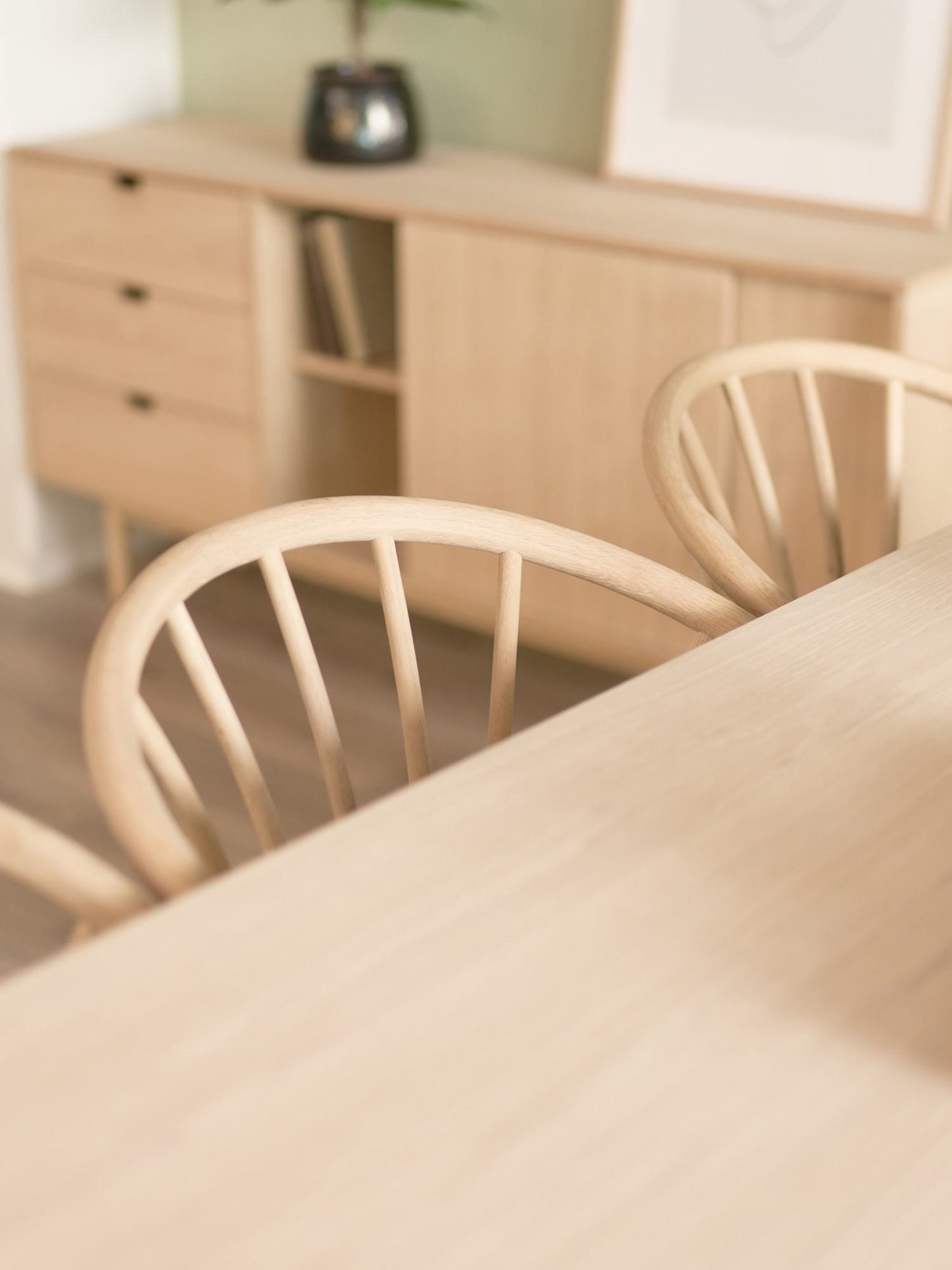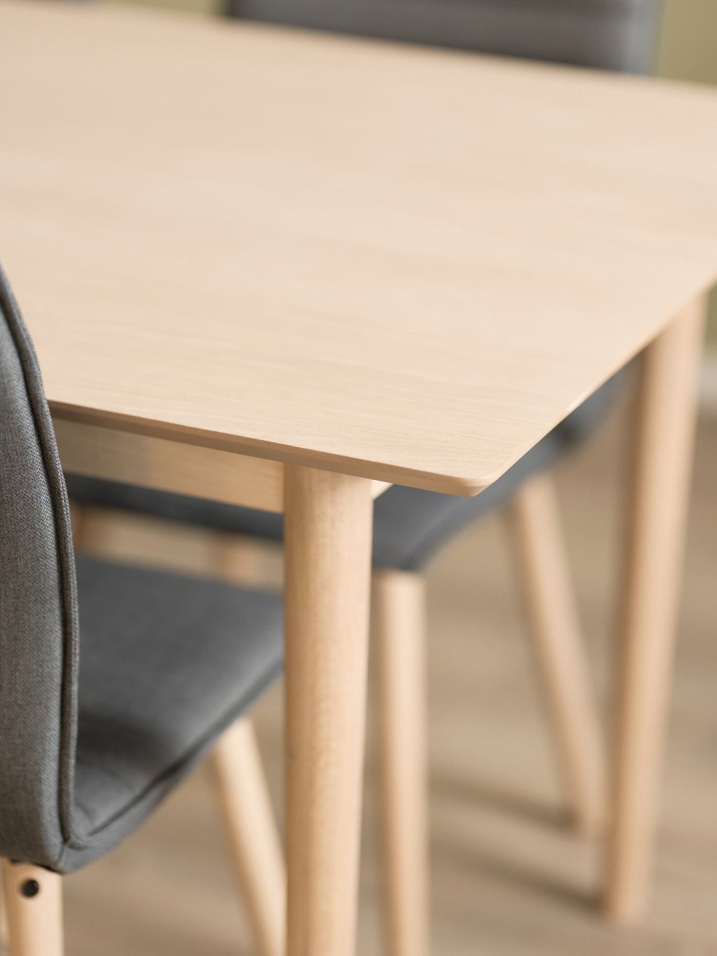 Amager spisebord fra A-Møbler i hvitoljet eikefinér er en perfekt løsning for alle anledninger. Designet med rette linjer og skrå bordkant gir en varm atmosfære og et moderne uttrykk, ideelt for samlinger med familie og venner.