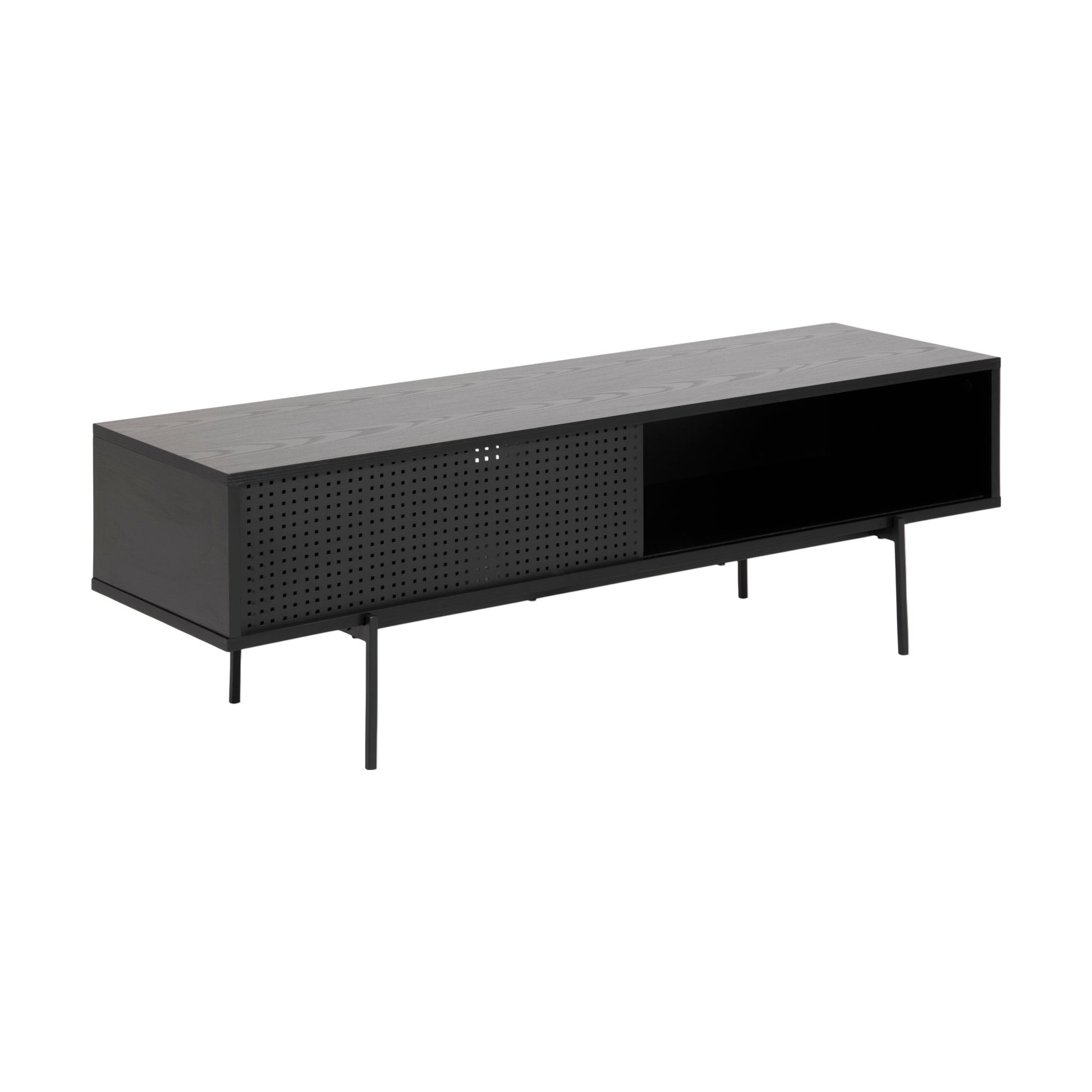Angus TV-benk fra A-Møbler er et praktisk og stilfullt valg for enhver stue. Med en plate i sort ask finer og et understell av pulverlakkert sort metall, gir denne benken et moderne og elegant uttrykk. Den romslige hyllen gir god mulighet for oppbevaring, og med en skyveplate i front kan du skjule innholdet, noe som skaper et ryddig og stilrent utseende.