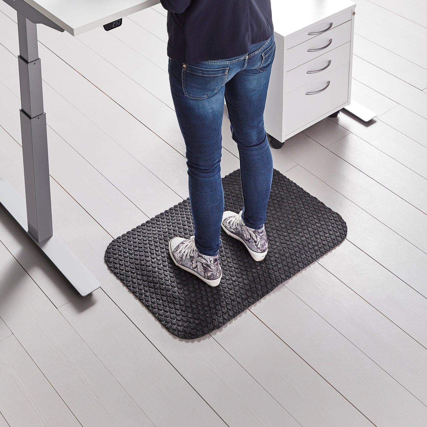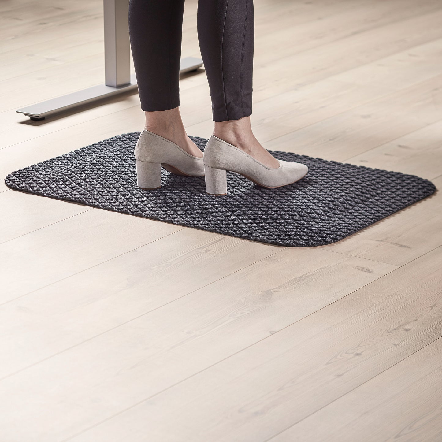 Ergonomisk ståmatte utviklet for å gi god komfort ved stående arbeid, for eksempel ved hev- og senkbare bord. Matten har skrå kanter for å hindre at noen snubler i den.