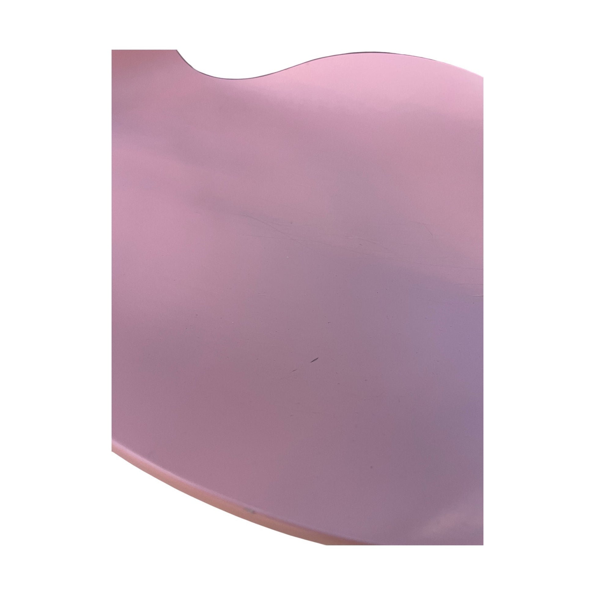 Spisestol med rosa plastsete og metallben. Den karakteristiske formen, design av Arne Jacobsen, gir en moderne touch, samtidig som den er praktisk og lett å vedlikeholde.