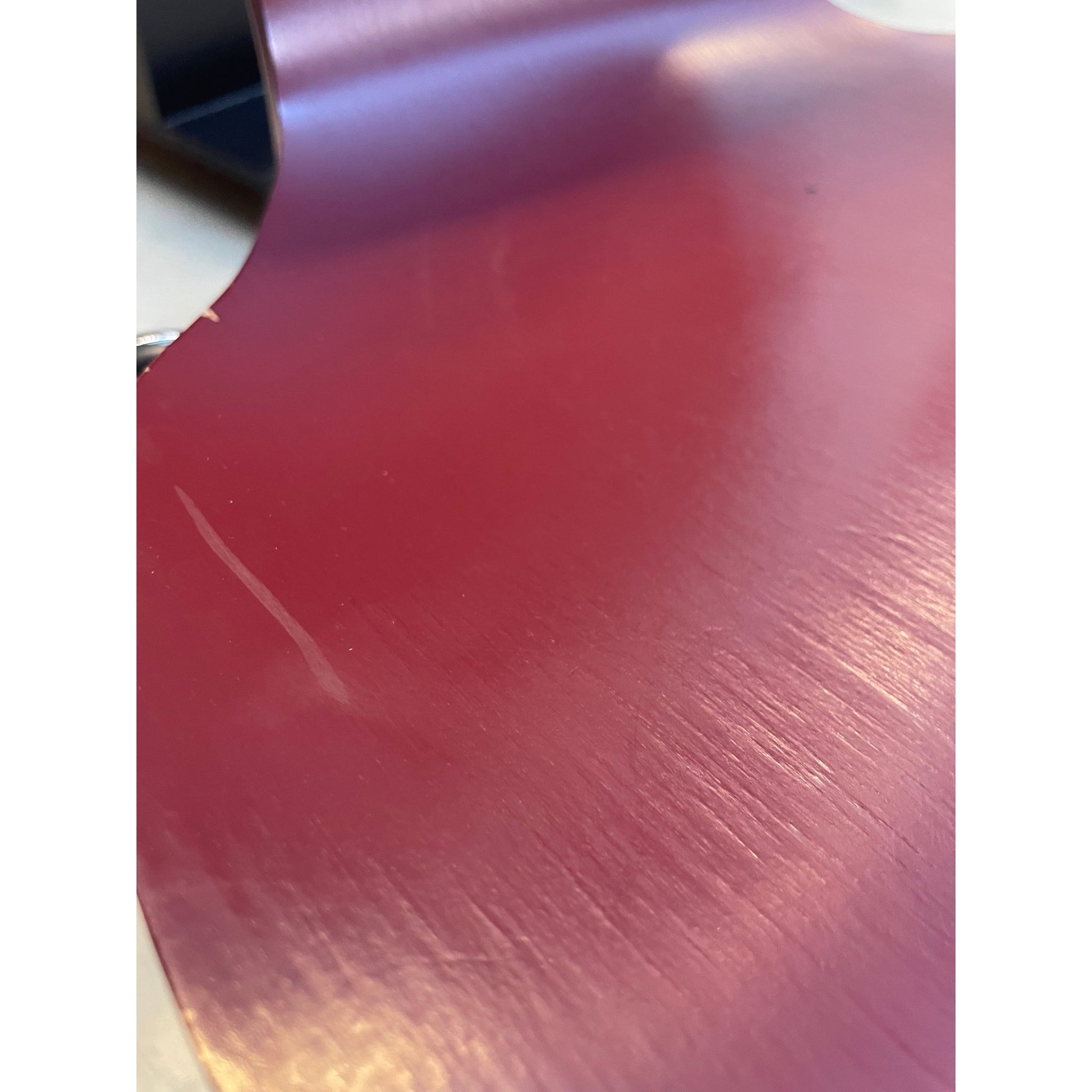 Spisestol med vinrød plast sete og slanke metallben. Den karakteristiske formen gir en moderne stil, og stolen er designet av Arne Jacobsen, kjent for sine tidløse og funksjonelle møbler.