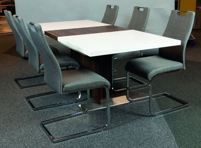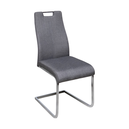 Komfortabel spisestol fra A-Møbler trukket i grått tekstil. Den har et kromunderstell og gir en behagelig svikt som gjør den ideell for lange stunder rundt bordet.