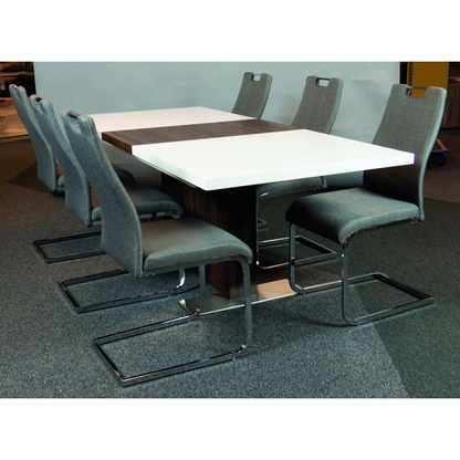 Komfortabel spisestol fra A-Møbler trukket i grått tekstil. Den har kromdetaljer og en unik formede understell som gir god støtte og svikt ved sitting, noe som forbedrer opplevelsen rundt måltidene.