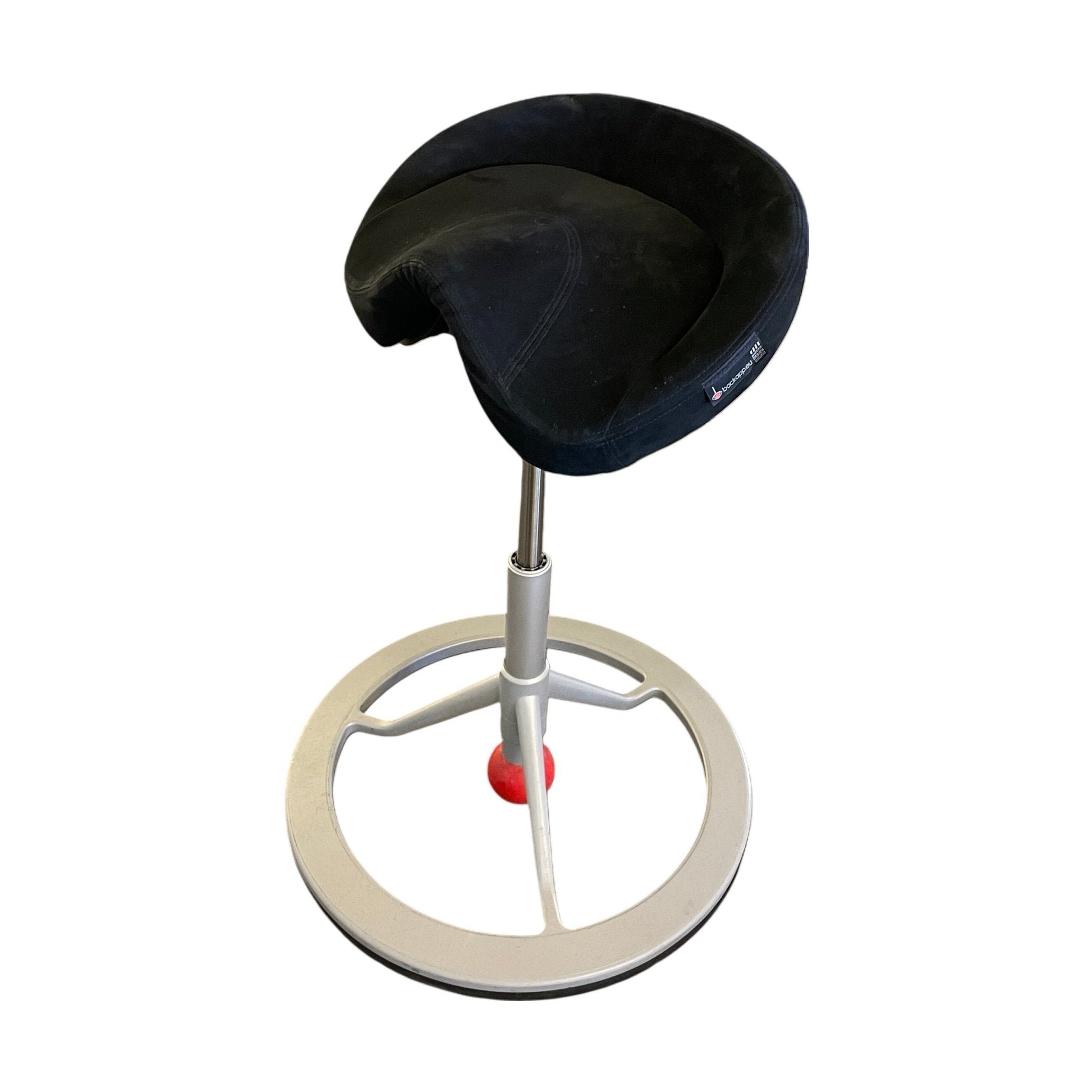 Backapp 2.0 balansestol fra BackApp tilbyr en unik sittestilling som fremmer aktiv bevegelse og god holdning. Stolen har et minimalistisk design med en lett, men robust ramme i aluminium og et komfortabelt, svart stoffsetet. Høyden kan justeres opptil 83 cm, noe som gjør den ideell for både standard og høyere arbeidsbord.