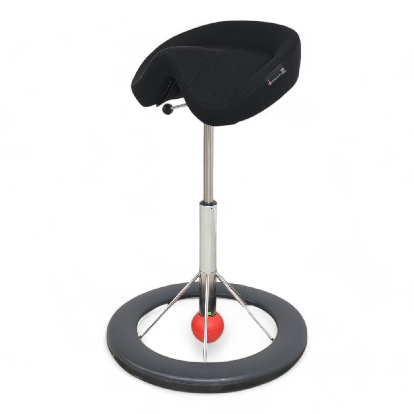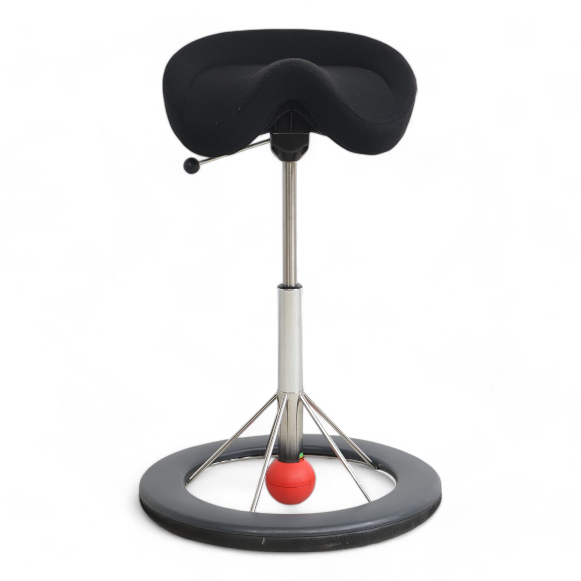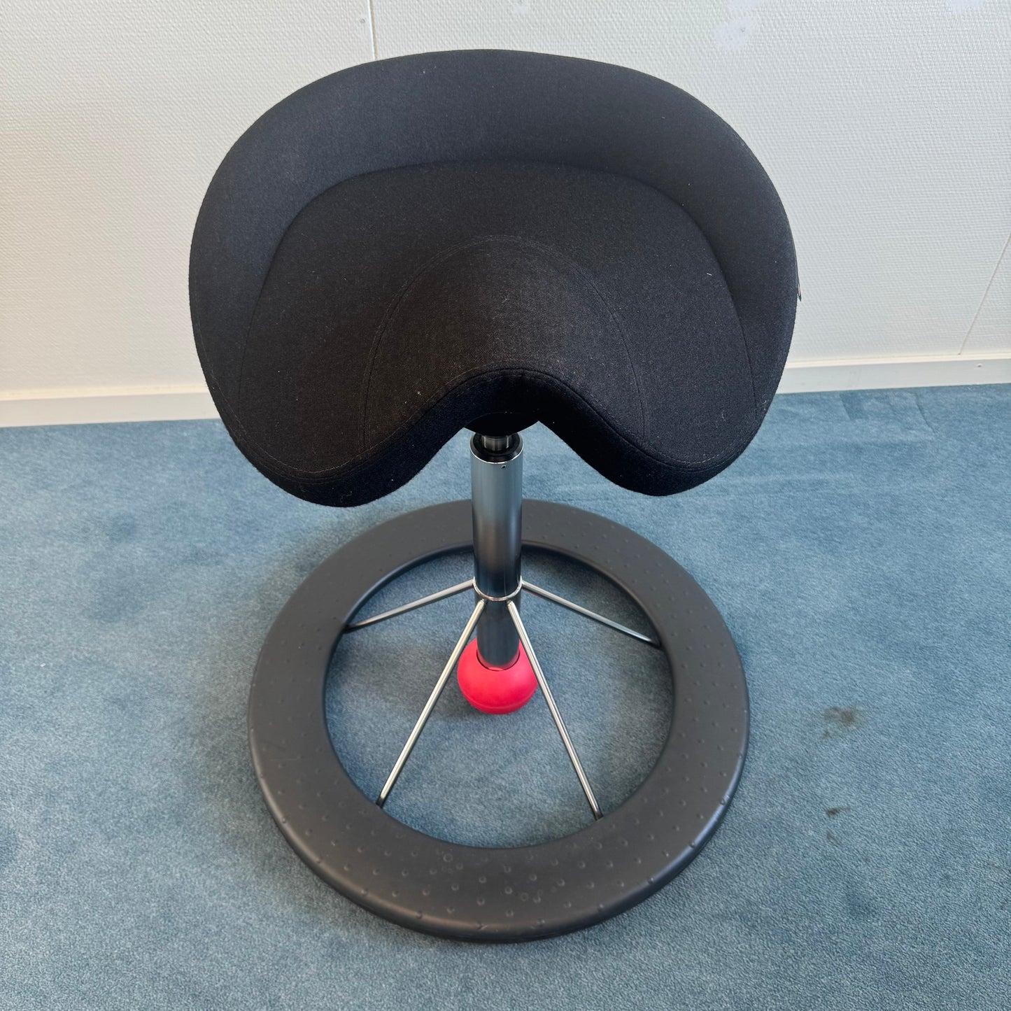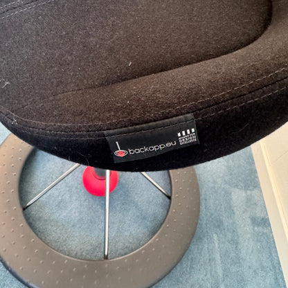 Balansestolen fra Backapp kombinerer moderne design med ergonomiske prinsipper for å fremme en aktiv sittestilling. Den har et stilrent svart stoff med en unik sadelformet sitteflate, perfekt for fleksibel bevegelse og stilren estetikk.