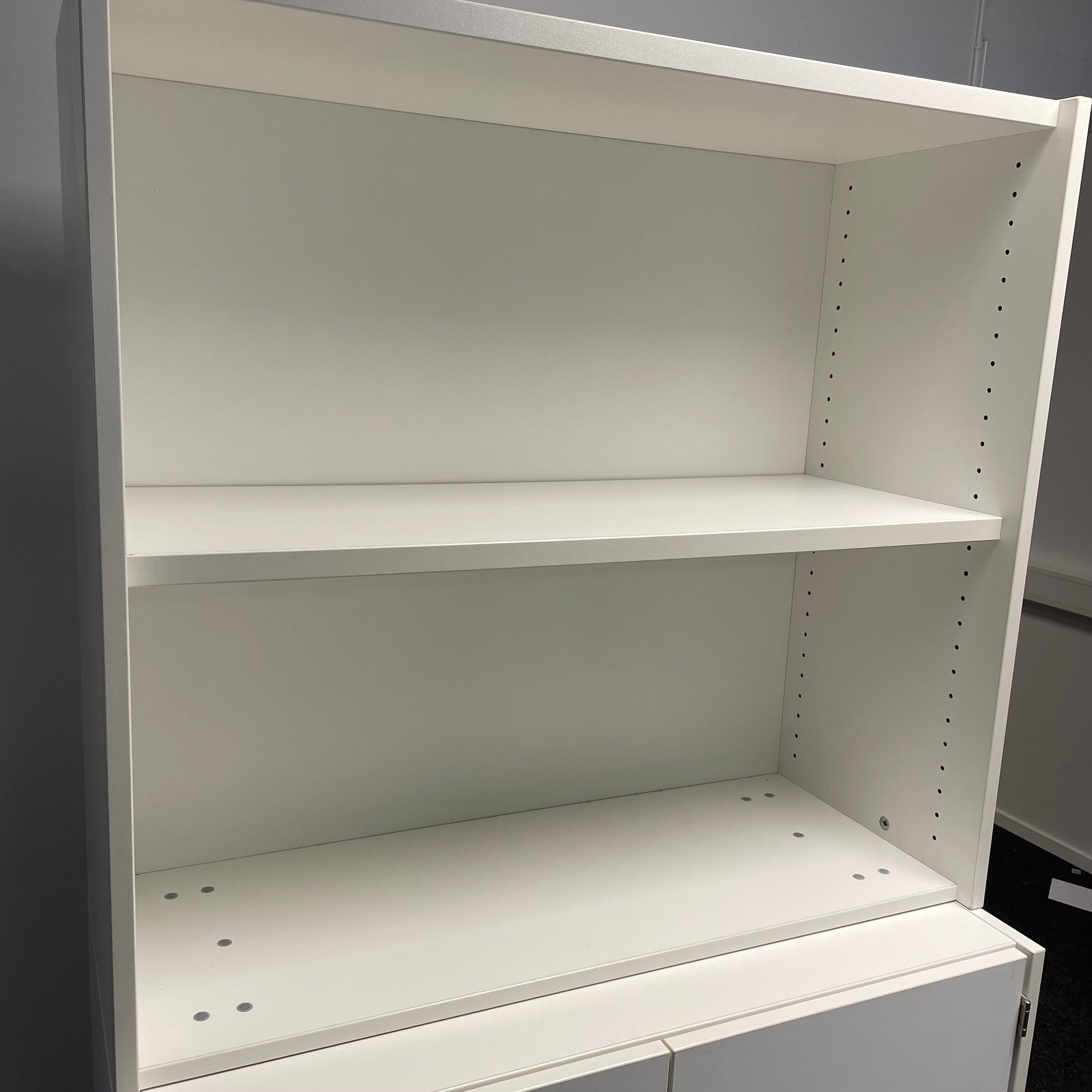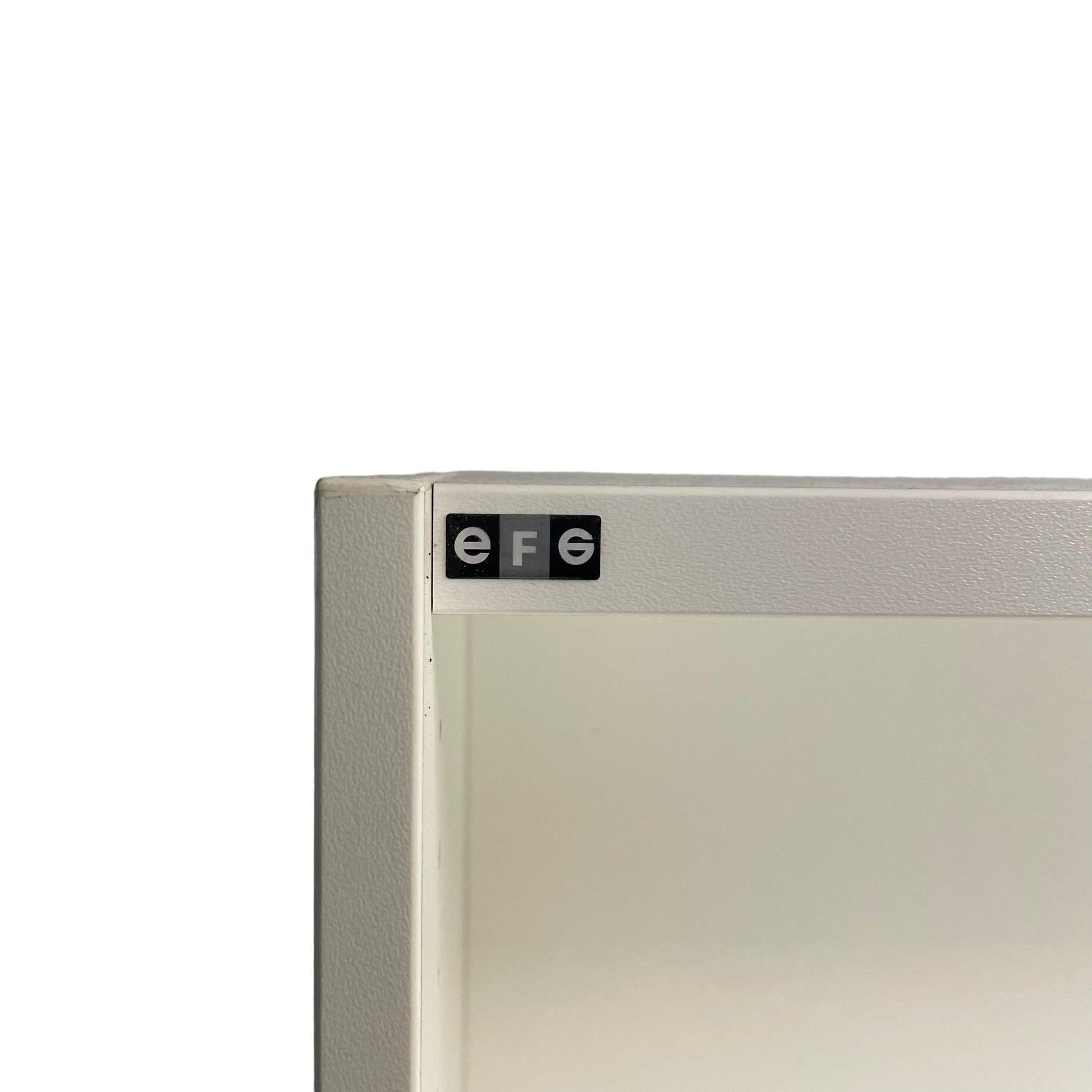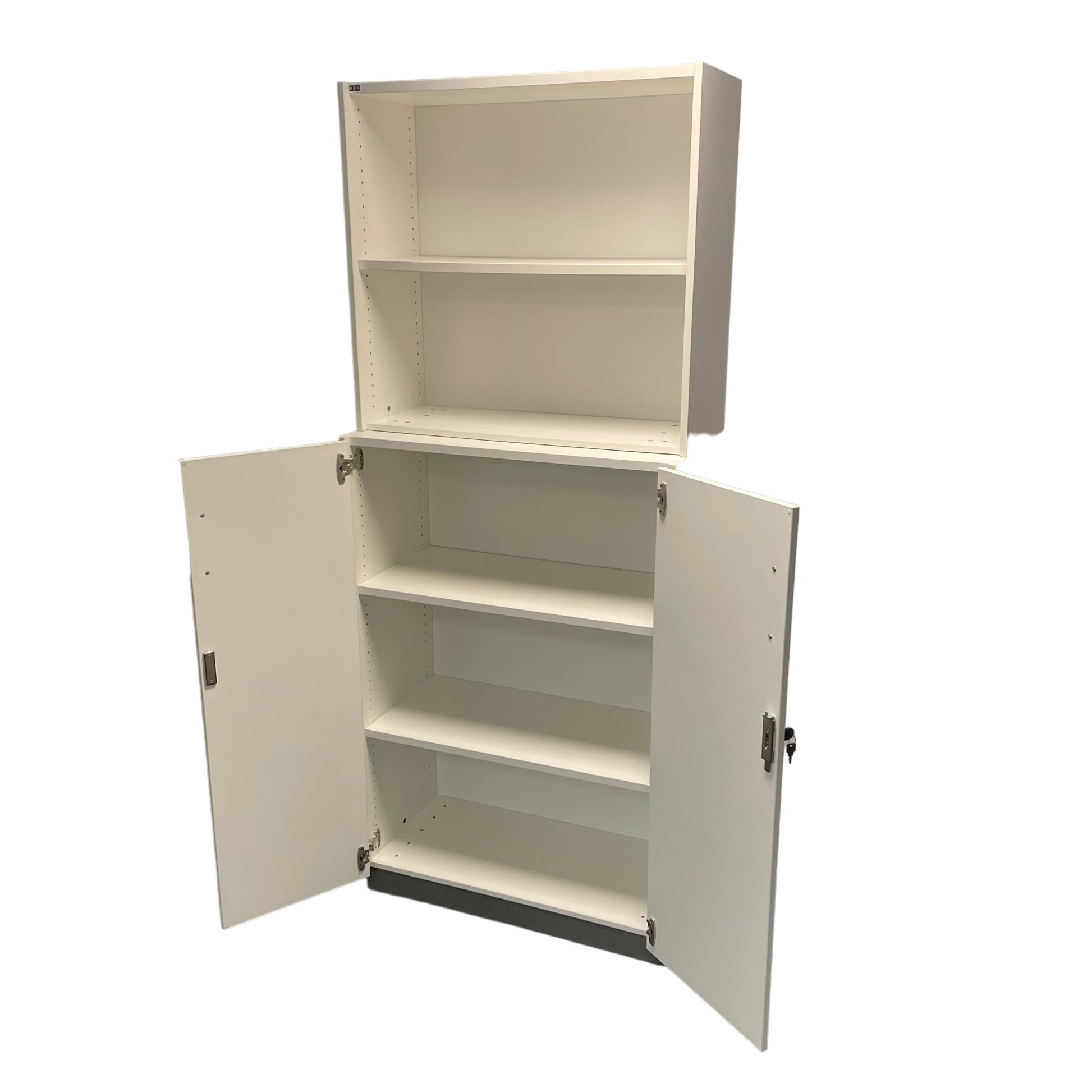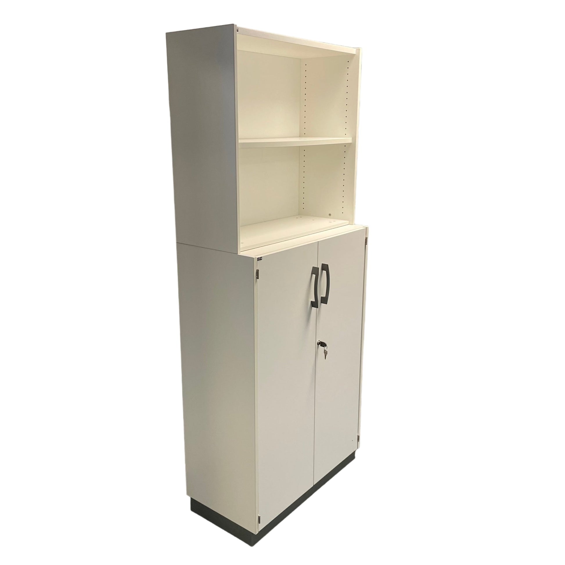 Solid skap fra EFG med låsbare dører og nøkkel inkludert. Skapet har to hyller på toppen og gir rikelig med oppbevaringsplass både åpent og bak dører.