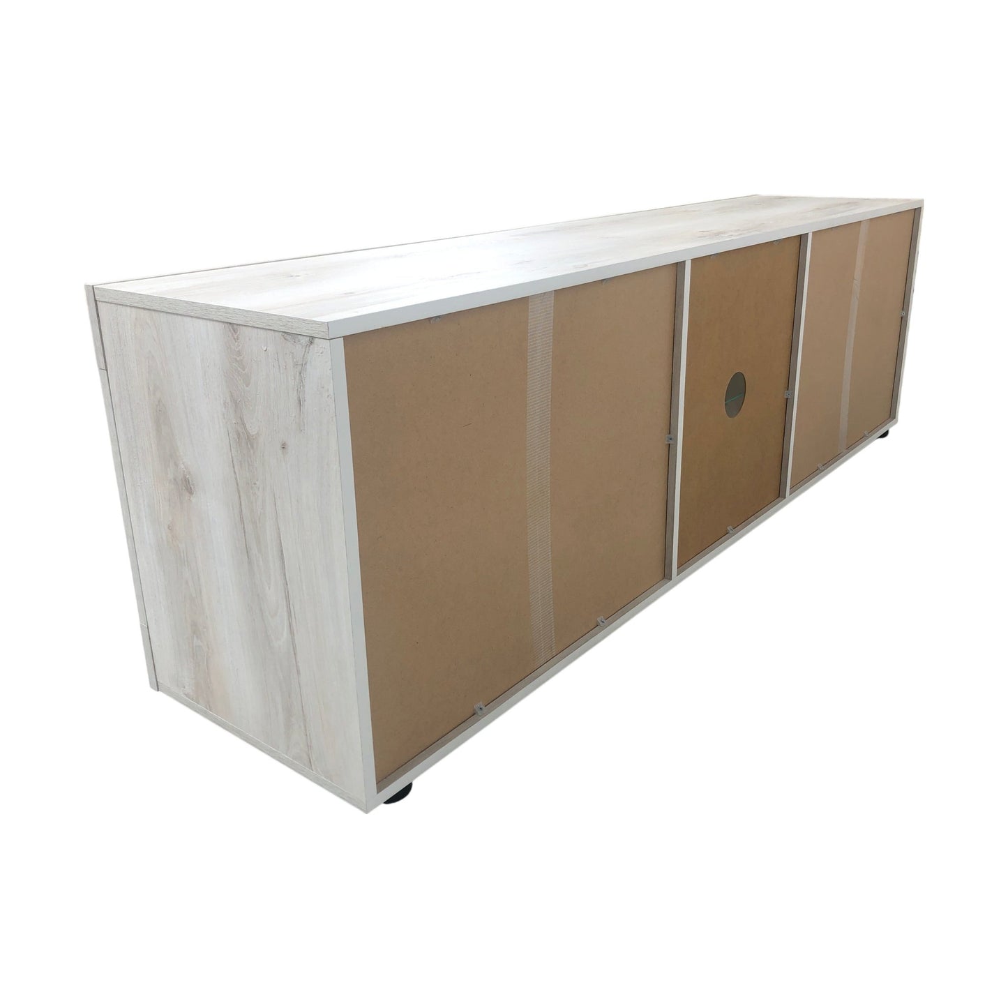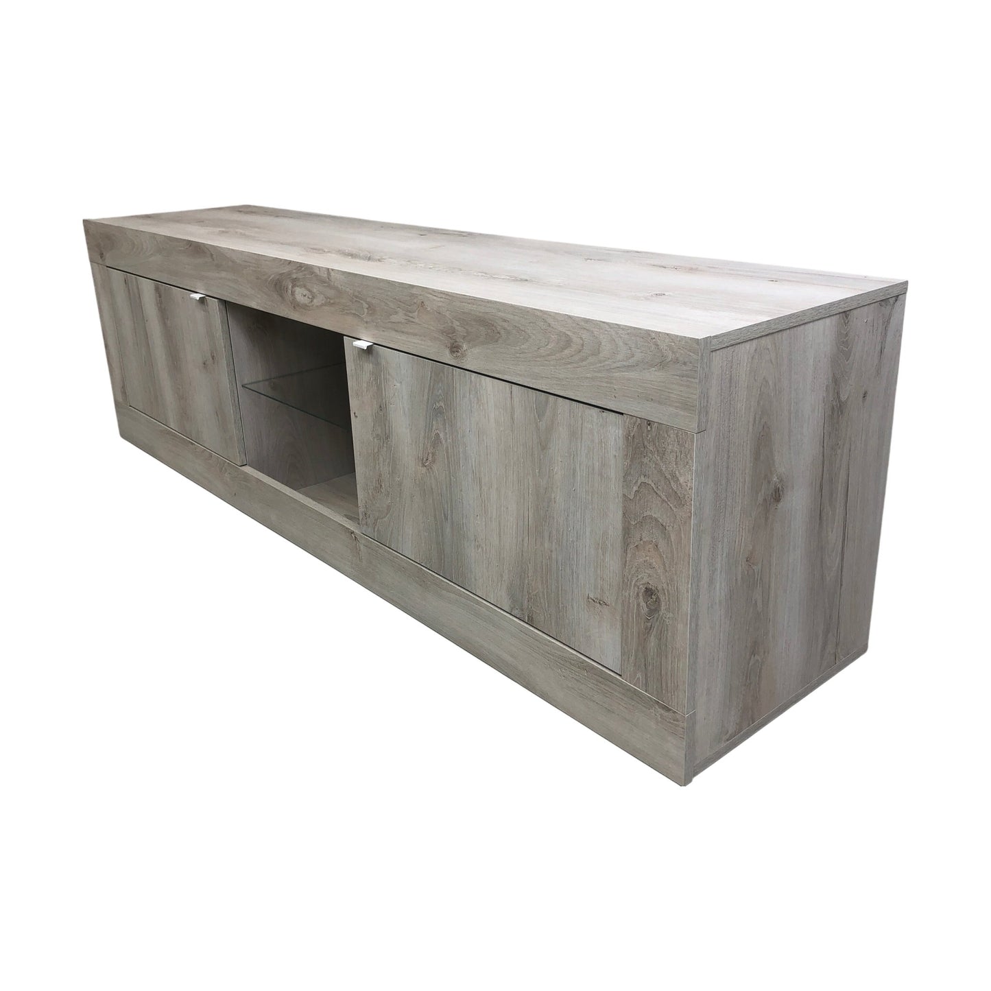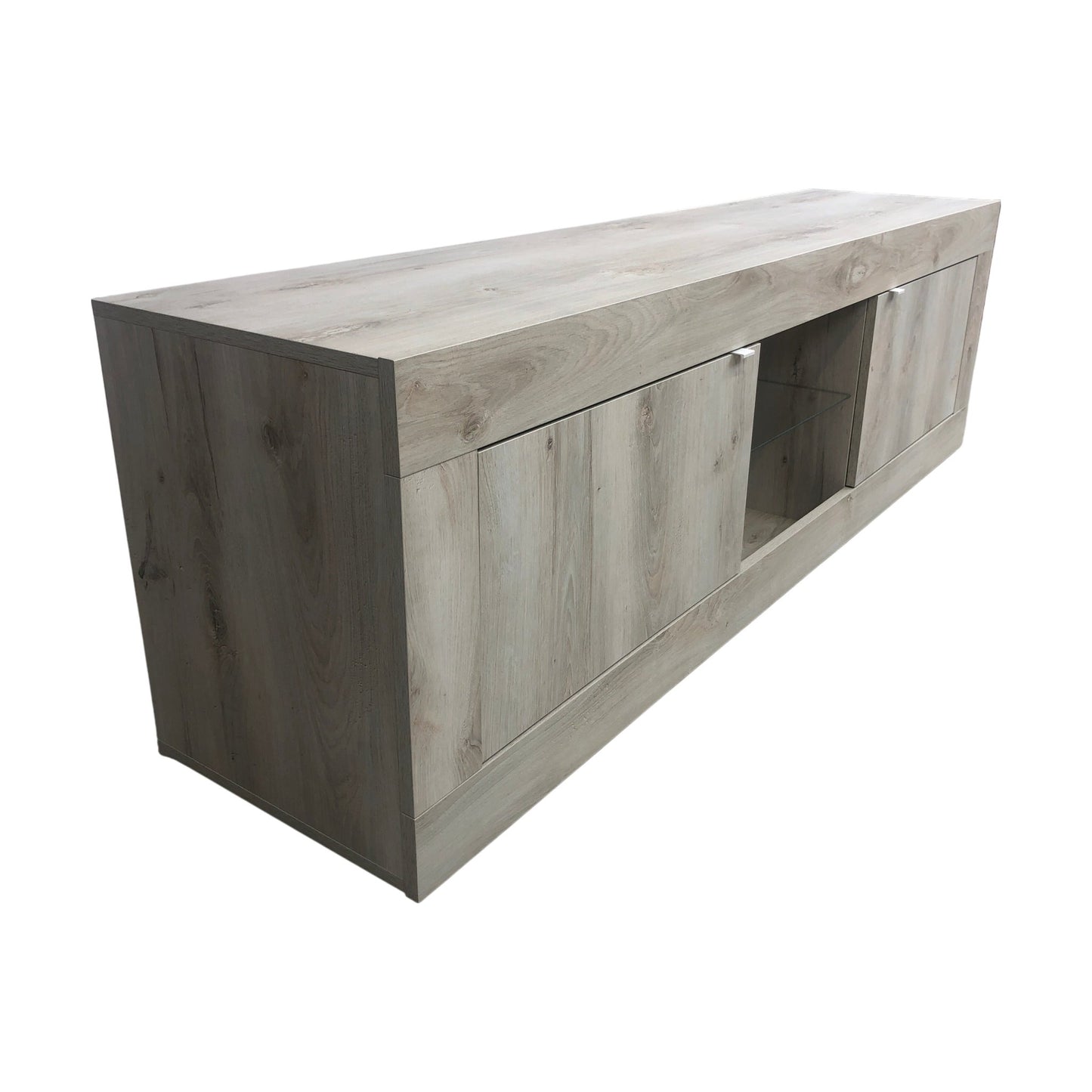 Basic TV-benk fra A-Møbler med et moderne og stilrent design. Denne benken har to skap på hver side og en midterste hylle av glass, perfekt for å vise frem underholdningsutstyr eller dekorative elementer. Den lys grå trefargen gir et friskt og naturlig preg, som passer godt inn i ulike interiørstiler.
