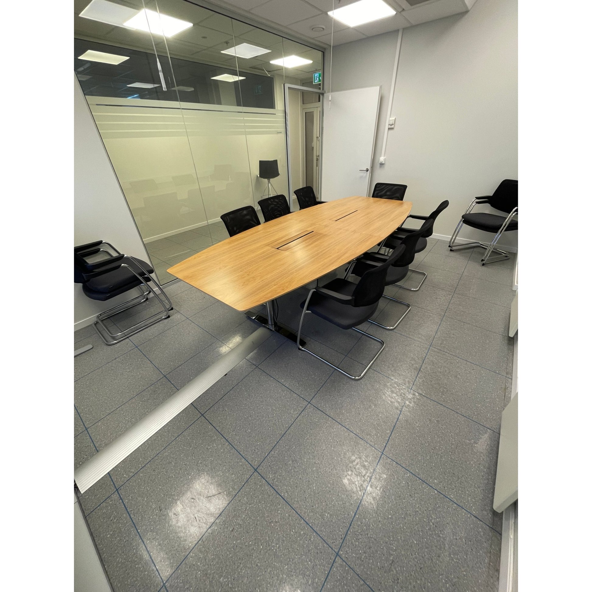 Båtformet møtebord med en elegant oljet eik bordplate som gir et sofistikert preg. Dette bordet utstråler stil og profesjonalitet, perfekt for møterom, kontorer og kreative arbeidsmiljøer.