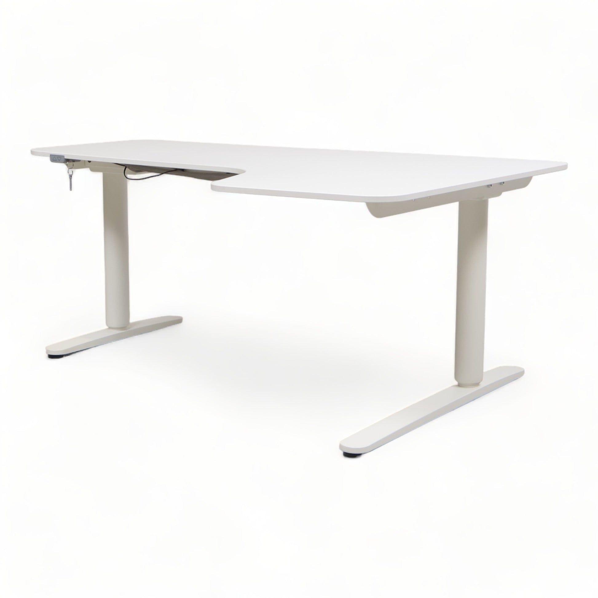Bekant elektrisk hev/senk skrivebord med et stilren og funksjonelt design, perfekt for moderne kontormiljøer. Bordplaten er formet i en praktisk L-form som gir god plass til arbeidsutstyret. Med elektrisk høydejustering kan skrivebordet enkelt tilpasses for både sittende og stående arbeid. Den hvite overflaten gir et lyst og åpent uttrykk som passer inn i de fleste rom.