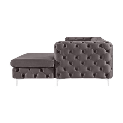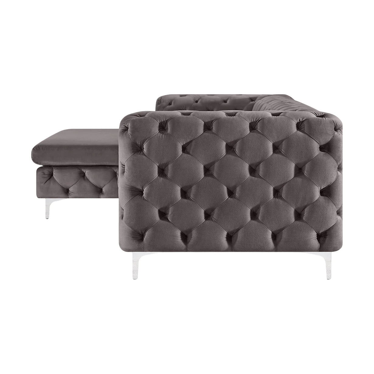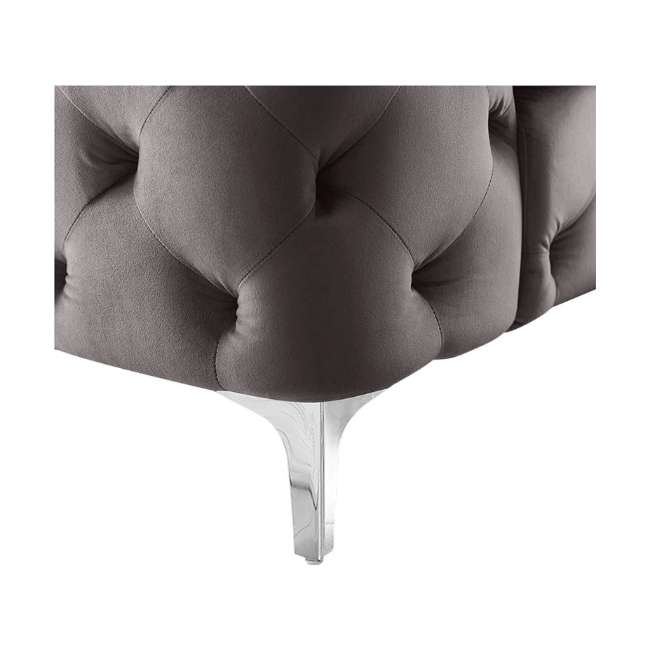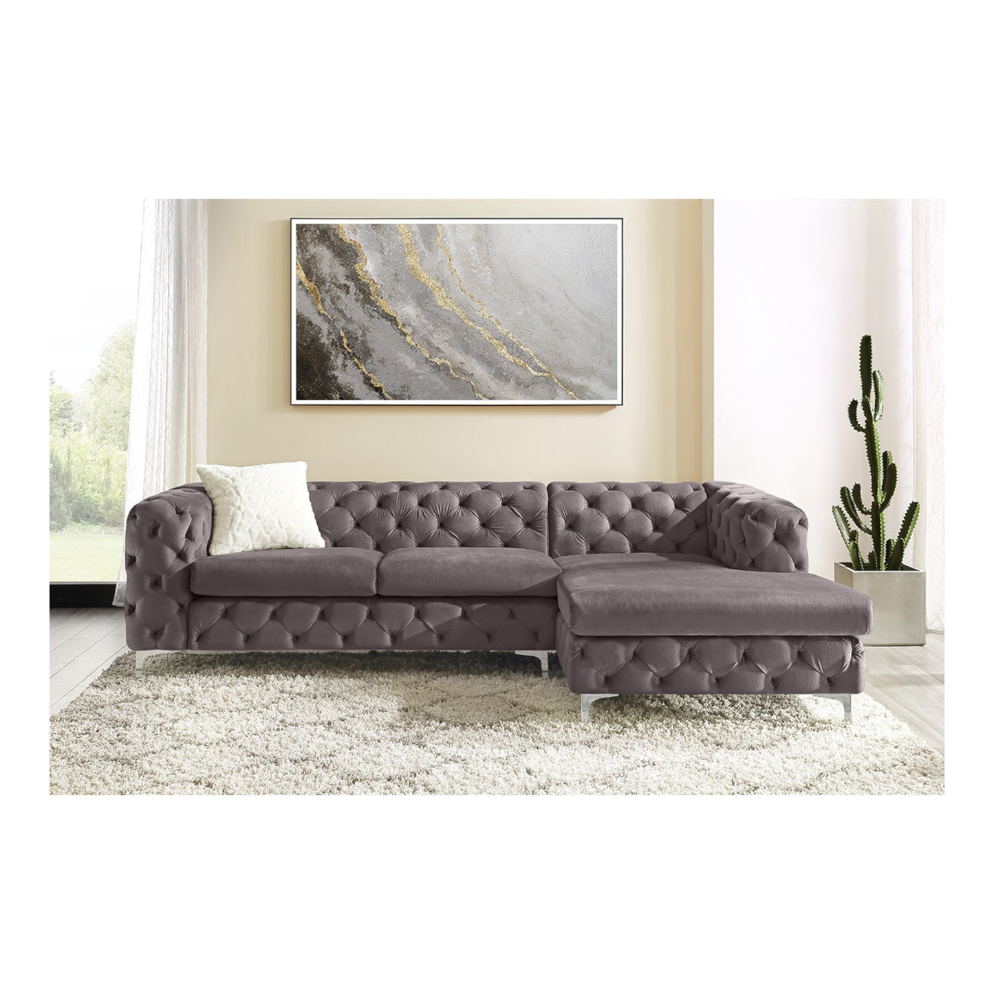 Elegant Bella sofa fra A-Møbler i mykt velourstoff med dype knappesømmer. Denne moderne tolkningen av den klassiske chesterfield-stilen gir et tidløst og sofistikert preg, perfekt for å heve stilen i ethvert rom.