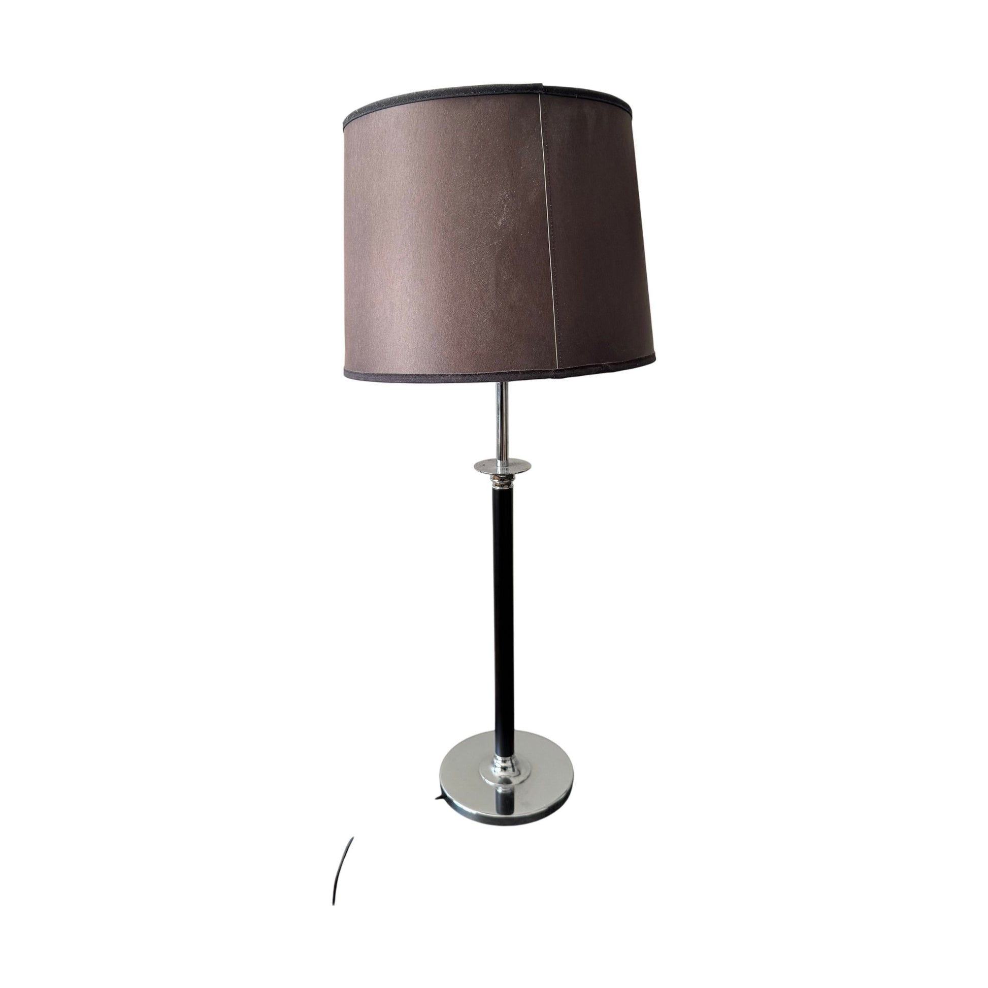 Bordlampe med en elegant brun skjerm som gir et varmt og behagelig lys til ethvert rom. Lampen har en moderne design med en svart stang og en krom fot, perfekt for både stue og soverom.