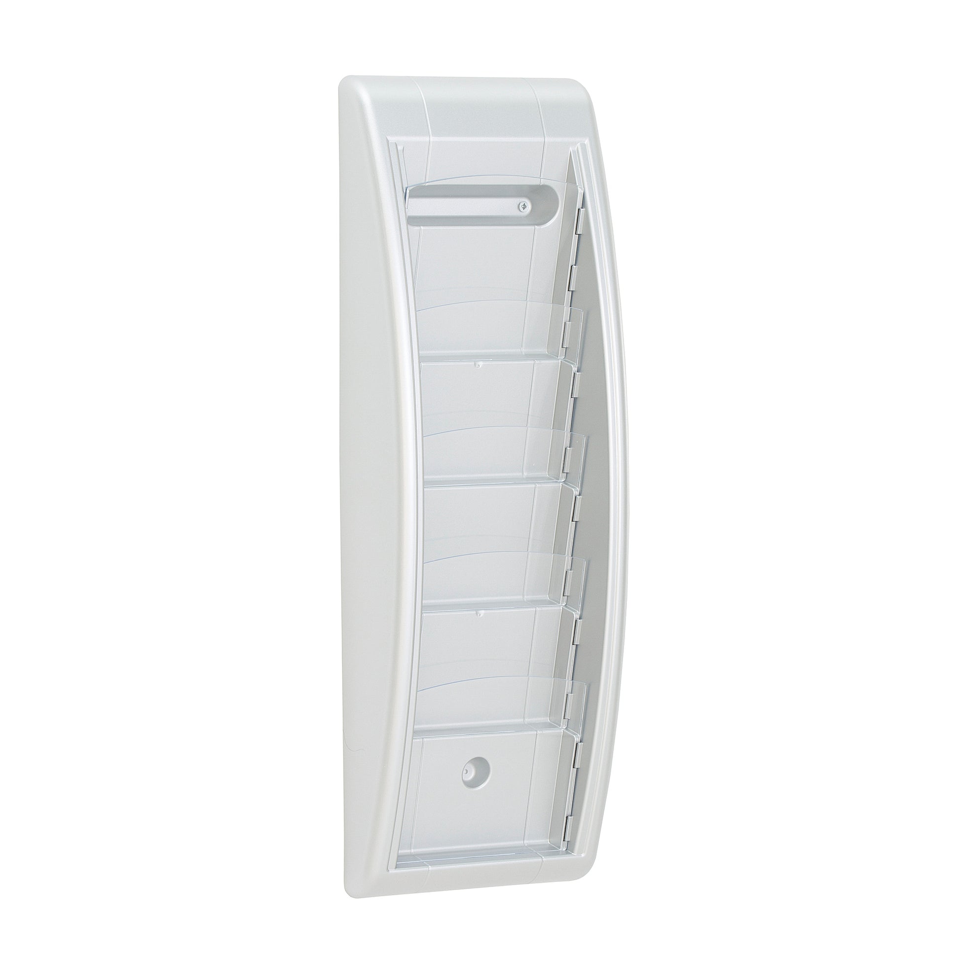 Praktisk og stilrent Brosjyrestativ PROMOTE med 5 rom for A5-brosjyrer. Det vegghengte stativet er sølvfarget, noe som gir et moderne uttrykk og passer perfekt for kontorbruk eller offentlige miljøer. Gjennomsiktige lommer sikrer god oversikt over brosjyrene.