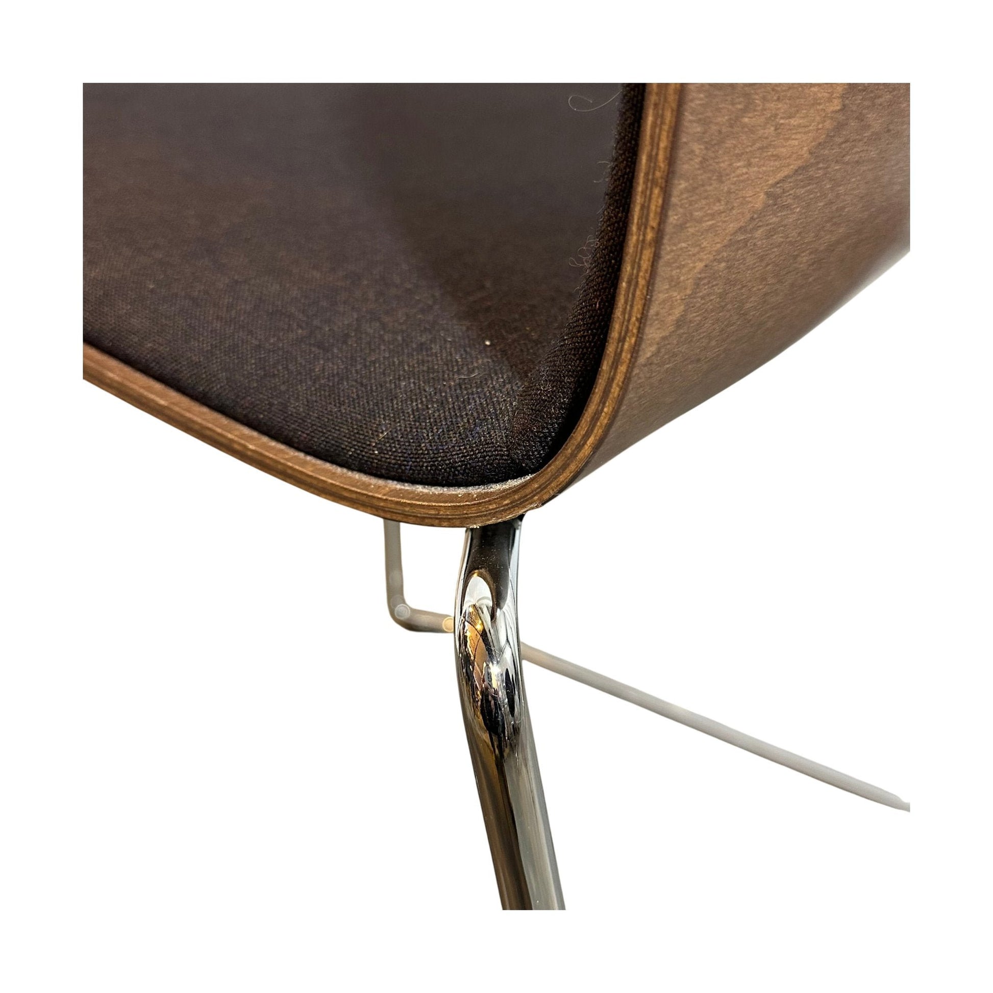 Brunner møtestol med tre rygg er en stilren og funksjonell stol perfekt for møterom eller kontorer. Stolen har et polstret sete trukket i slitesterkt brunt stoff, noe som gir en behagelig sitteopplevelse. Den minimalistiske designen med en simpel, men elegant form passer godt inn i moderne interiører. Ryggdelen støtter godt, og gir en ergonomisk sitteposisjon, mens metallrammen sikrer stabilitet og holdbarhet.