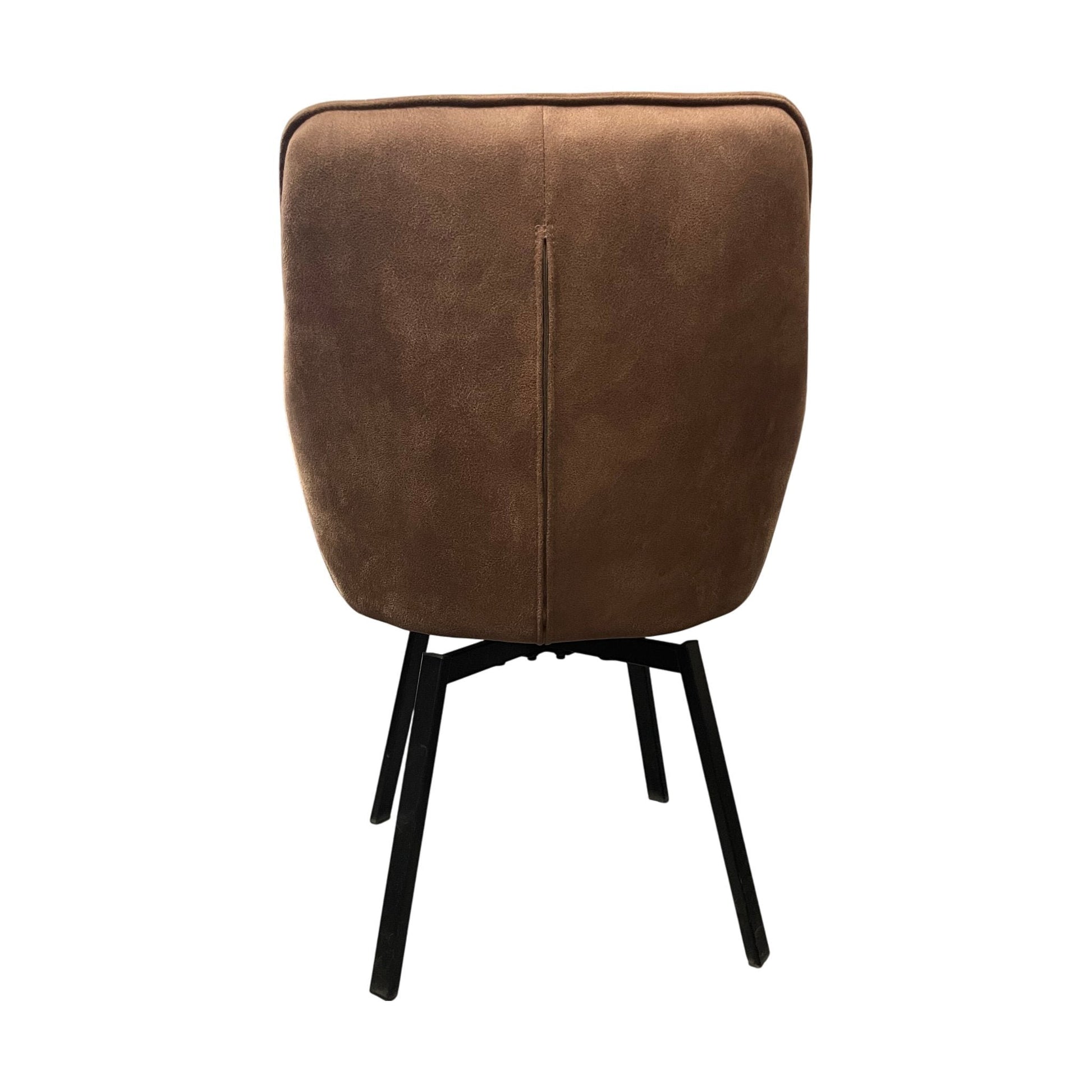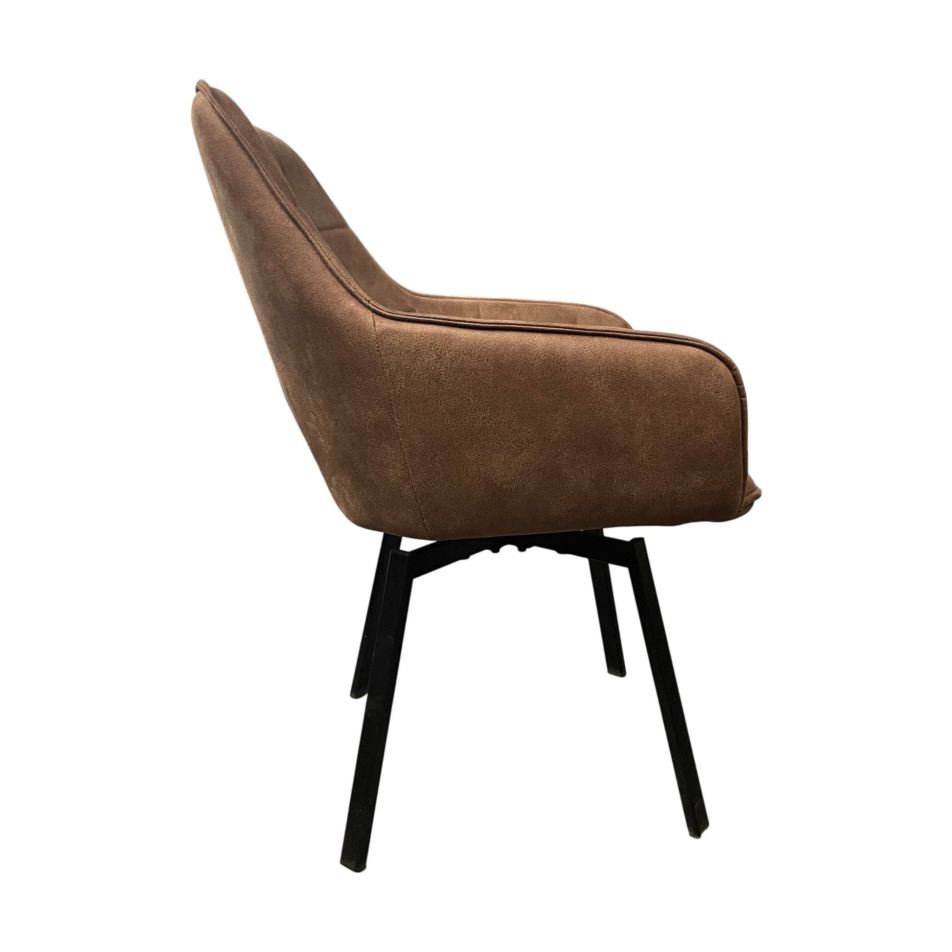 Spisestol med brunt tekstiltrekk og svart metallunderstell. Stolens avrundede rygg og slanke ben gir en moderne og stilren estetikk, perfekt for både spisebord og sosiale soner.