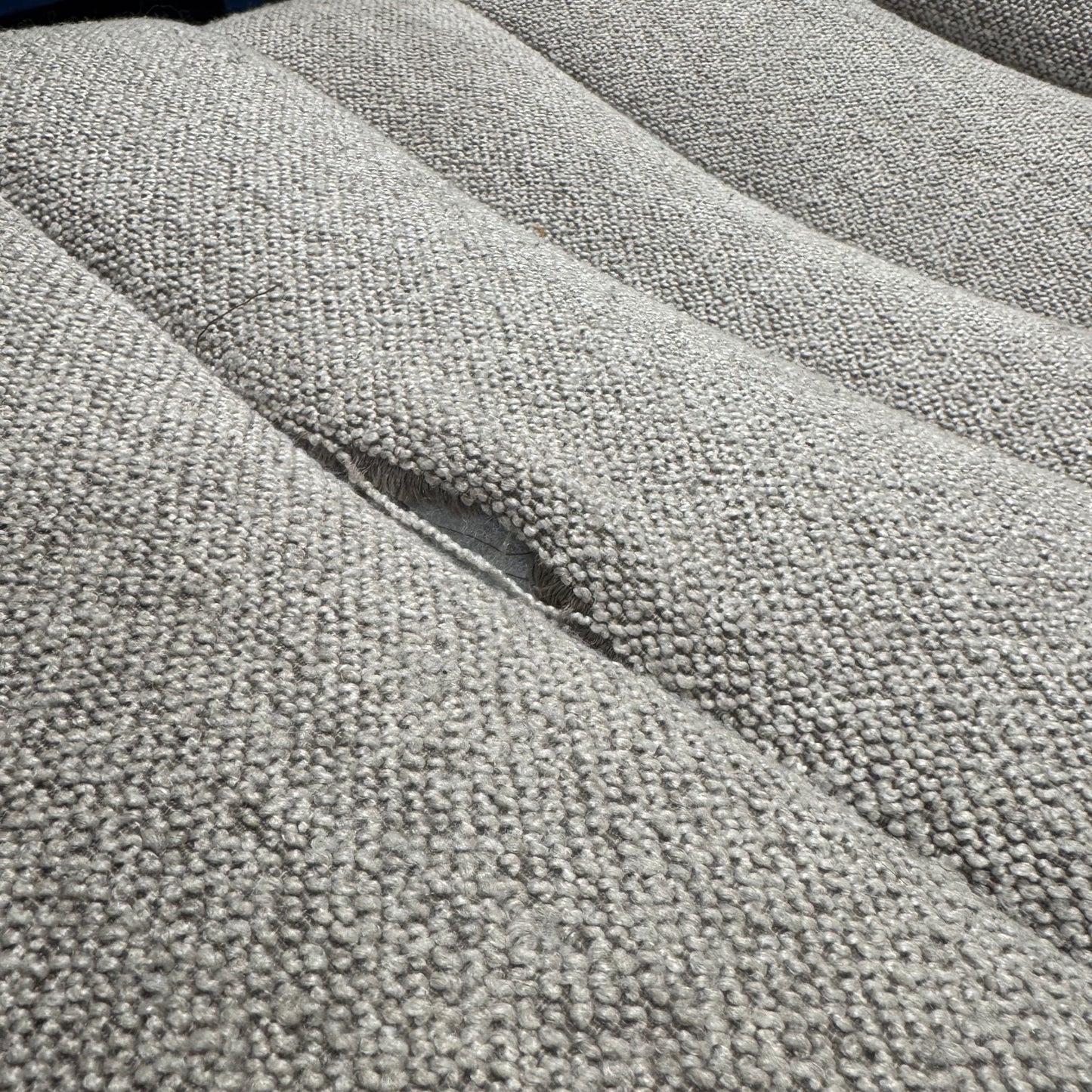 Lenestolen er i godt brukt tilstand med betydelige rifter i stoffet, men den er fortsatt funksjonell og kan være et flott tilskudd til et avslappet miljø. Den unike formen og fargen gjør den til et særegent objekt i ethvert rom.