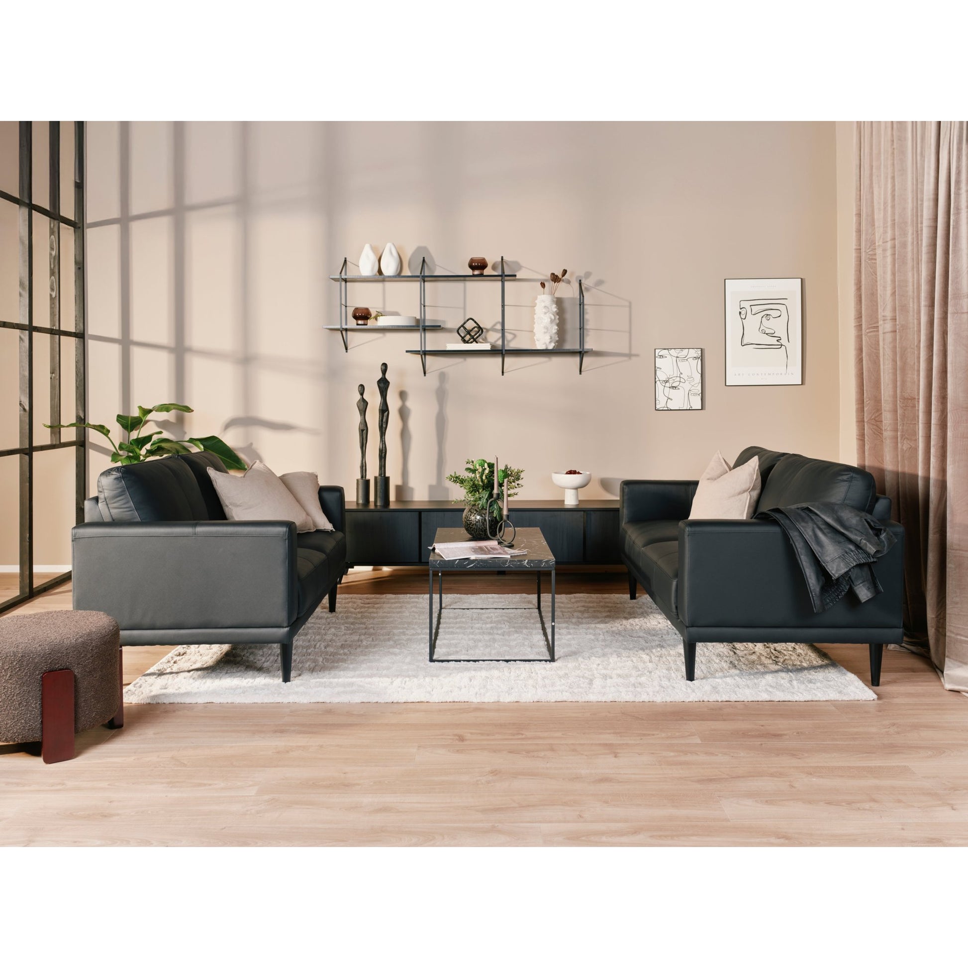 Elegant og moderne Dagmar 3-seter sofa fra A-Møbler, trukket i slitesterk svart hud/PU, som gir et stilrent uttrykk. Sofaen har brede sitteputer og myke ryggputer som gir en komfortabel sitteopplevelse, perfekt for koselige stunder i stuen. De slanke bena gir sofaen et lett preg, samtidig som den passer inn i både moderne og klassiske interiører.