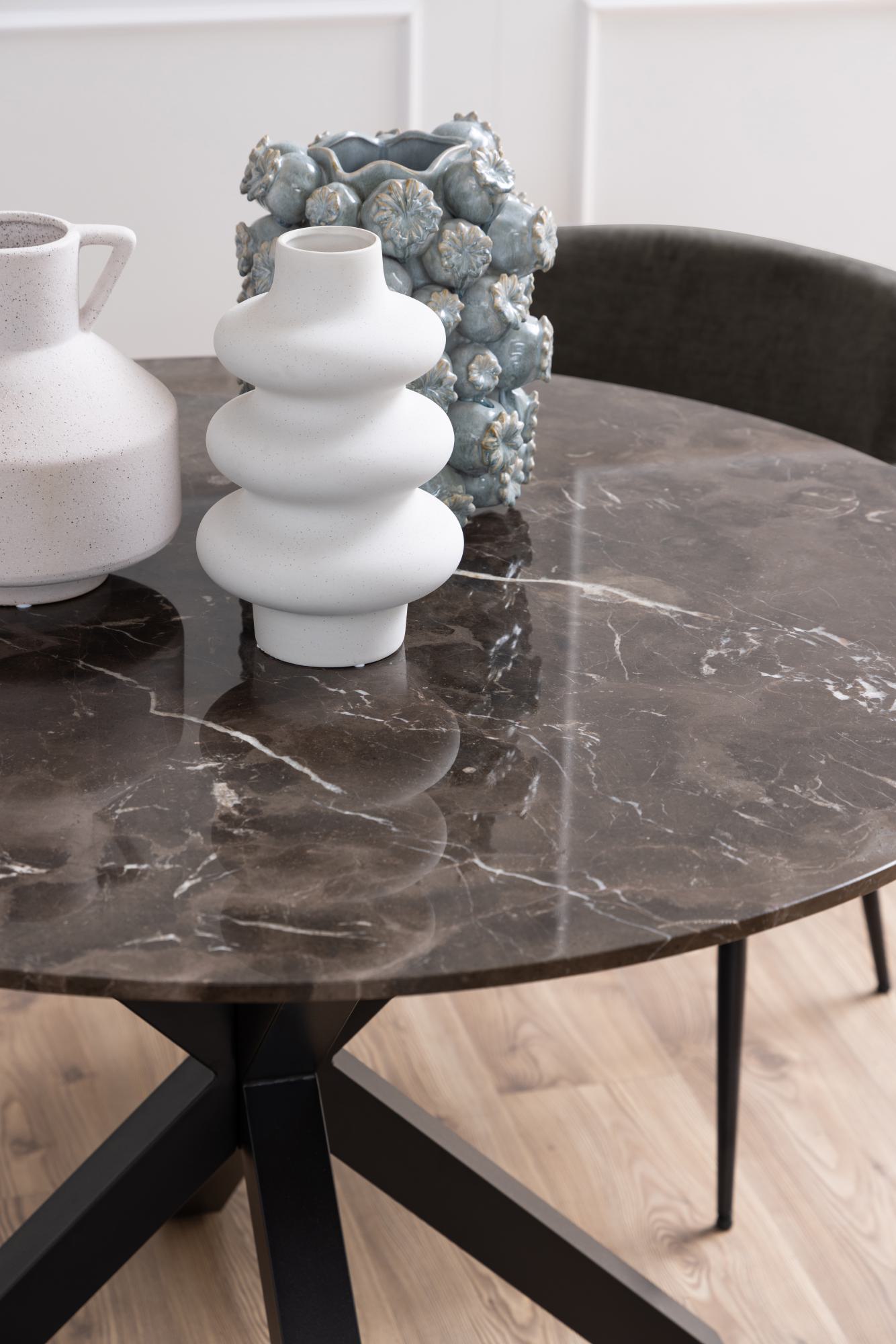 Oppdag elegansen til Earth spisebord fra A-Møbler. Dette bordet kombinerer moderne design med holdbarhet, med en unik rund form og robust kryssbase i matt svart pulverlakkert stål. Perfekt for både hverdags- og festbruk.