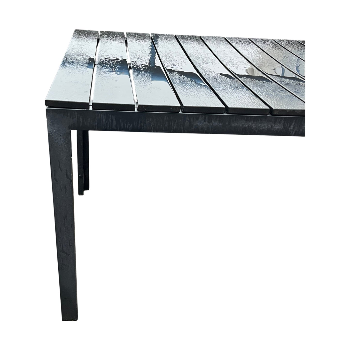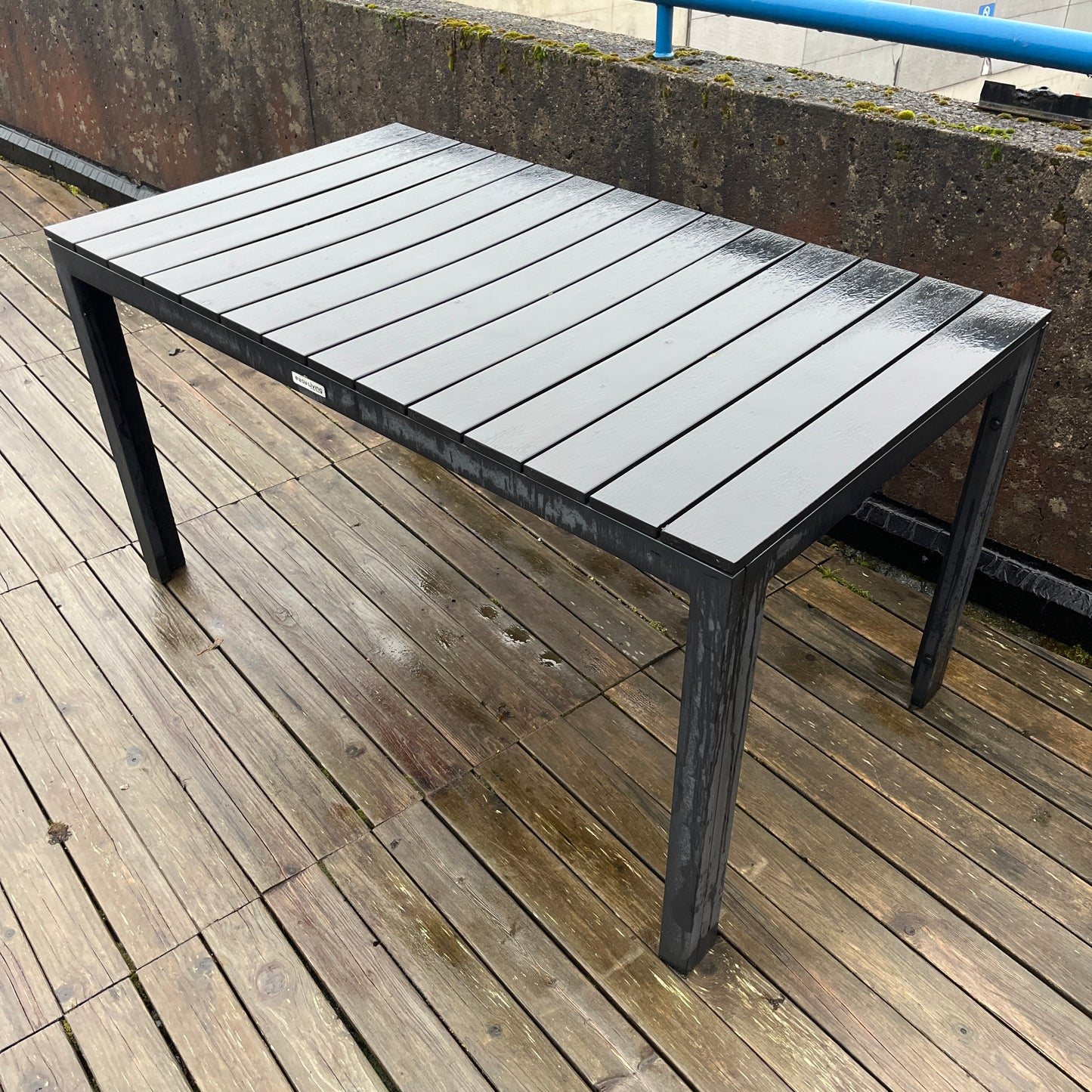 Utebordet er i god stand med minimale tegn til slitasje. Det er noen små riper på overflaten, men dette påvirker ikke funksjonaliteten eller det estetiske uttrykket.