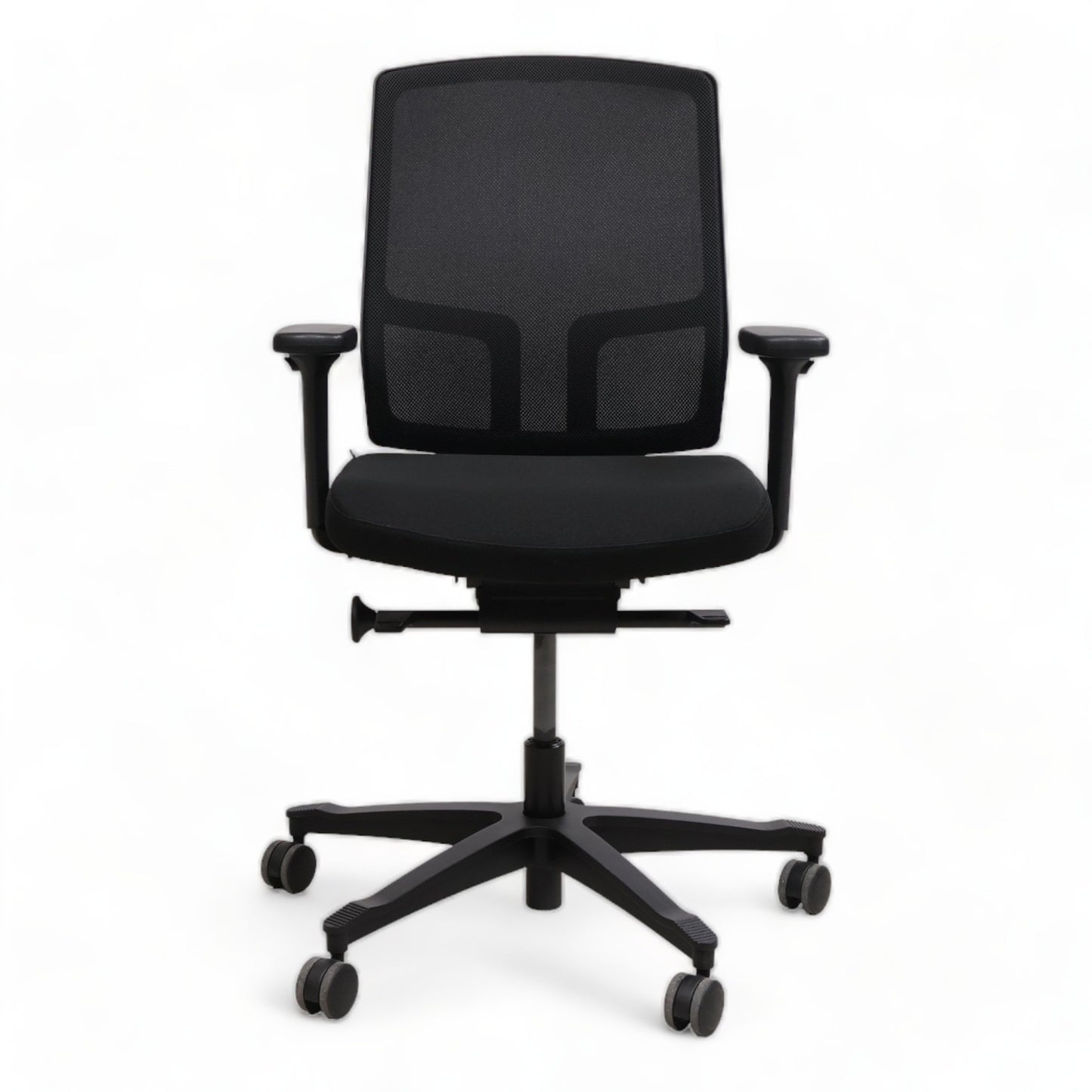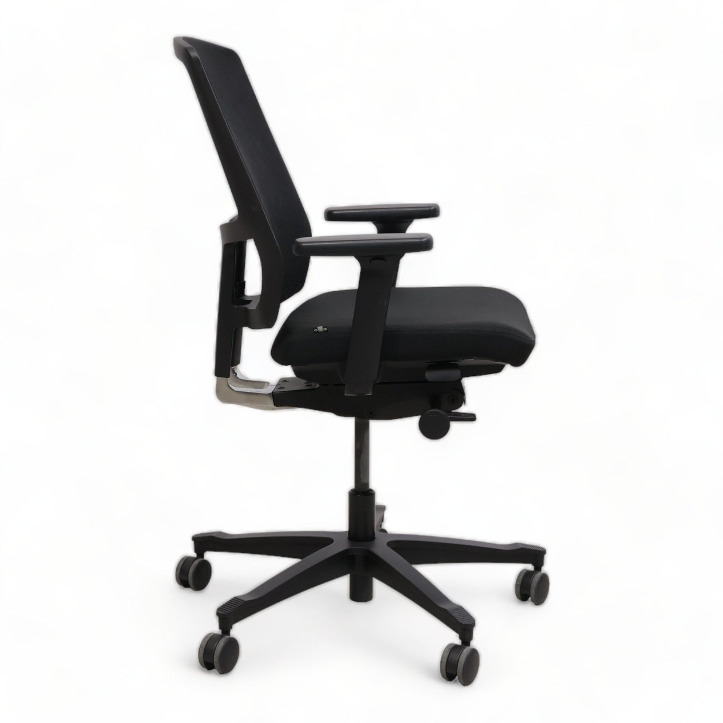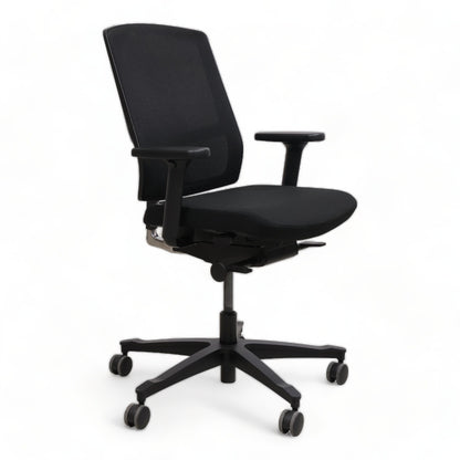 Stolen er utstyrt med justerbare armlener og en hev/senk-funksjon for tilpasning. Helhetlig i god stand.