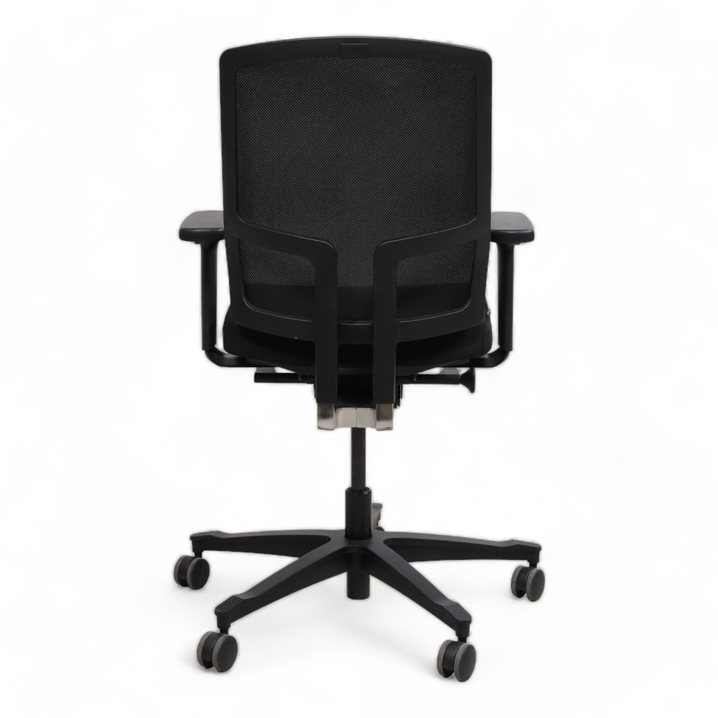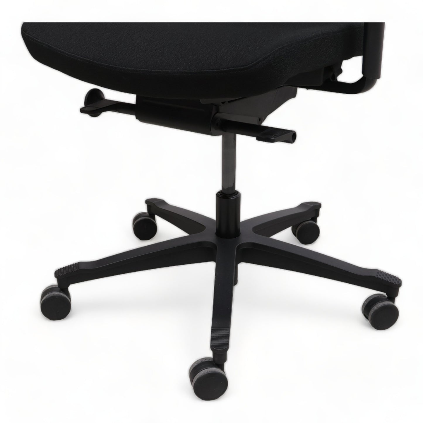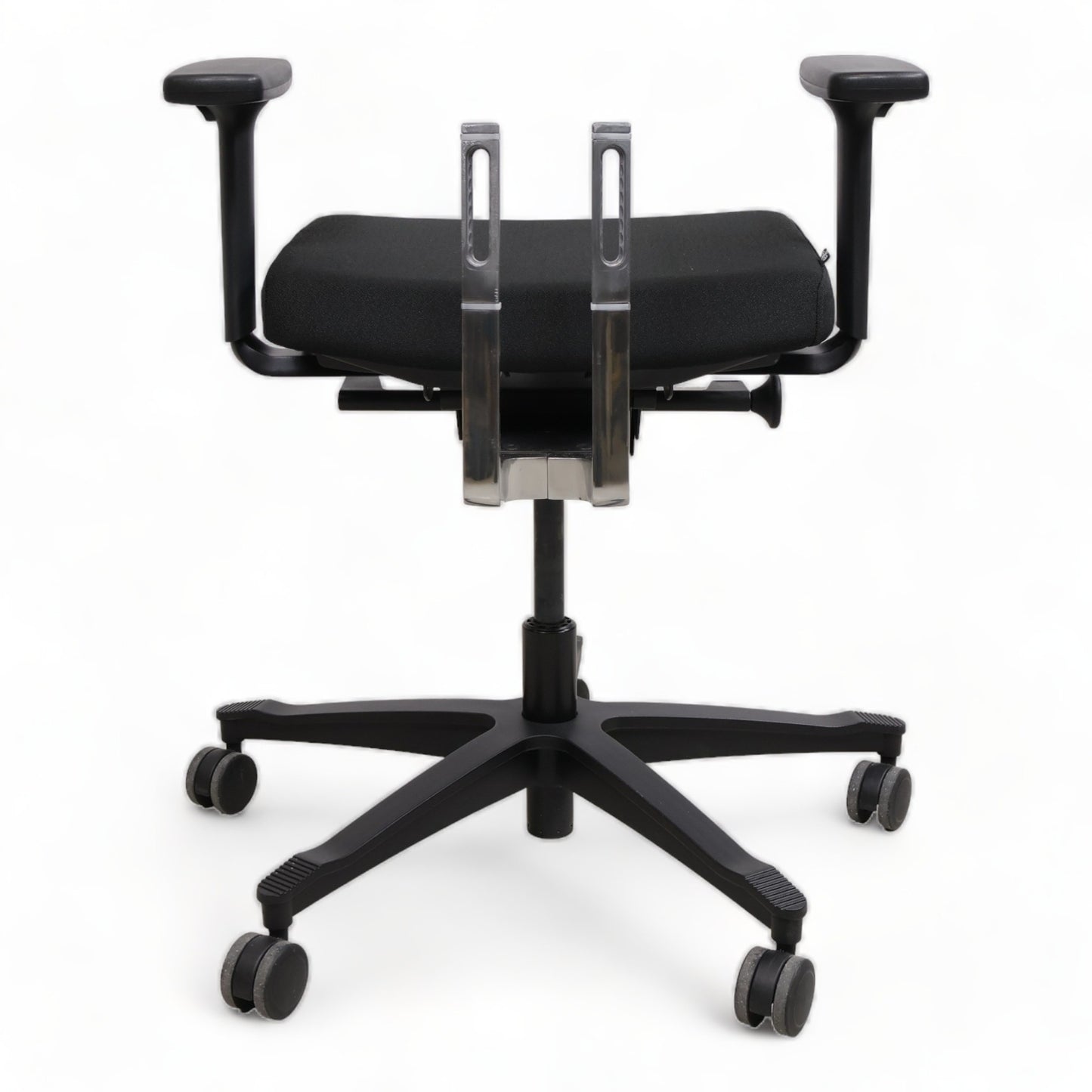 Svart EFG-kontorstol med fleksibilitet. Denne stolen er praktisk med mulighet til å fjerne ryggen for plassbesparelse, som du kan se på det siste produktbildet, eller for å sitte uten ryggstøtte om ønskelig.