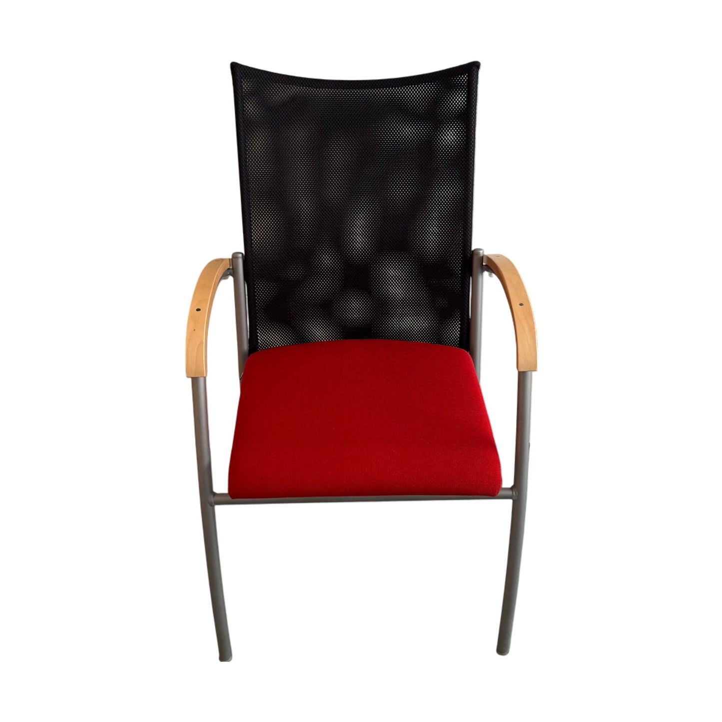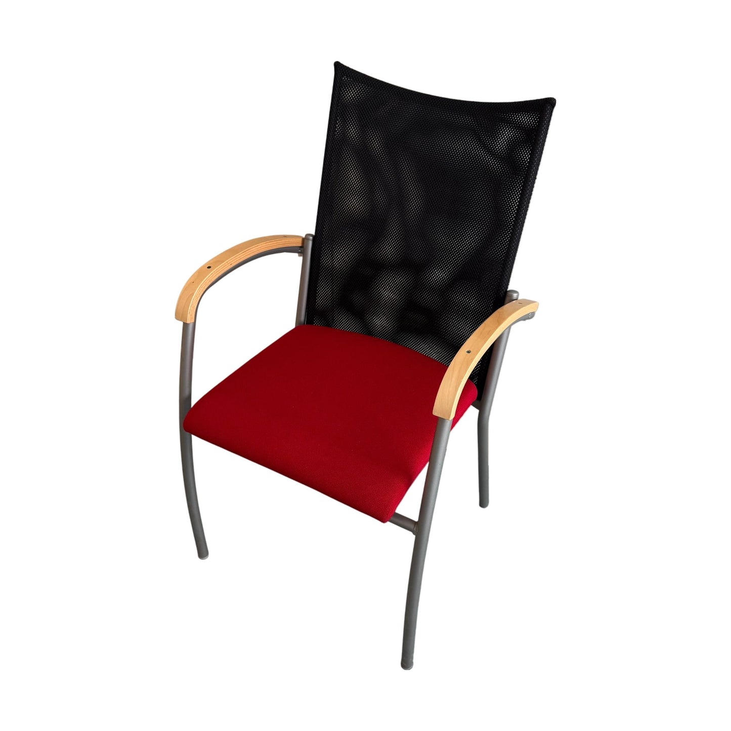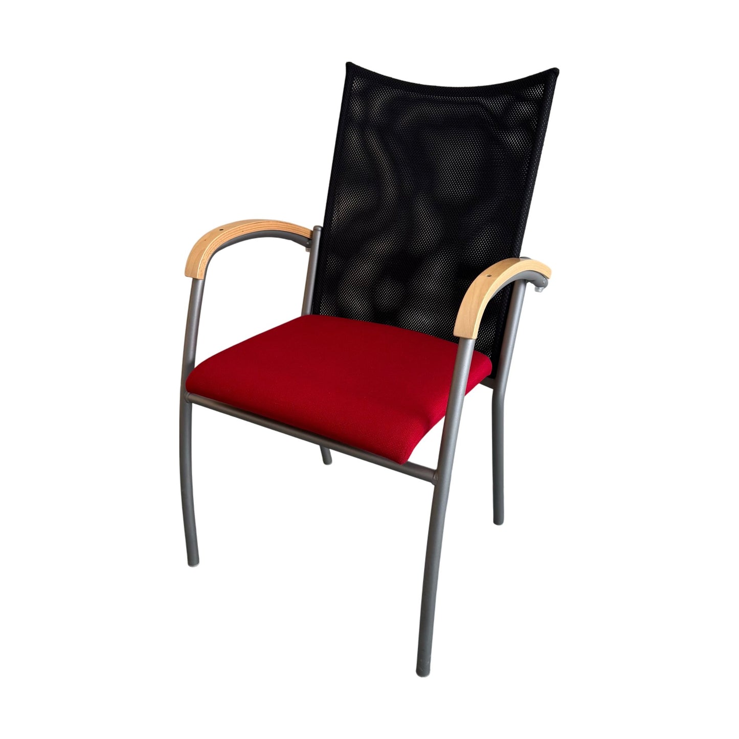 Moderne møteromsstol fra EFG med en kombinasjon av stil og funksjonalitet. Stolen har en iøynefallende rød polstring som gir et friskt preg i ethvert møterom. Ryggstykket er laget av perforert mesh for optimal ventilasjon, mens armlenene i tre gir et elegant og komfortabelt grep. Denne stolen er designet for å være stablebar, noe som gjør lagring og transport enkel.