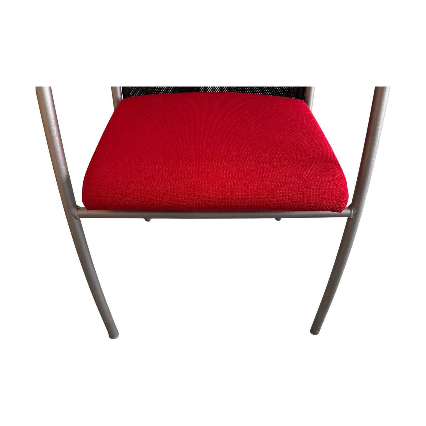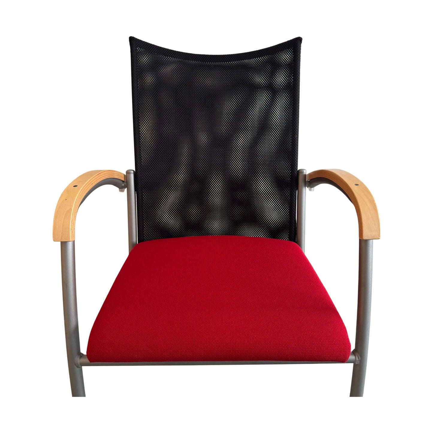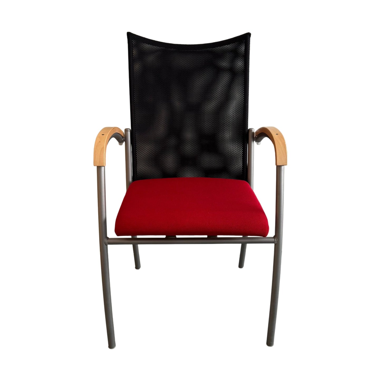 Moderne møteromsstol fra EFG med en kombinasjon av stil og funksjonalitet. Stolen har en iøynefallende rød polstring som gir et friskt preg i ethvert møterom. Ryggstykket er laget av perforert mesh for optimal ventilasjon, mens armlenene i tre gir et elegant og komfortabelt grep. Denne stolen er designet for å være stablebar, noe som gjør lagring og transport enkel.