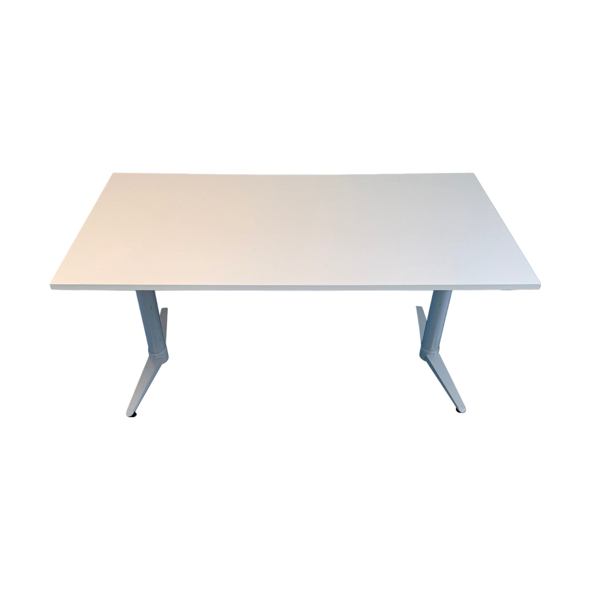 Skrivebordet er i god stand med noen merker på bordbeina, men bordplaten er fin og uten synlige skader. Den solide konstruksjonen sikrer stabilitet, og skrivebordet vil fungere utmerket som en del av et produktivt arbeidsmiljø.