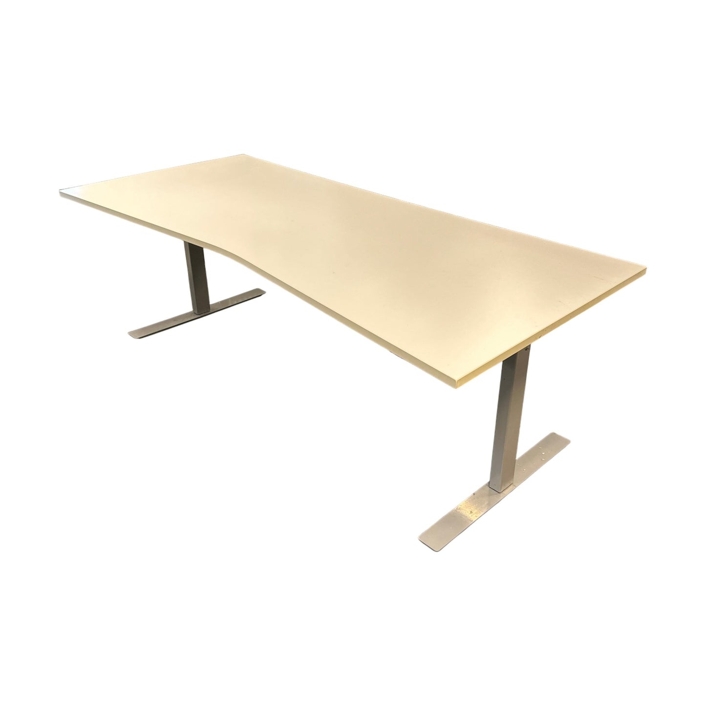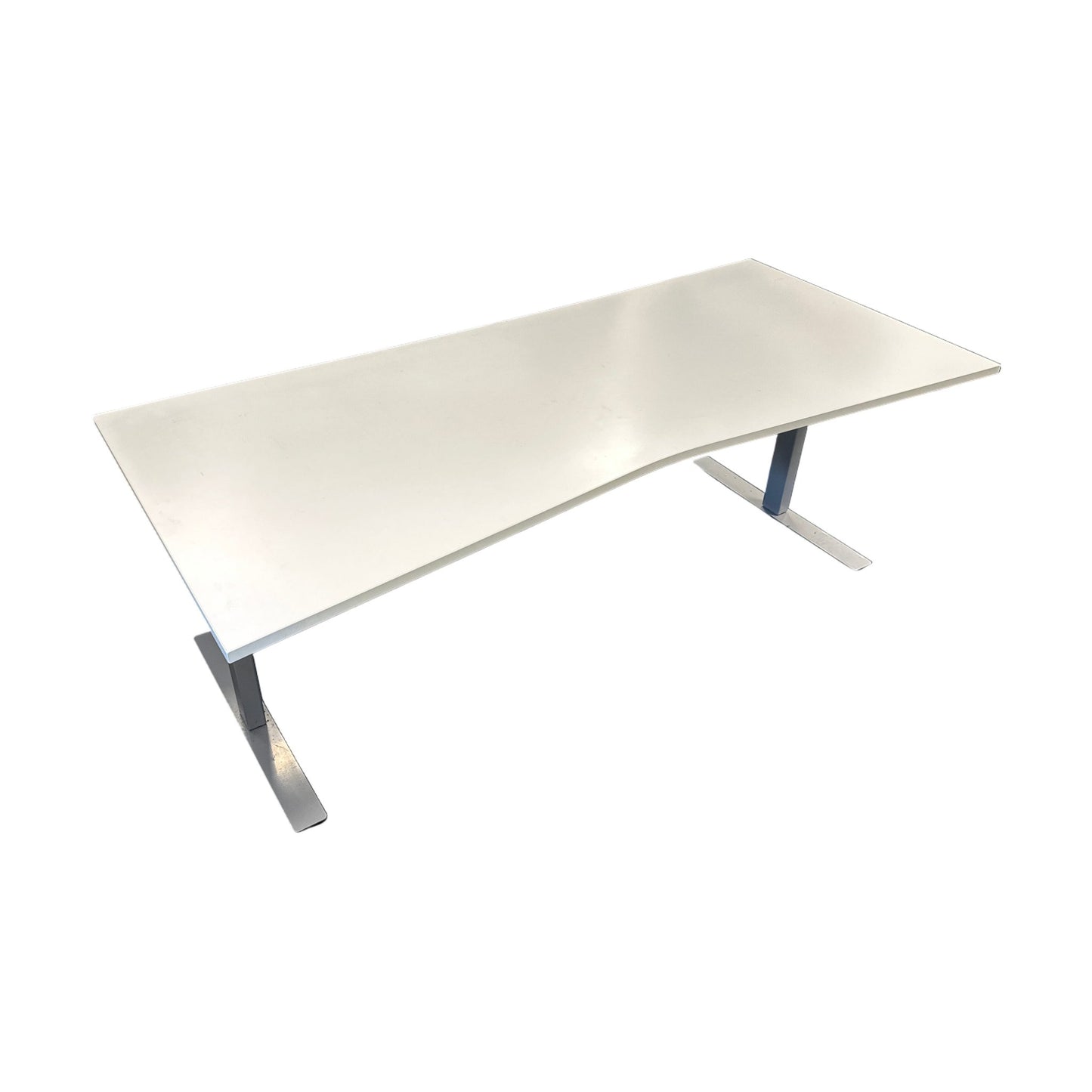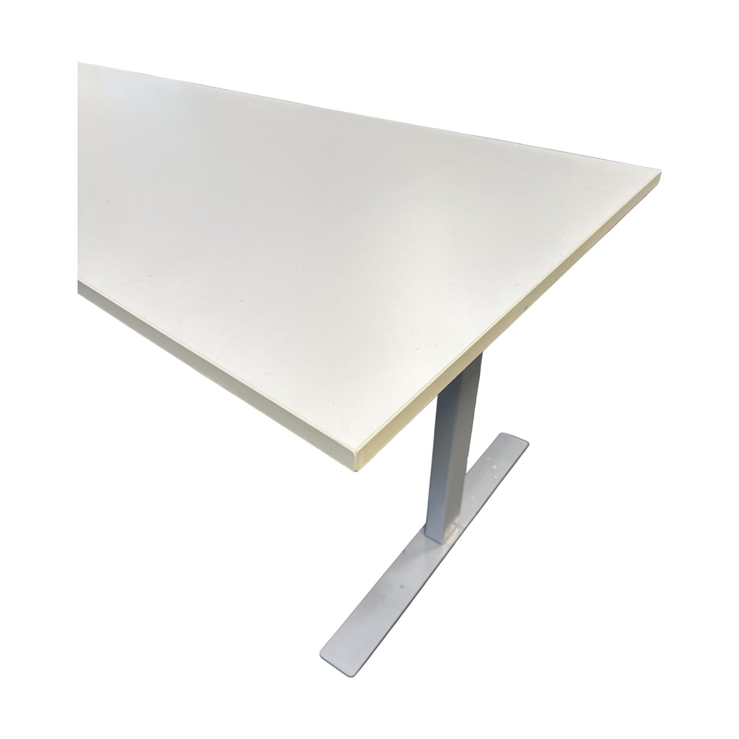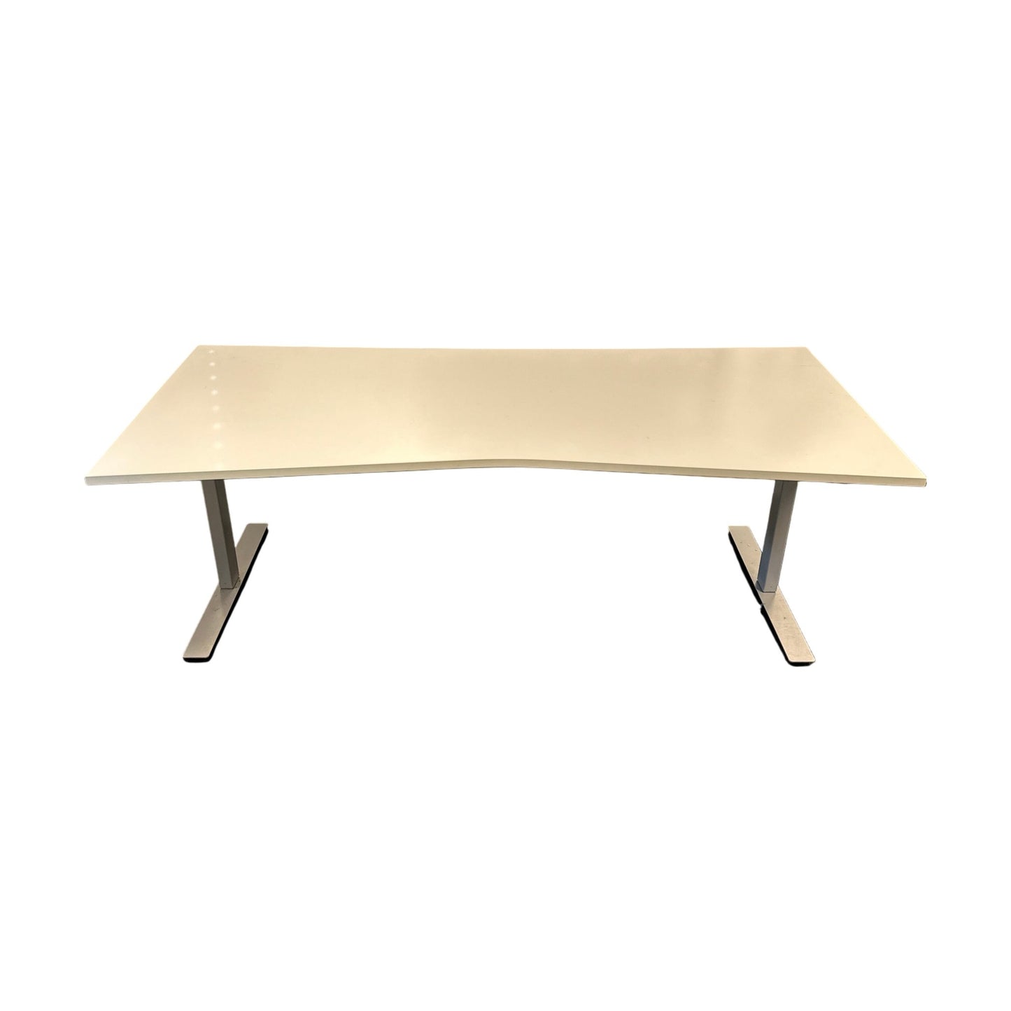 Elektrisk hev/senk skrivebord med en stilren hvit bordplate og en ergonomisk magebue som gir optimal komfort under arbeidet. Dette skrivebordet kombinerer moderne design med funksjonalitet, og passer perfekt for et effektivt arbeidsmiljø. Justerbar høyde gjør det enkelt å tilpasse arbeidsstillingen din.