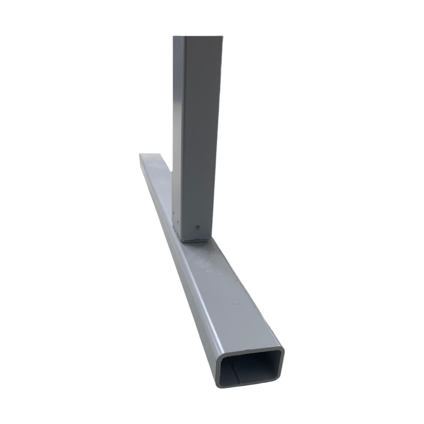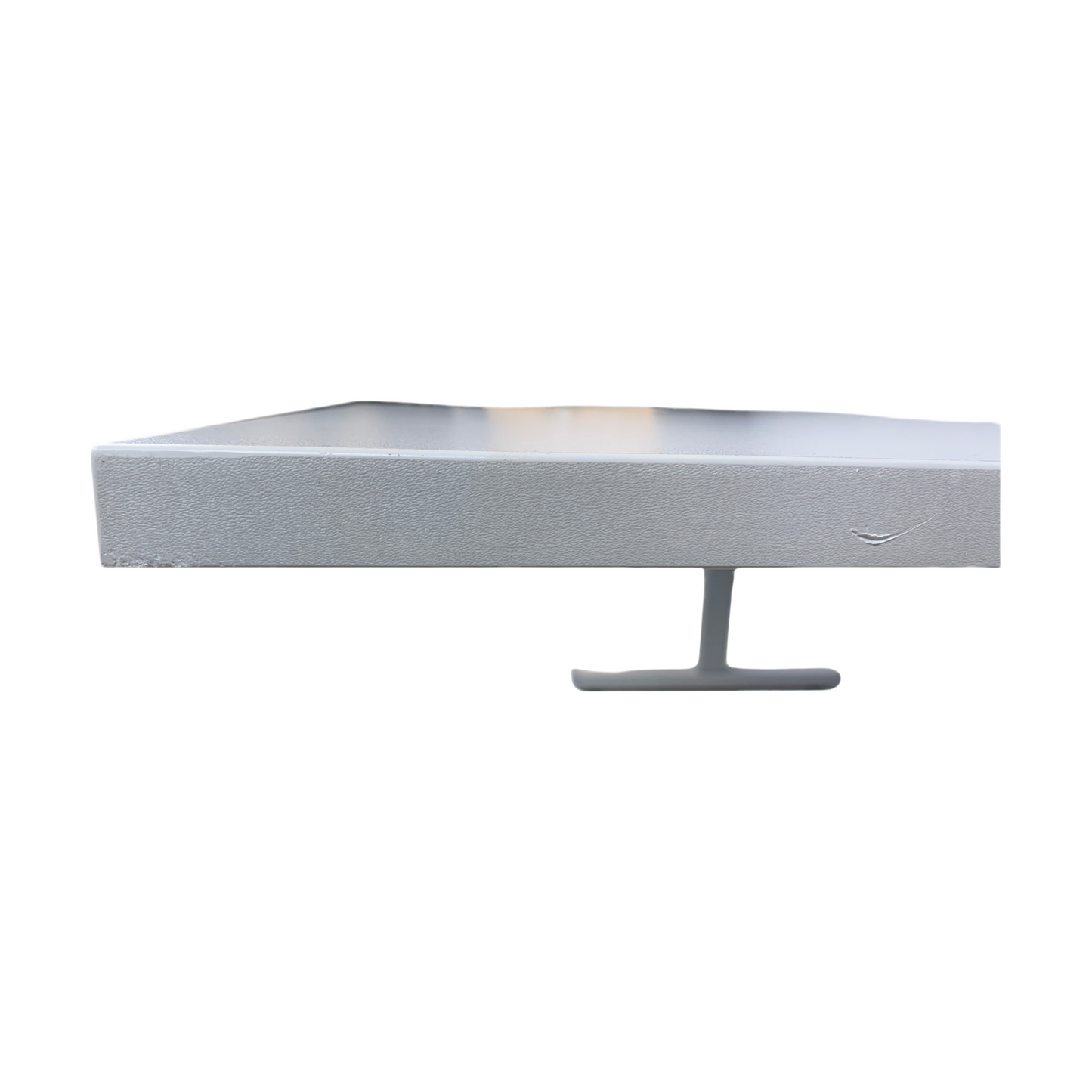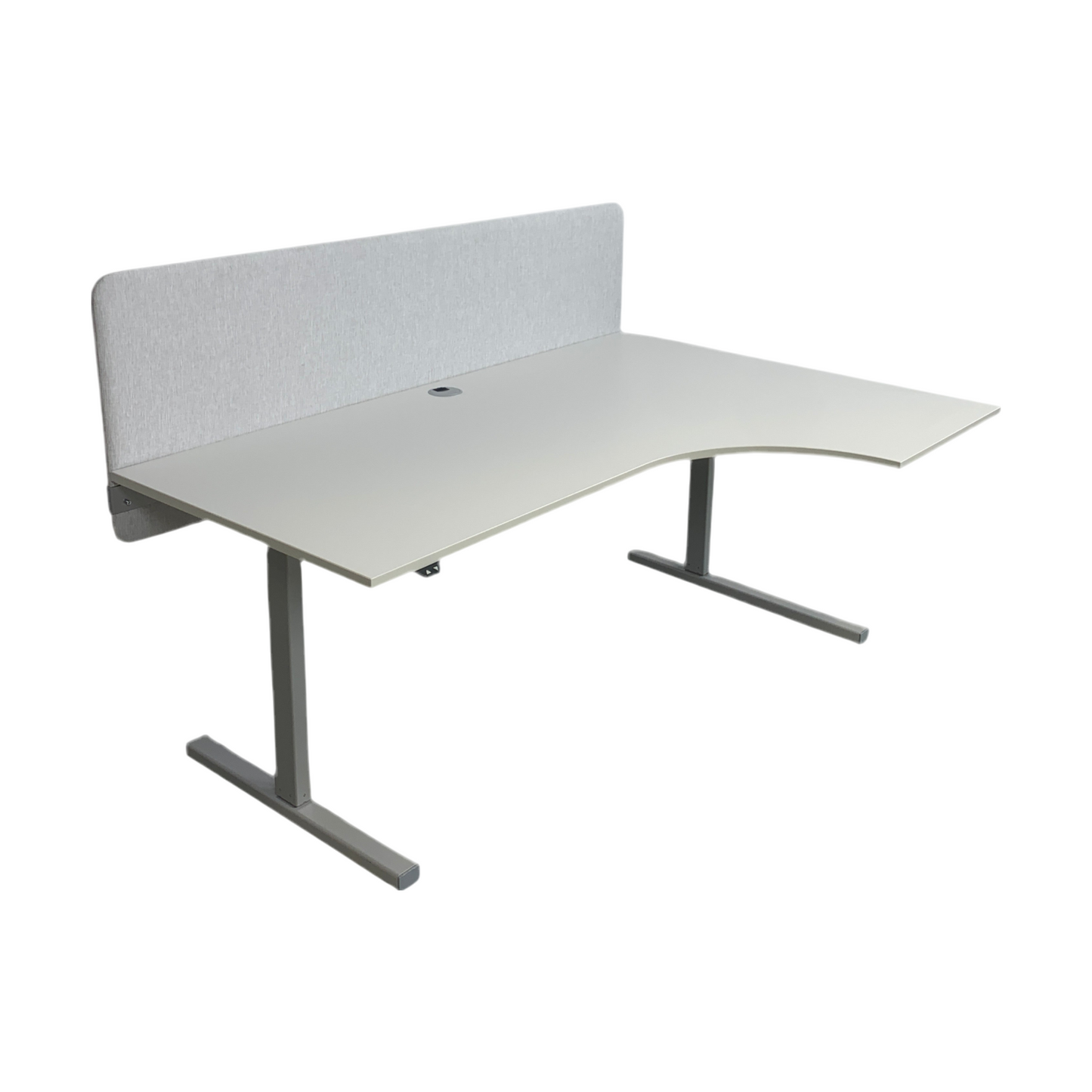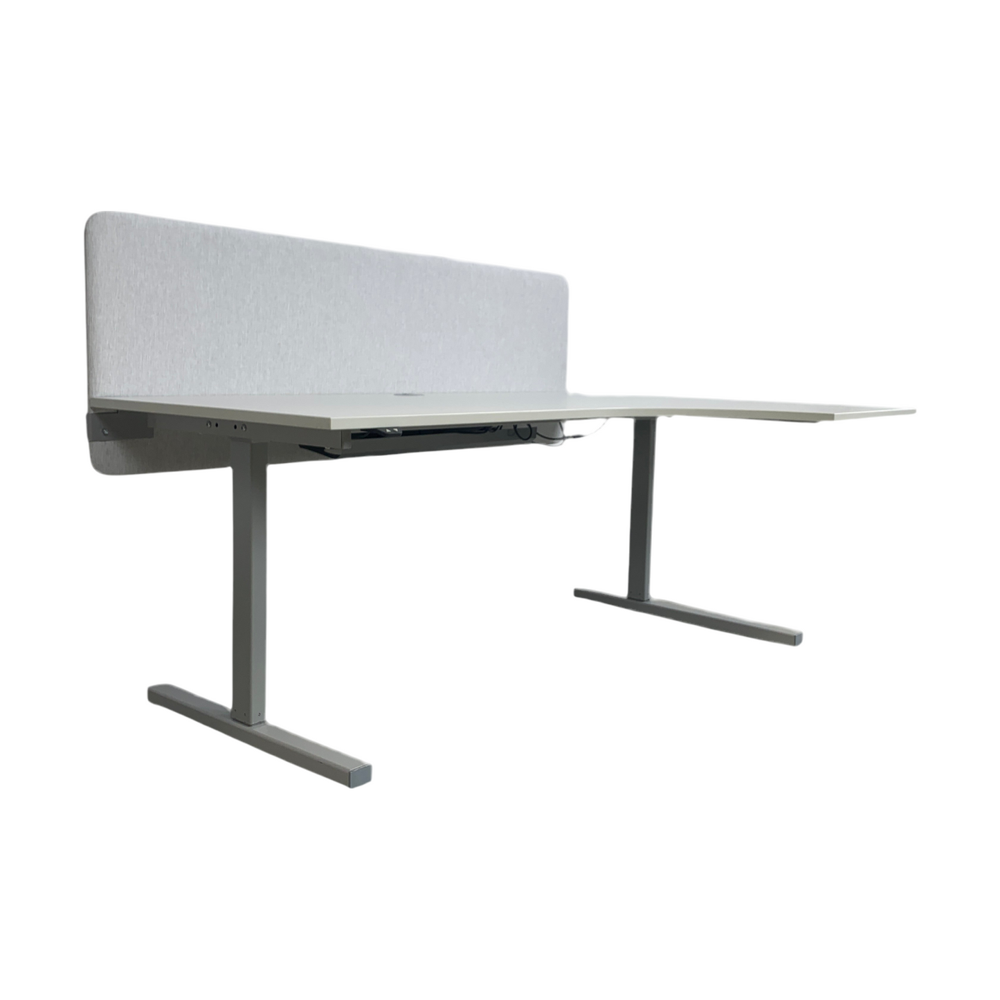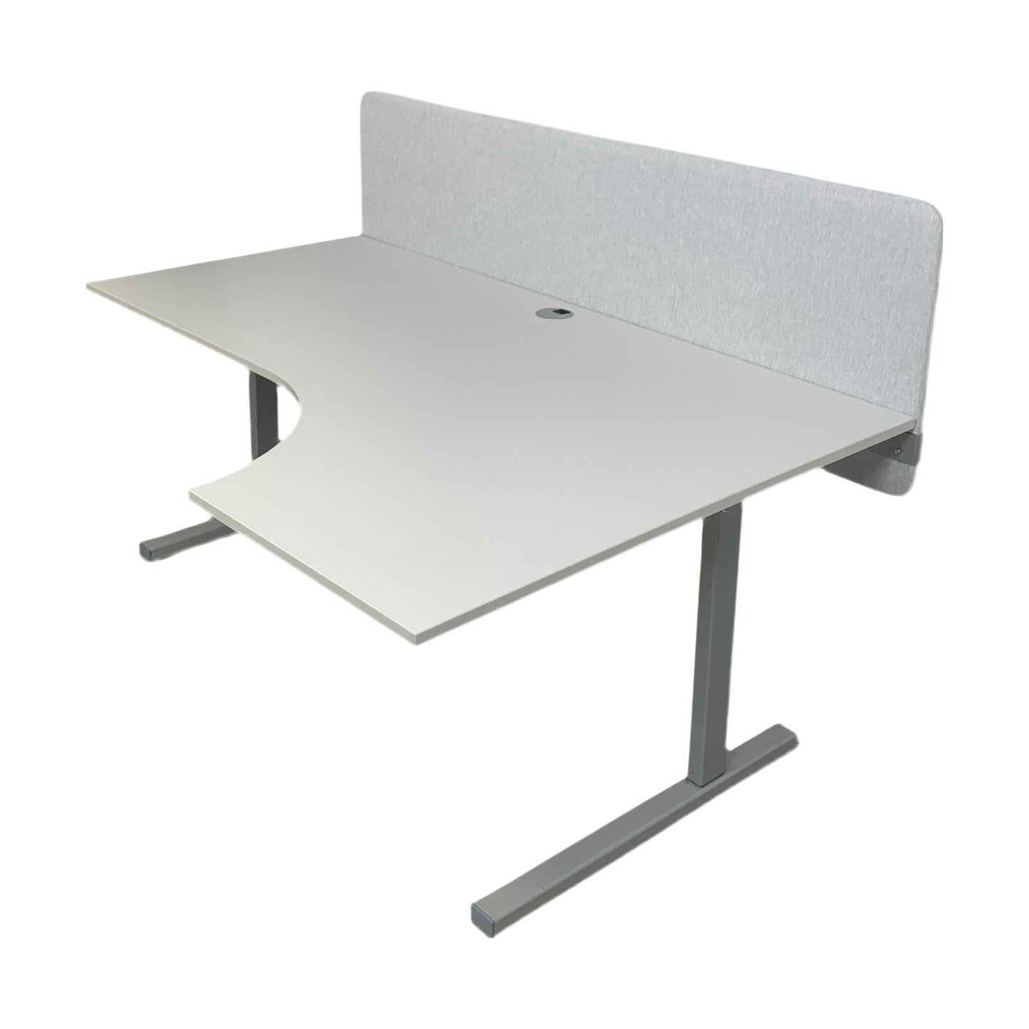 Skrivebordet er i god stand med et svakt bruksmerke på høyre side og mangler fotdekket bak på høyre side, men dette er ikke vesentlig merkbart. Den grå fargen på bordplaten og skilleveggen gir et stilrent og profesjonelt uttrykk som passer inn i et moderne kontormiljø.