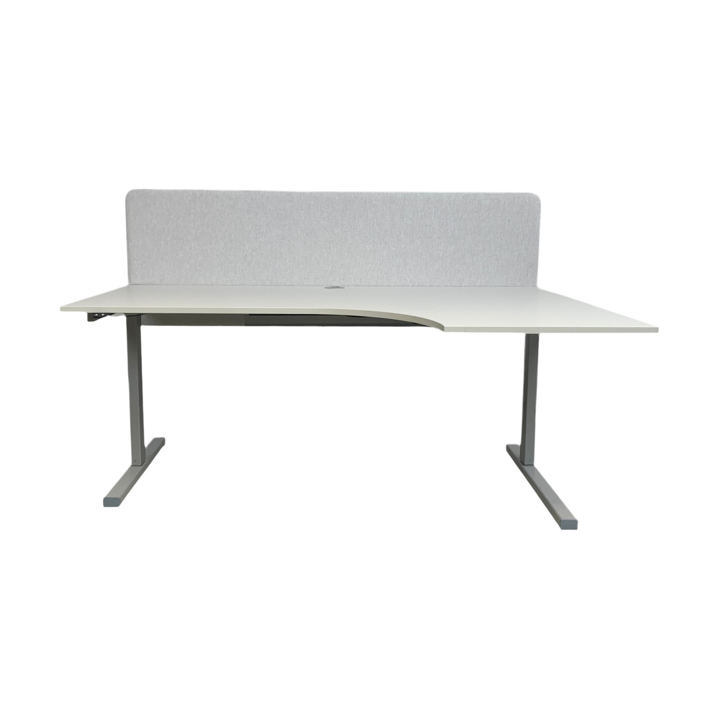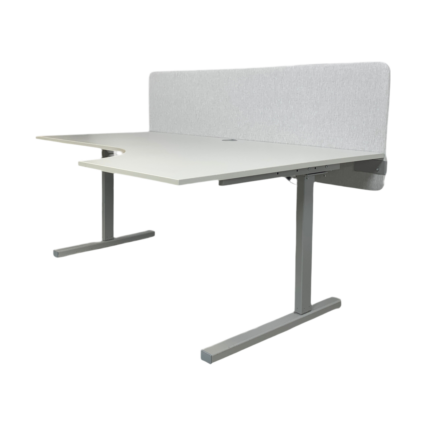 Elektrisk hev/senk skrivebord med høyrehjørne og stilren bordskillevegg. Det er designet for å gi et moderne og funksjonelt arbeidsområde, med mulighet for justering av høyden fra 114 til 163.5 cm, noe som gir god ergonomi ved både sitting og ståing.