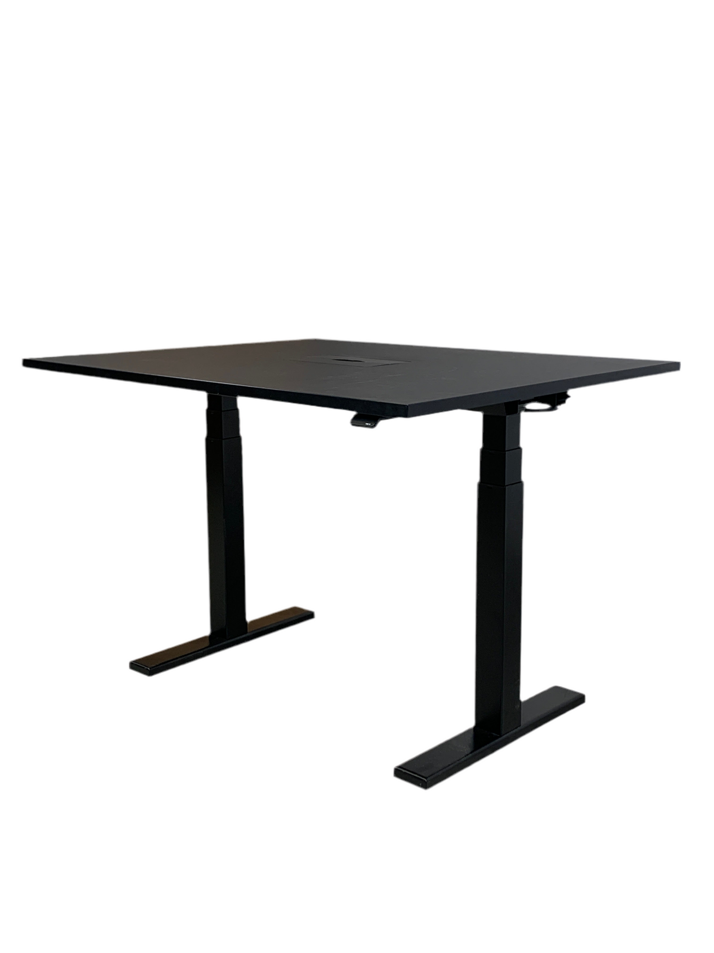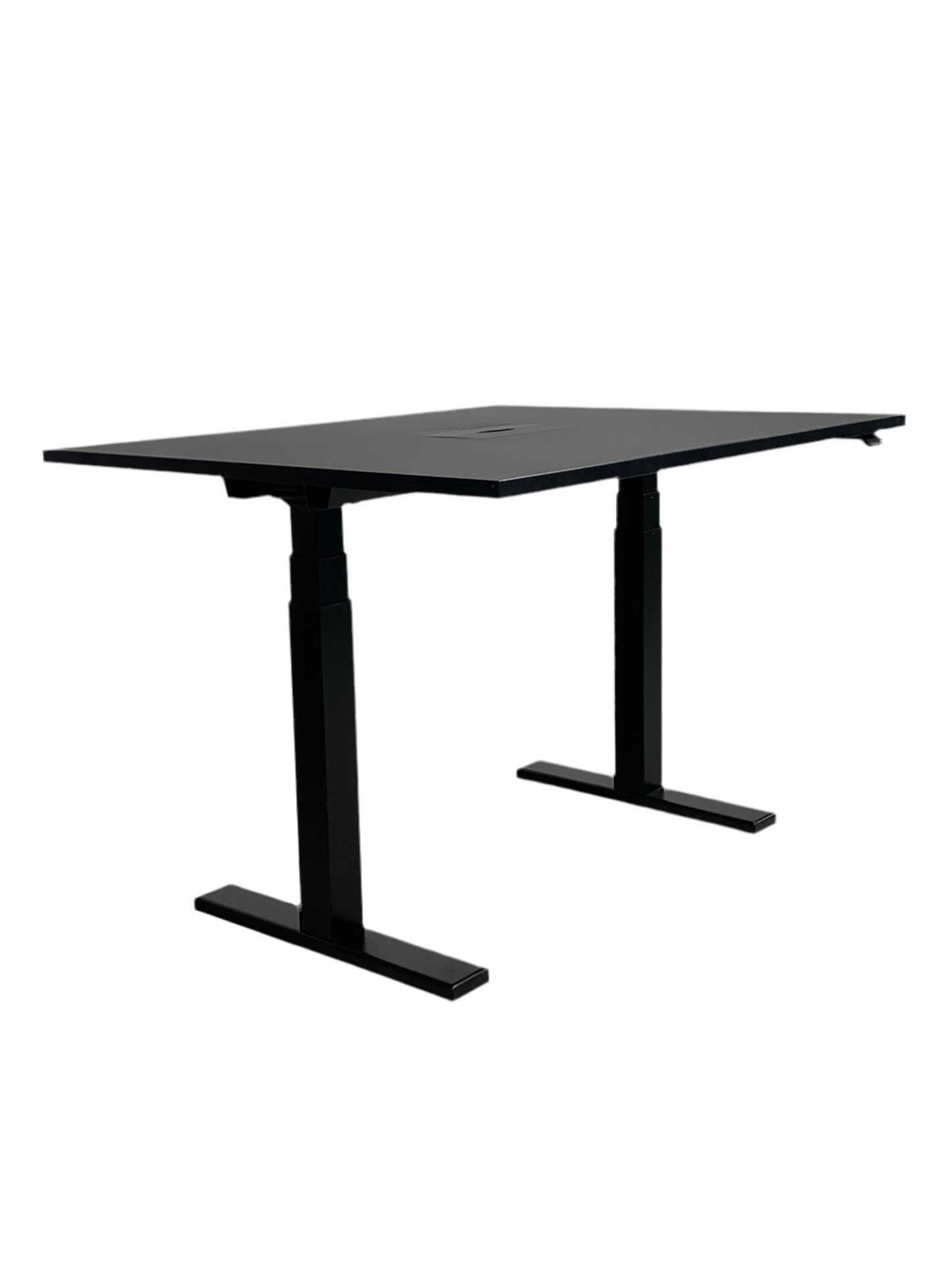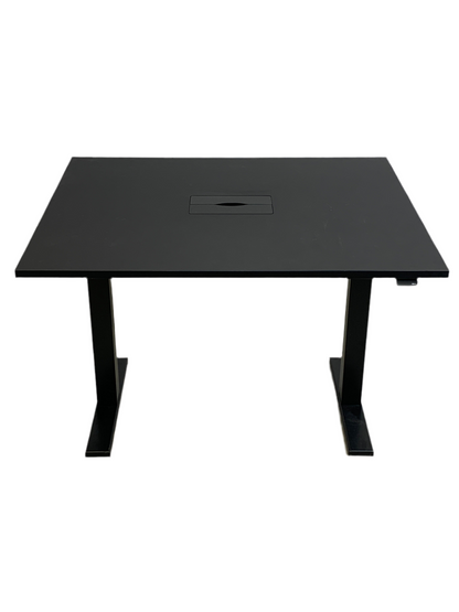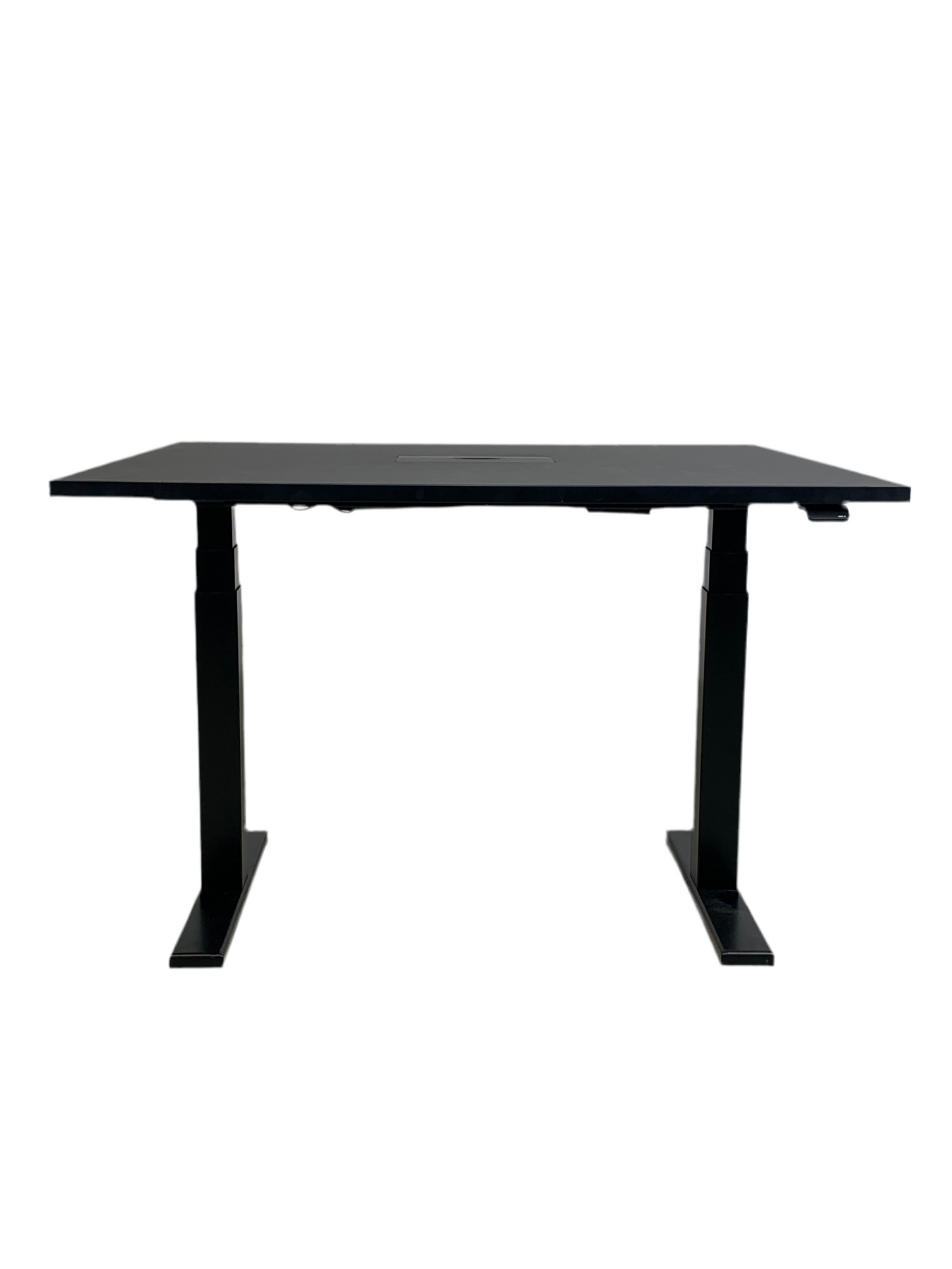 Elektrisk hev/senk skrivebord med en moderne svart bordplate og stabil stålramme. Skrivebordet inkluderer en praktisk kabelluke for enkel kabelhåndtering, noe som gir et ryddig arbeidsmiljø. Det har en justerbar høyde, noe som gjør det ideelt for både sittende og stående arbeidsstillinger.