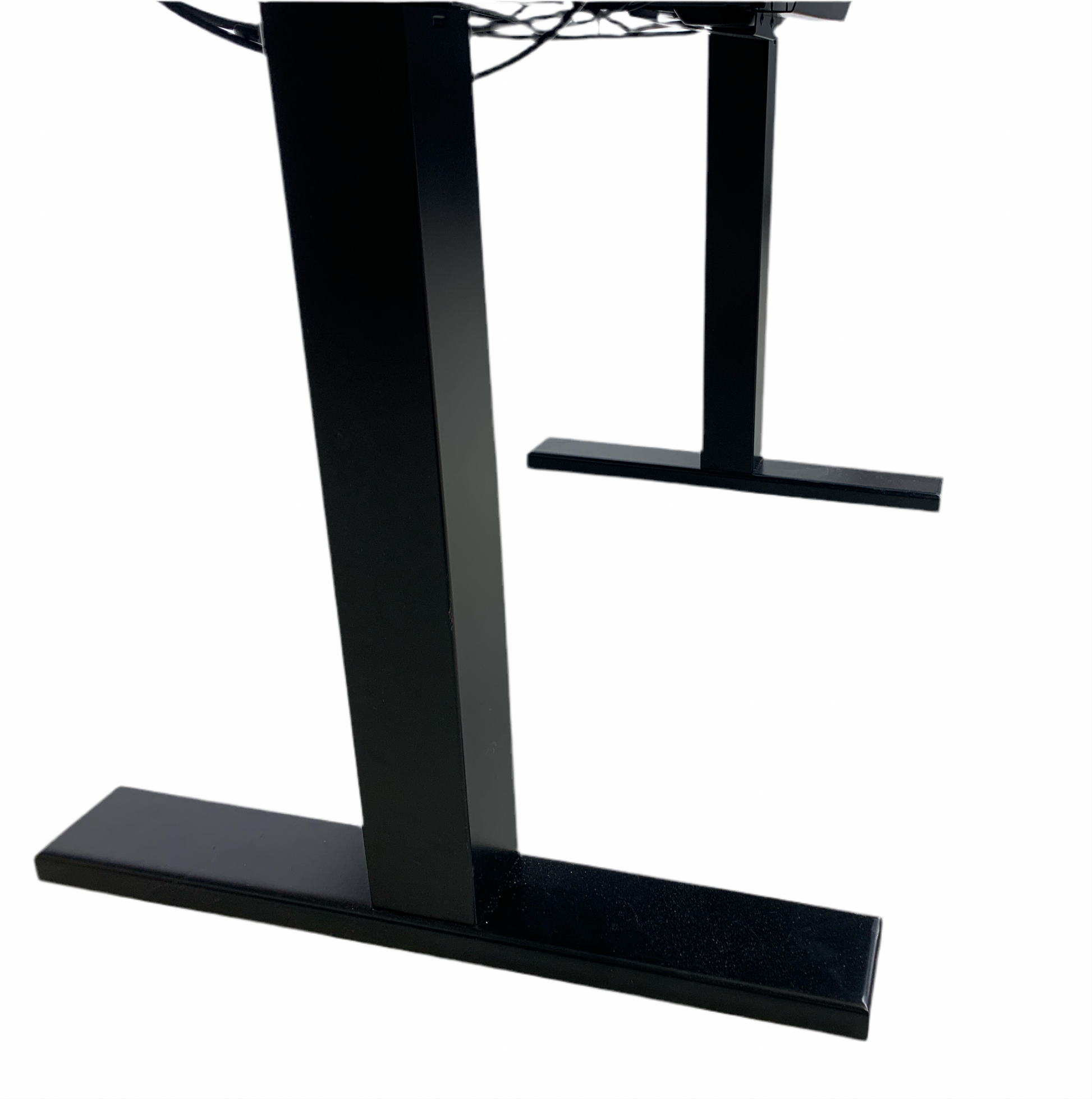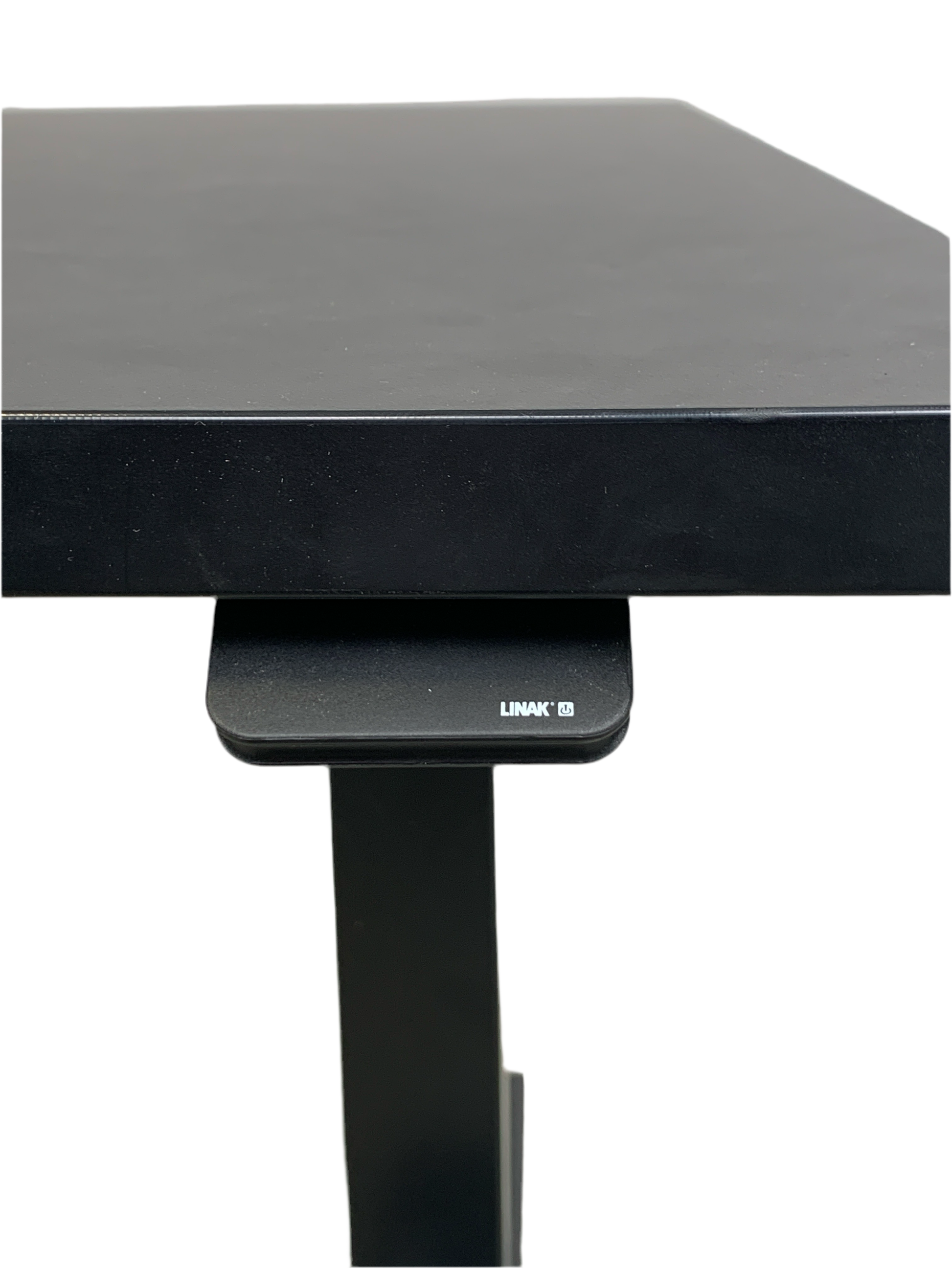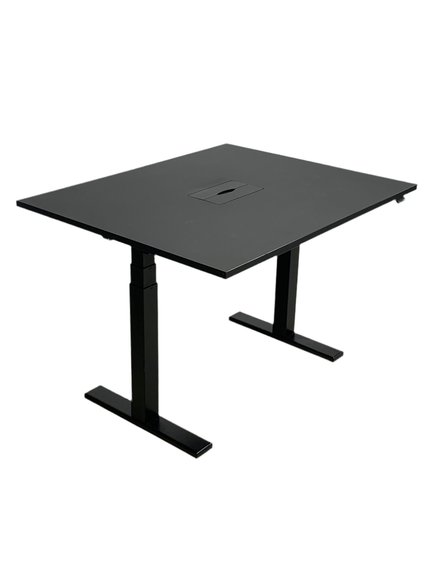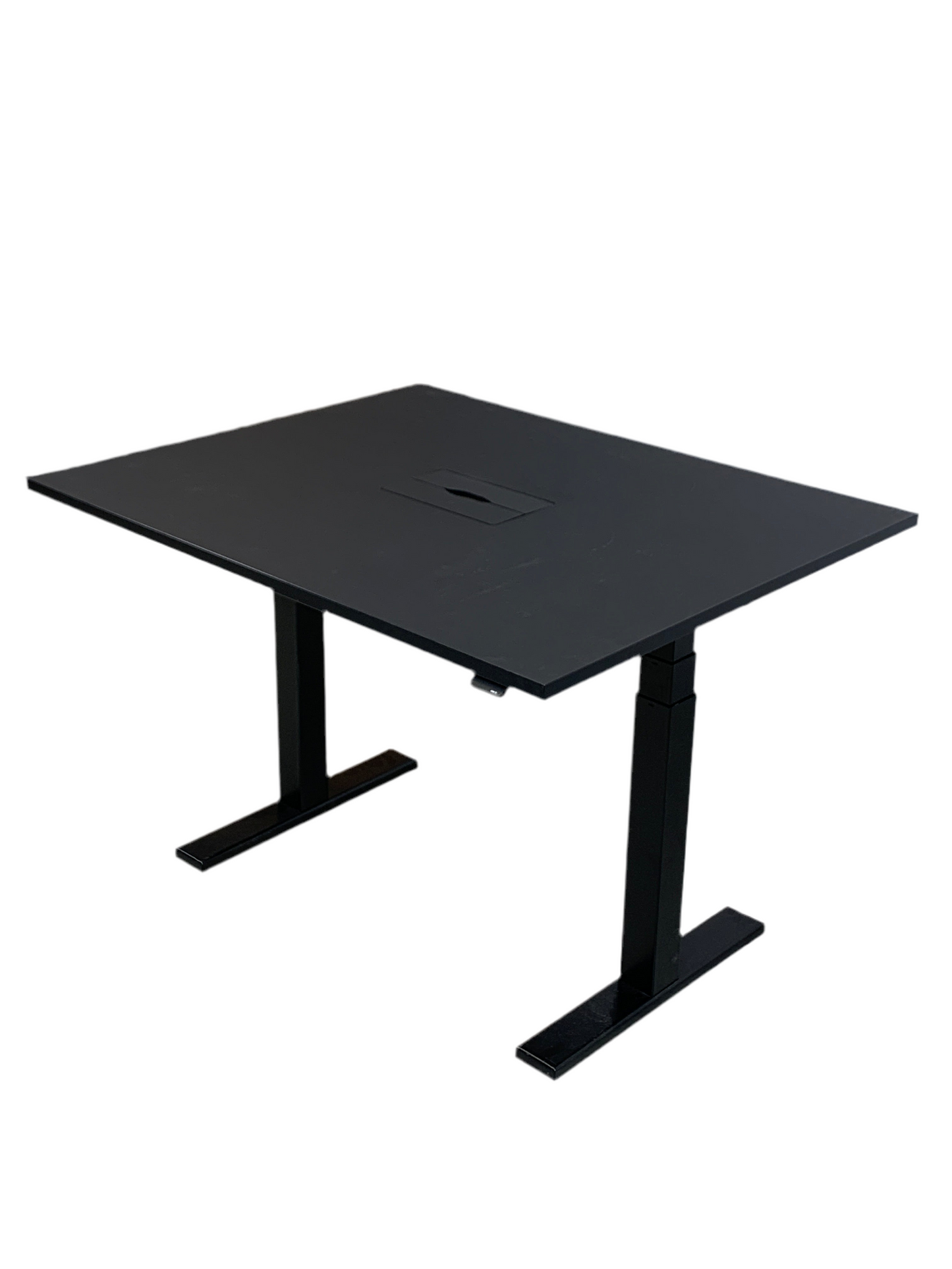 Elektrisk hev/senk skrivebord med en moderne svart bordplate og stabil stålramme. Skrivebordet inkluderer en praktisk kabelluke for enkel kabelhåndtering, noe som gir et ryddig arbeidsmiljø. Det har en justerbar høyde, noe som gjør det ideelt for både sittende og stående arbeidsstillinger.