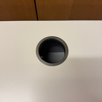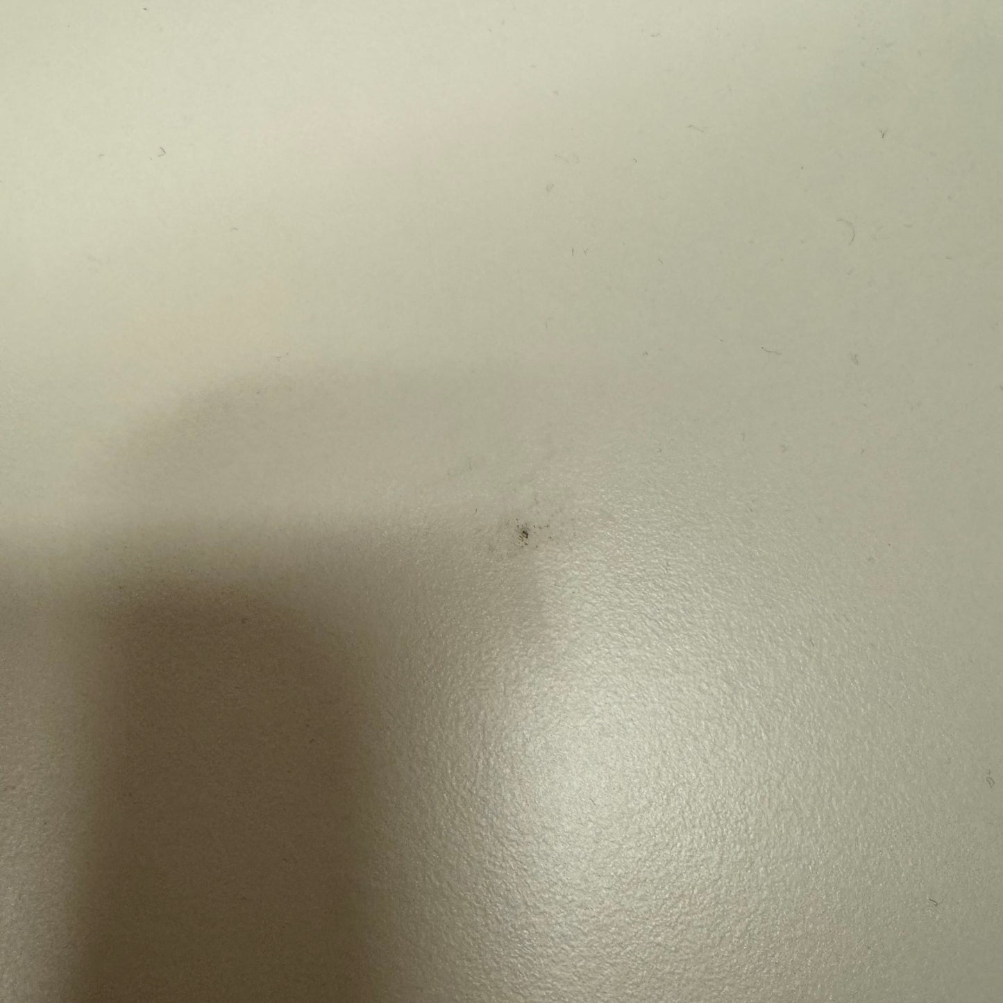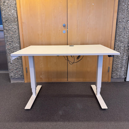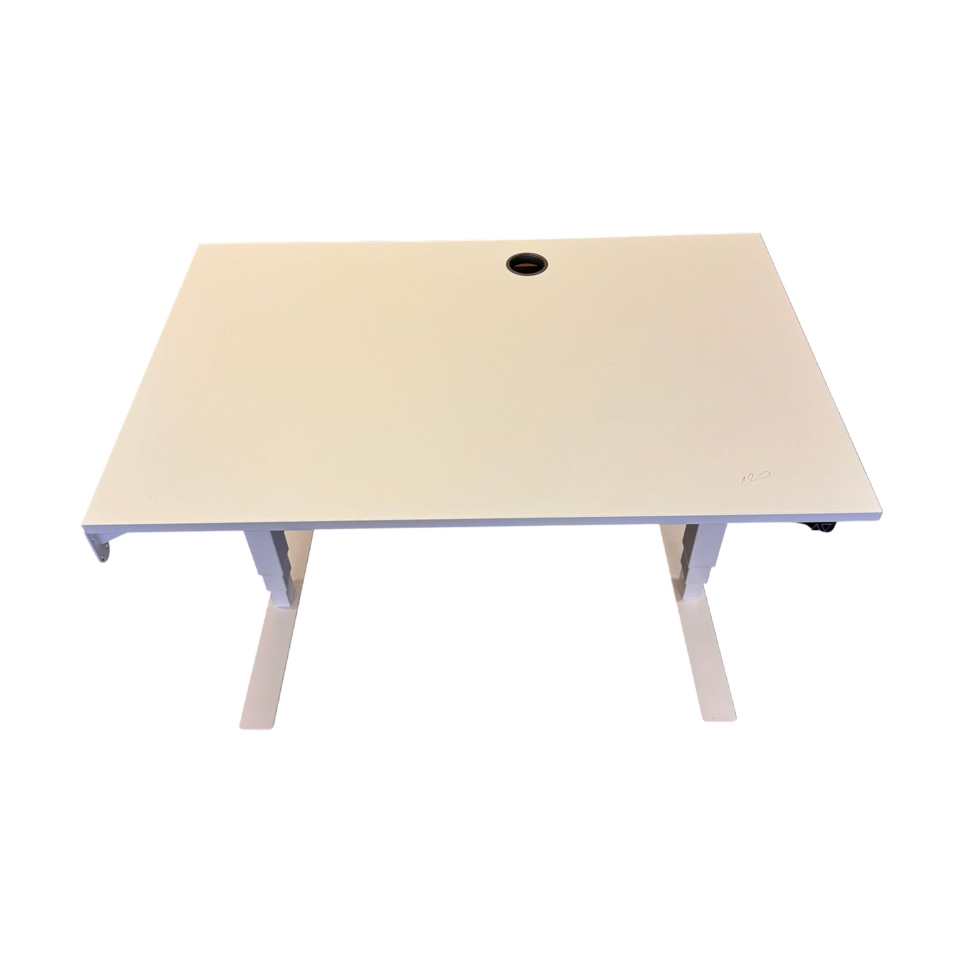 Skrivebordet er i god stand, men har noen mindre merker på bordplaten som ikke påvirker bruken. Den elektriske mekanismen fungerer som den skal, og gir en smidig justering av høyden.