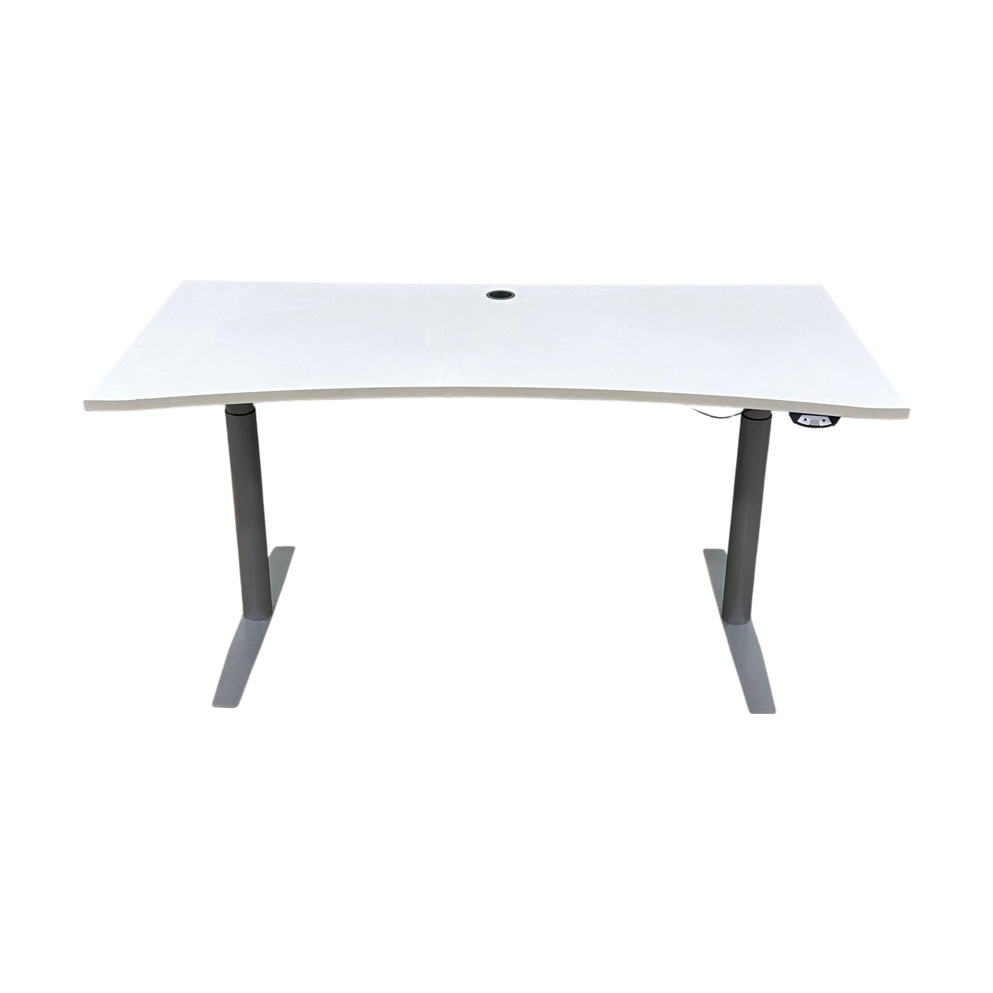 Dette elektriske hev/senk skrivebordet har en romslig hvit laminatbordplate og er utstyrt med magebue og kabelhull for bedre organisering av arbeidssonen. Det gir mulighet for justering av høyden, som sikrer en ergonomisk arbeidsstilling både i sittende og stående stilling, ideelt for å forbedre arbeidskomforten gjennom hele dagen.