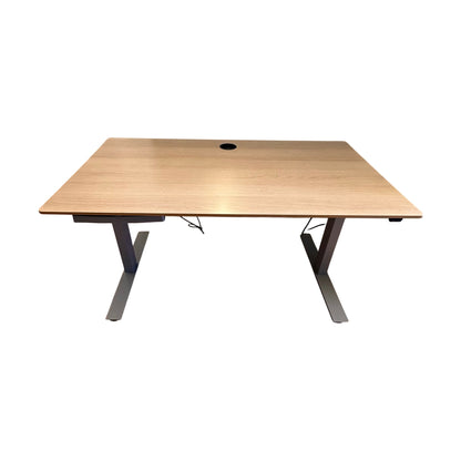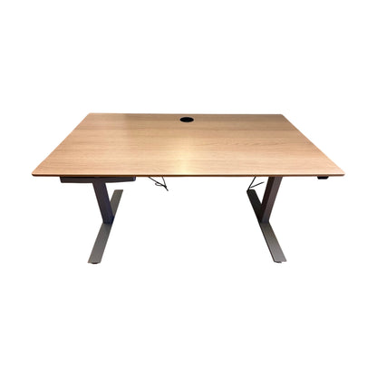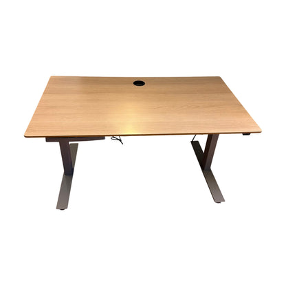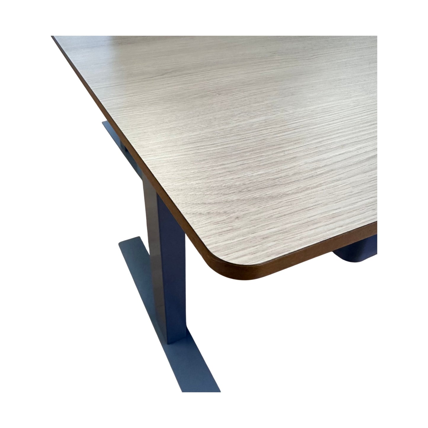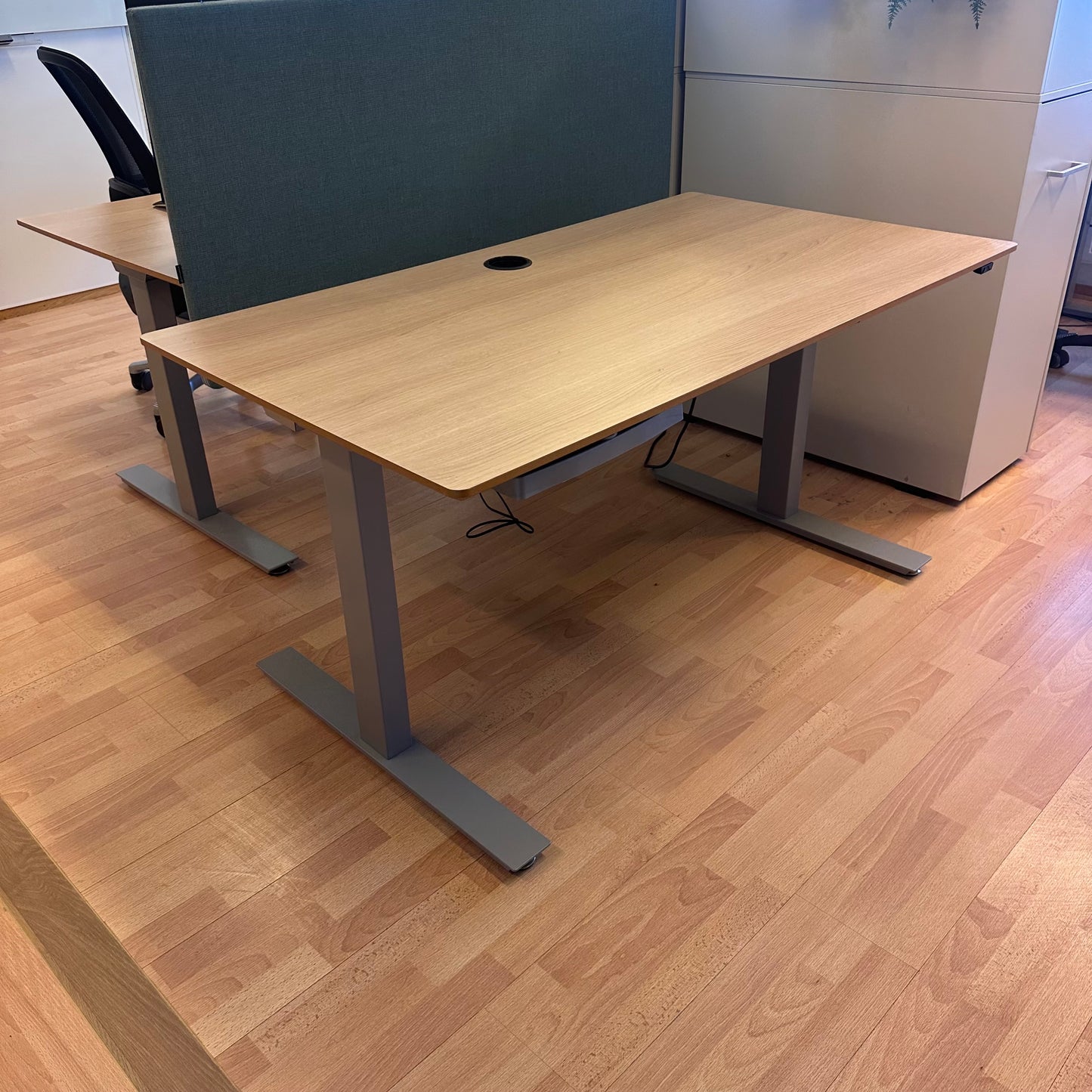 Elektrisk hev/senk skrivebord med en moderne trefarget bordplate i laminat og stilrene stålben. Dette skrivebordet kombinerer funksjonalitet med et minimalistisk design, og gir et behagelig arbeidsområde for både sittende og stående arbeid. Med sitt elegante uttrykk passer det perfekt inn i enhver kontorstil.