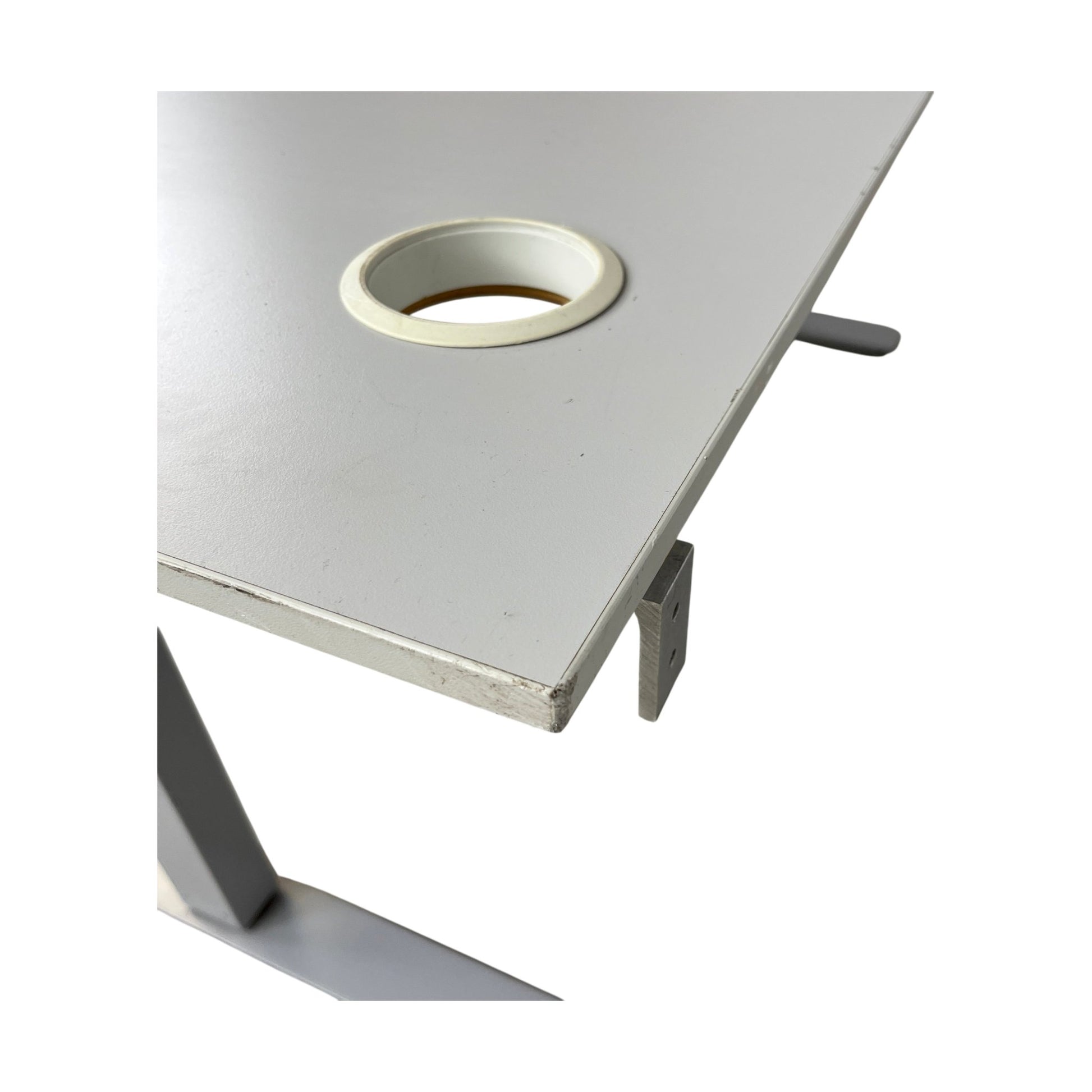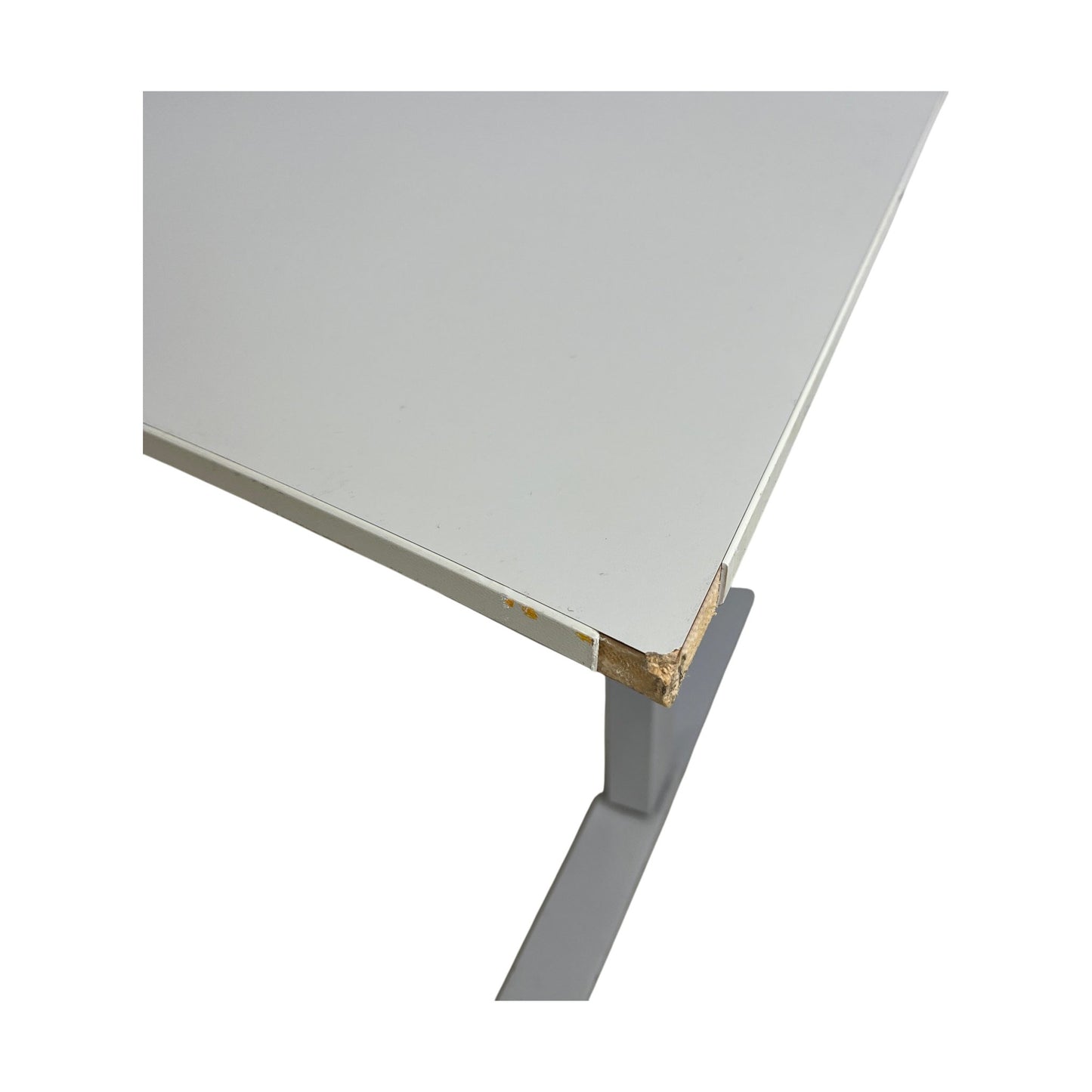 Skrivebordet har noen store skader på kantene og enkelte merker på overflaten, men disse påvirker ikke funksjonalitet. Det er fortsatt en praktisk løsning for kontoret ditt.