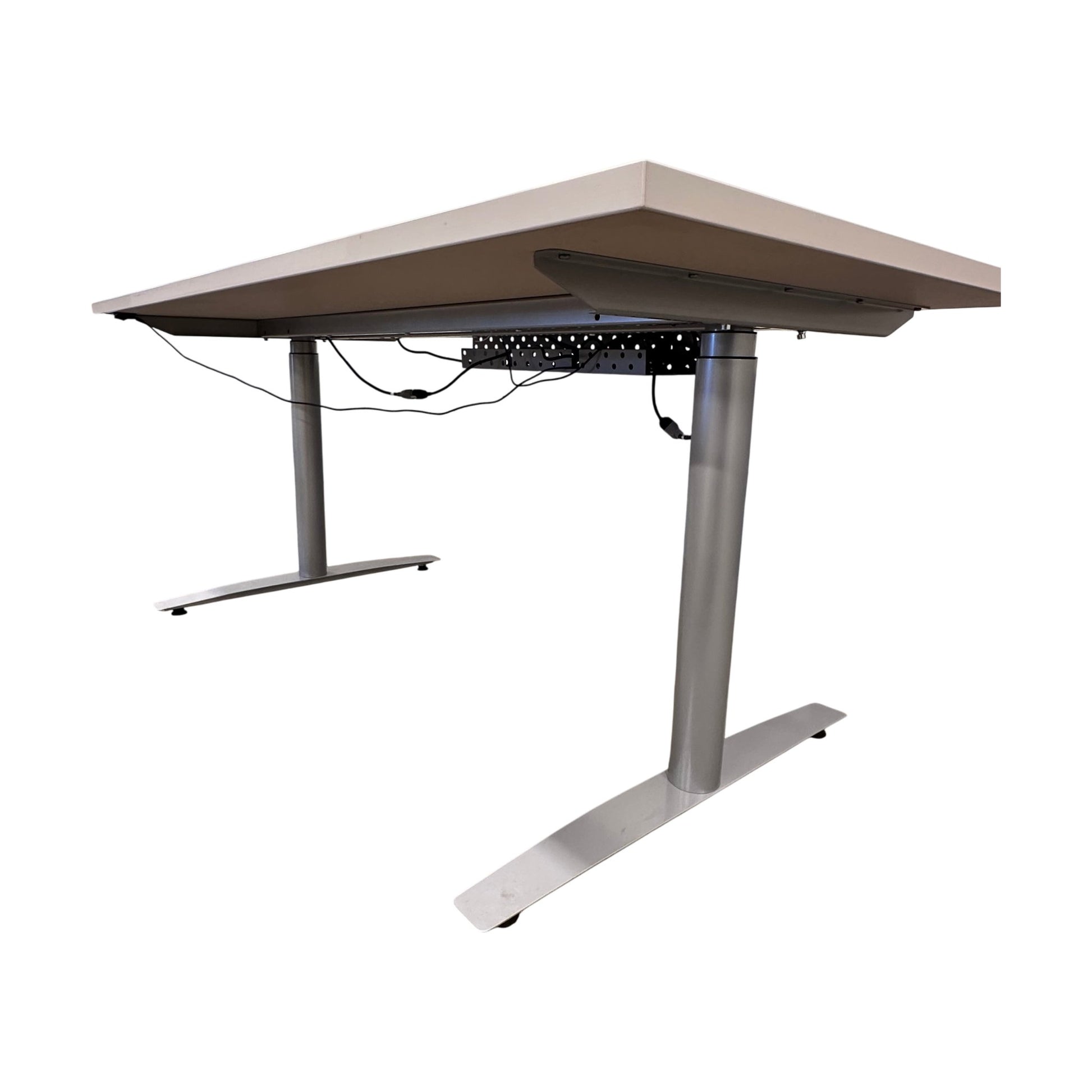 Elektrisk hev/senk skrivebord med en romslig beige bordplate som gir god plass til arbeidsutstyr. Den justerbare høyden lar brukeren enkelt tilpasse arbeidsstillingen, noe som bidrar til bedre ergonomi i løpet av dagen.