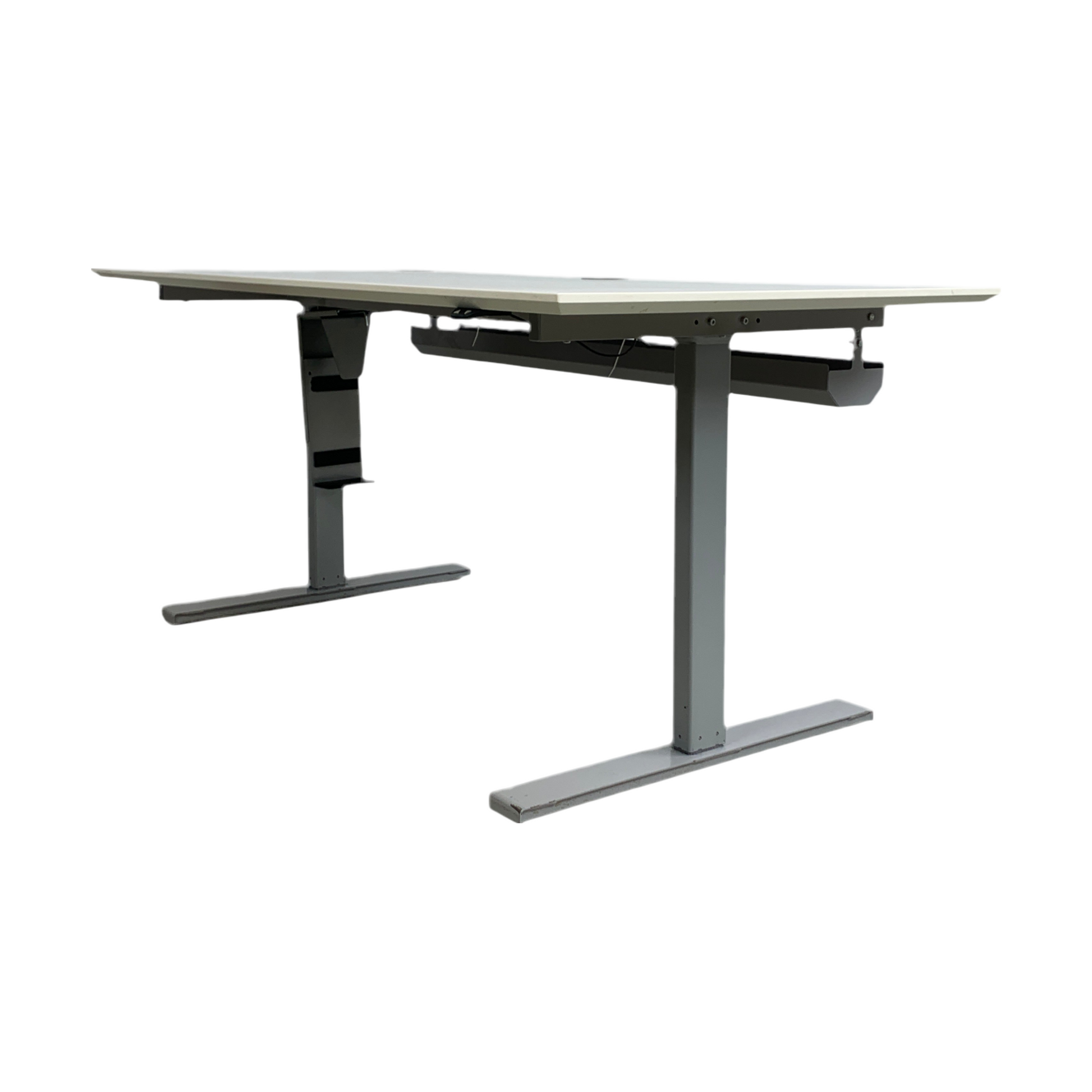 Elektrisk hev/senk skrivebord med en stilren hvit laminatbordplate og en solid sølvgrå stålramme. Utstyrt med to kabelhull, gir dette skrivebordet en organisert arbeidsplass, samtidig som det tilbyr justerbar høyde for både sittende og stående arbeid. Den romslige overflaten på 160x80 cm gjør det enkelt å tilpasse kontorutstyret ditt.