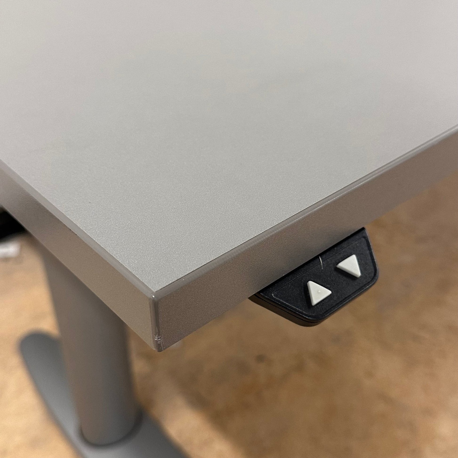 Elektrisk hev/senk skrivebord med en stilren grå bordplate og solid støtte, tilpasset for fleksibel arbeidsstilling. Med høydejustering kan skrivebordet enkelt tilpasses fra 70 cm til 120 cm, noe som forbedrer ergonomien i din arbeidshverdag.