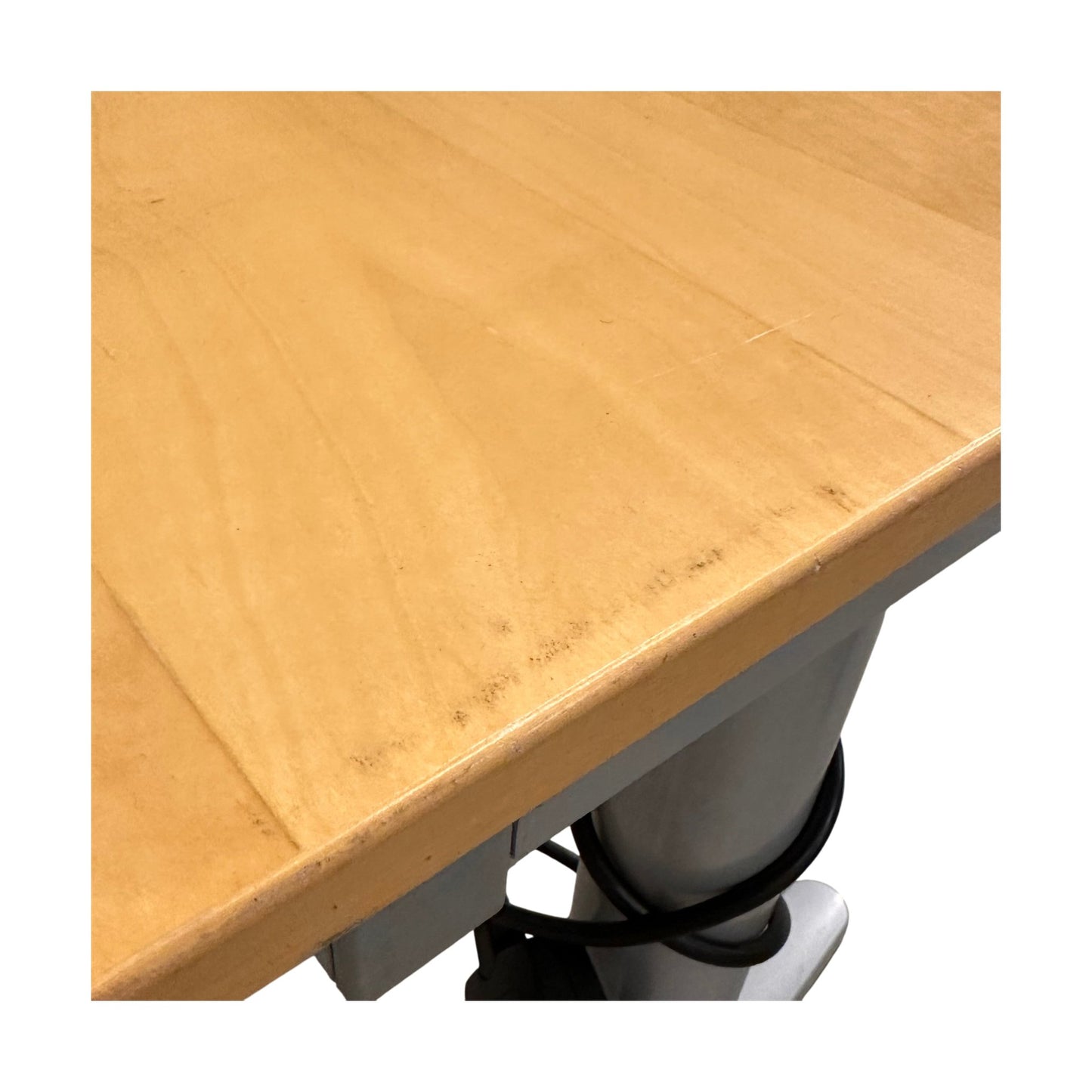 Dette skrivebordet er i god stand med minimale bruksmerker. Bordplaten er nesten uten riper, og rammen er solid og stabil. Hev/senk-funksjonen fungerer utmerket og gir deg mulighet til å tilpasse arbeidsstillingen komfortabelt.